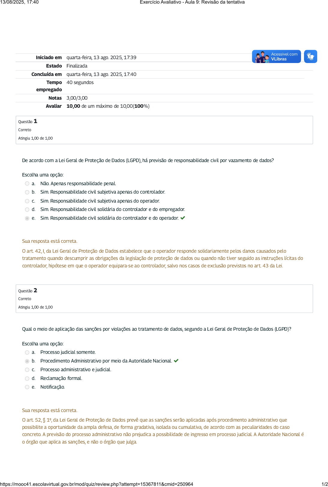Iniciado em quarta-feira, 13 ago. 2025, 17:39 Estado Finalizada Concluída em quarta-feira, 13 ago. 2025, 17:40 Tempo empregado 40 segundos Notas 3,00/3,00 Avaliar 10,00 de um máximo de 10,00(100%) Questão 1 Correto Atingiu 1,00 de 1,00 Questão 2 Correto Atingiu 1,00 de 1,00 De acordo com a Lei Geral de Proteção de Dados (LGPD), há previsão de responsabilidade civil por vazamento de dados? Escolha uma opção: a. Não. Apenas responsabilidade penal. b. Sim. Responsabilidade civil subjetiva apenas do controlador. c. Sim. Responsabilidade civil subjetiva apenas do operador. d. Sim. Responsabilidade civil solidária do controlador e do empregador. e. Sim. Responsabilidade civil solidária do controlador e do operador. Sua resposta está correta. O art. 42, I, da Lei Geral de Proteção de Dados estabelece que o operador responde solidariamente pelos danos causados pelo tratamento quando descumprir as obrigações da legislação de proteção de dados ou quando não tiver seguido as instruções lícitas do controlador, hipótese em que o operador equipara-se ao controlador, salvo nos casos de exclusão previstos no art. 43 da Lei. Qual o meio de aplicação das sanções por violações ao tratamento de dados, segundo a Lei Geral de Proteção de Dados (LGPD)? Escolha uma opção: a. Processo judicial somente. b. Procedimento Administrativo por meio da Autoridade Nacional. c. Processo administrativo e judicial. d. Reclamação formal. e. Notificação. Sua resposta está correta. O art. 52, § 1º, da Lei Geral de Proteção de Dados prevê que as sanções serão aplicadas após procedimento administrativo que possibilite a oportunidade da ampla defesa, de forma gradativa, isolada ou cumulativa, de acordo com as peculiaridades do caso concreto. A previsão do processo administrativo não prejudica a possibilidade de ingresso em processo judicial. A Autoridade Nacional é o órgão que aplica as sanções, e não o órgão que julga. 13/08/2025, 17:40 Exercício Avaliativo - Aula 9: Revisão da tentativa https://mooc41.escolavirtual.gov.br/mod/quiz/review.php?attempt=15367811&cmid=250964 1/2 Questão 3 Correto Atingiu 1,00 de 1,00 Sobre as possíveis sanções por infrações à Lei Geral de Proteção de Dados (LGPD), assinale a única alternativa correta: Escolha uma opção: a. Quem aplica as sanções administrativas é a Autoridade Nacional. b. A multa simples e a multa diária não se encontram no rol de possíveis sanções aplicáveis pela Administração. c. As sanções serão aplicadas sem a existência processo administrativo prévio. d. As sanções serão aplicadas em face do titular dos dados, e não do controlador deles. e. A pronta adoção de medidas corretivas não é critério nem parâmetro para a aplicação de sanções. Sua resposta está correta. Conforme determinado pelo caput do art. 52 da Lei Geral de Proteção de Dados (LGPD), quem aplica as sanções é a Autoridade Nacional. 13/08/2025, 17:40 Exercício Avaliativo - Aula 9: Revisão da tentativa https://mooc41.escolavirtual.gov.br/mod/quiz/review.php?attempt=15367811&cmid=250964 2/2