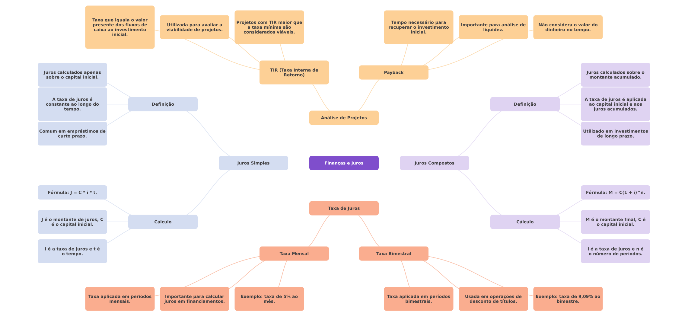 Taxa que iguala valor presente dos fluxos de Utilizada para avaliar a Projetos com TIR maior que Tempo necessário para a taxa mínima são recuperar investimento Importante para análise de Não considera valor do caixa ao investimento viabilidade de projetos. considerados viáveis. inicial. liquidez. dinheiro no tempo. inicial. Juros calculados apenas TIR (Taxa Interna de Retorno) Payback Juros calculados sobre sobre capital inicial. montante acumulado. A taxa de juros é A taxa de juros é aplicada constante ao longo do Definição Definição ao capital inicial e aos tempo. juros acumulados. Análise de Projetos Comum em empréstimos de Utilizado em investimentos curto prazo. de longo prazo. Juros Simples Finanças e Juros Juros Compostos Fórmula: J = C*i*t. Fórmula: = C(1 + i)^n. Taxa de Juros J é montante de juros, Cálculo Cálculo é montante final, é capital inicial. capital inicial. a taxa de juros e ié a taxa de juros e n é tempo. Taxa Mensal Taxa Bimestral número de períodos. Taxa aplicada em períodos Importante para calcular Exemplo: taxa de 5% ao Taxa aplicada em períodos Usada em operações de Exemplo: taxa de 9,09% ao mensais. juros em financiamentos. mês. bimestrais. desconto de títulos. bimestre.