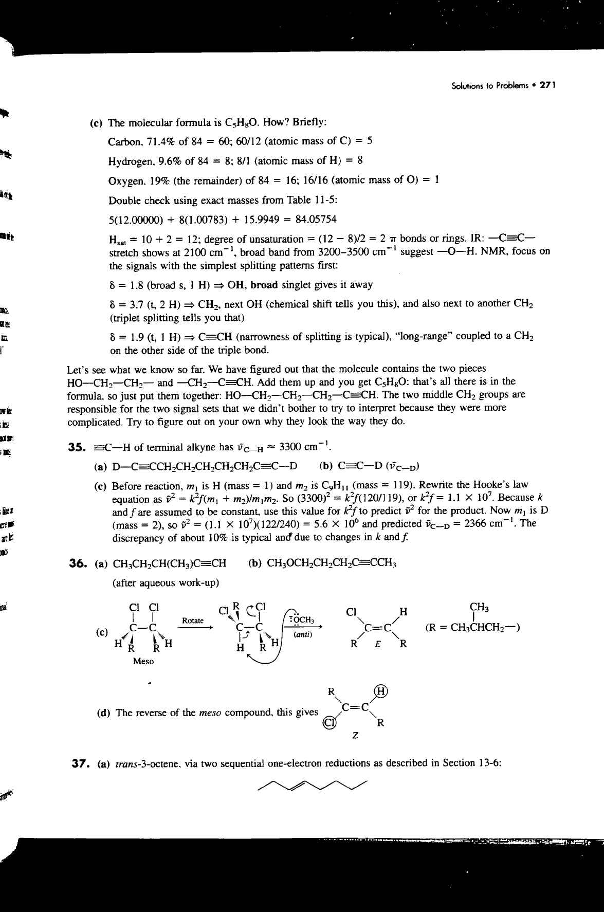 Solutions to Problems . 271 (c) The molecular formula is C₅H₈O. How? Briefly: Carbon. 71.4% of 84 = 60; 60/12 (atomic mass of C) = 5 Hydrogen. 9.6% of 84 = 8; 8/1 (atomic mass of H) = 8 Oxygen. 19% (the remainder) of 84 = 16; 16/16 (atomic mass of O) = 1 Double check using exact masses from Table 11-5: 5(12.00000) + 8(1.00783) + 15.9949 = 84.05754 = 10 + 2 = 12; degree of unsaturation = (12 8)/2 = 2 bonds or rings. IR: stretch shows at 2100 cm⁻¹, broad band from 3200-3500 cm⁻¹ suggest -0-H. NMR, focus on the signals with the simplest splitting patterns first: δ = 1.8 (broad 1 H) OH, broad singlet gives it away δ = 3.7 (t, 2 H) = CH₂, next OH (chemical shift tells you this), and also next to another CH₂ (triplet splitting tells you that) δ = 1.9 (t, 1 H) C=CH (narrowness of splitting is typical), "long-range" coupled to a CH₂ on the other side of the triple bond. Let's see what we know so far. We have figured out that the molecule contains the two pieces and Add them up and you get C₅H₈O: that's all there is in the so just put them together: The two middle CH₂ groups are responsible for the two signal sets that we didn't bother to try to interpret because they were more complicated. Try to figure out on your own why they look the way they do. 35. =C-H of terminal alkyne has ≈ 3300 cm⁻¹. (a) (b) C=C-D (c) Before reaction, m₁ is H (mass = 1) and m₂ is C₉H₁₁ (mass = 119). Rewrite the Hooke's law equation as v² = + So = k²f(120/119), or = 1.1 X 10⁷. Because k and f are assumed to be constant, use this value for to predict v² for the product. Now m₁ is D (mass = 2), so v² = (1.1 X = 5.6 X 10⁶ and predicted = 2366 cm⁻¹. The discrepancy of about 10% is typical and due to changes in k and f. 36. (a) (b) (after aqueous work-up) R Cl H CH₃ Rotate C-C (c) (R = (anti) H H H R R H R R E R Meso R H (d) The reverse of the meso compound, this gives R Z 37. (a) trans-3-octene, via two sequential one-electron reductions as described in Section 13-6:
