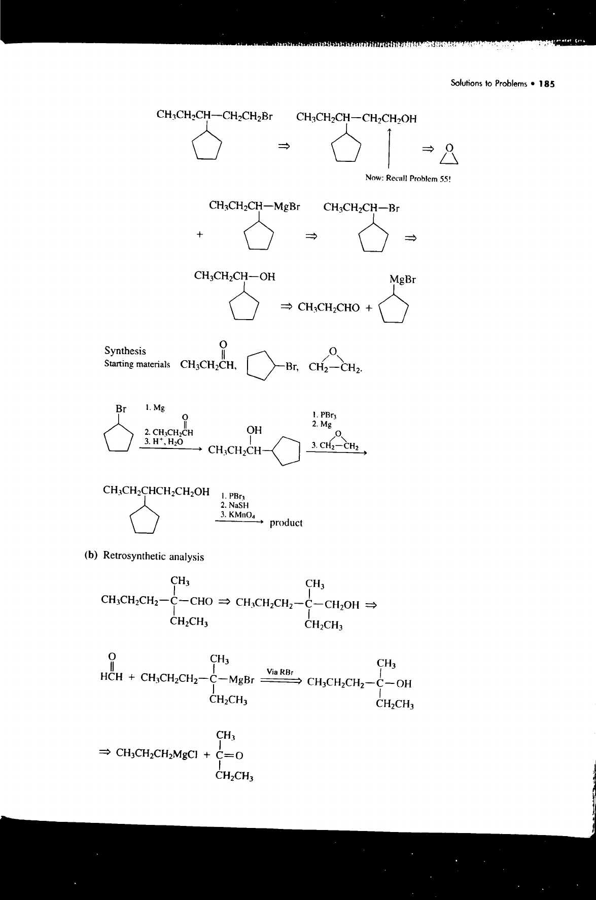 Solutions to Problems 185 Now: Recall Problem 55! + MgBr CH₃CH₂CHO + Synthesis Starting materials CH₃CH₂CH, Br, Br 1. Mg 1. PBr₃ o 2. Mg OH 2. CH₃CH₂CH 3. CH₃CH₂CH 1. PBr₃ 2. NaSH 3. product (b) Retrosynthetic analysis CH₃ CH₃ CH₂CH₃ CH₂CH₃ CH₃ CH₃ Via RBr HCH + CH₂CH₃ CH₂CH₃ CH₃ CH₂CH₃