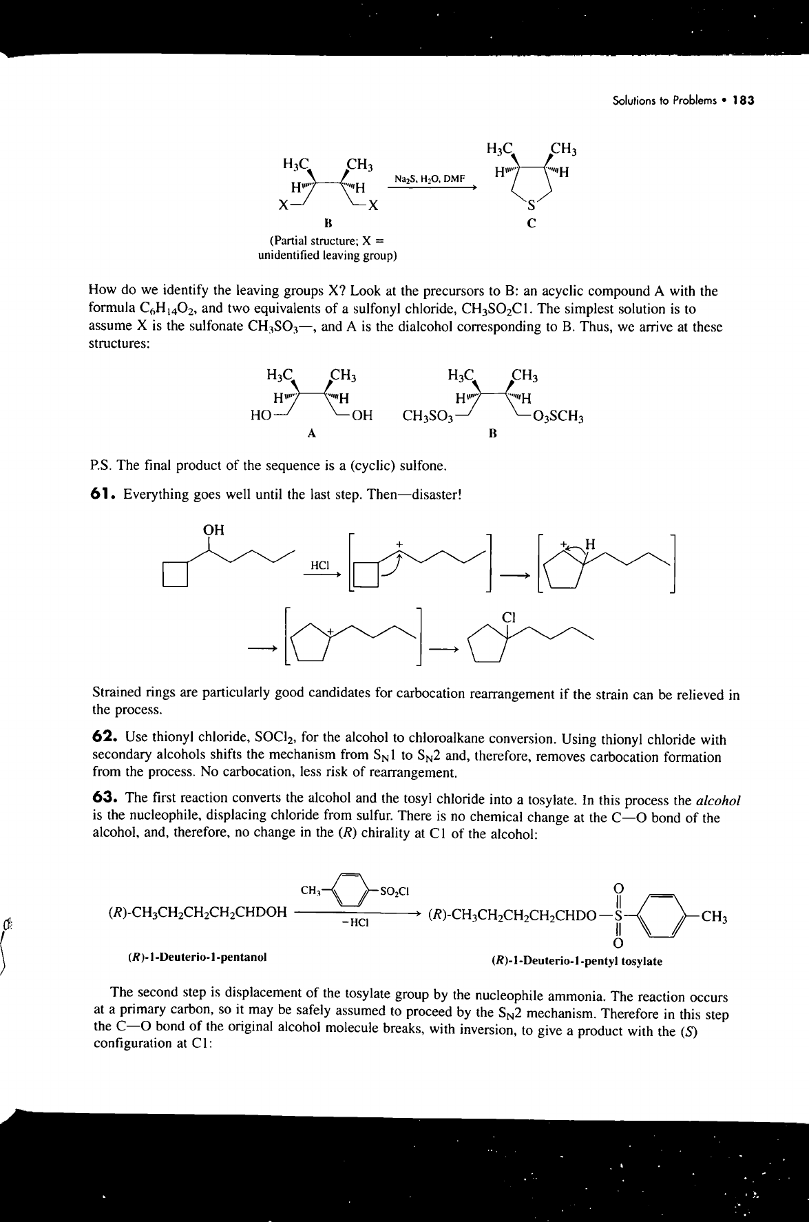 Solutions to Problems 183 CH₃ CH₃ H H H₂O, DMF H H X X S B C (Partial structure; X = unidentified leaving group) How do we identify the leaving groups X? Look at the precursors to B: an acyclic compound A with the formula C₆H₁₄O₂, and two equivalents of a sulfonyl chloride, CH₃SO₂C1. The simplest solution is to assume X is the sulfonate CH₃SO₃-, and A is the dialcohol corresponding to B. Thus, we arrive at these structures: CH₃ CH₃ H H H H HO OH O₃SCH₃ A B P.S. The final product of the sequence is a (cyclic) sulfone. 61. Everything goes well until the last step. Then-disaster! OH + + H HCI + Strained rings are particularly good candidates for carbocation rearrangement if the strain can be relieved in the process. 62. Use thionyl chloride, SOCl₂, for the alcohol to chloroalkane conversion. Using thionyl chloride with secondary alcohols shifts the mechanism from SN1 to and, therefore, removes carbocation formation from the process. No carbocation, less risk of rearrangement. 63. The first reaction converts the alcohol and the tosyl chloride into a tosylate. In this process the alcohol is the nucleophile, displacing chloride from sulfur. There is no chemical change at the bond of the alcohol, and, therefore, no change in the (R) chirality at of the alcohol: CH₃ (R)-CH₃CH₂CH₂CH₂CHDOH S CH₃ -HCI (R)-1-Deuterio-1-pentanol tosylate The second step is displacement of the tosylate group by the nucleophile ammonia. The reaction occurs at a primary carbon, so it may be safely assumed to proceed by the SN2 mechanism. Therefore in this step the bond of the original alcohol molecule breaks, with inversion, to give a product with the (S) configuration at