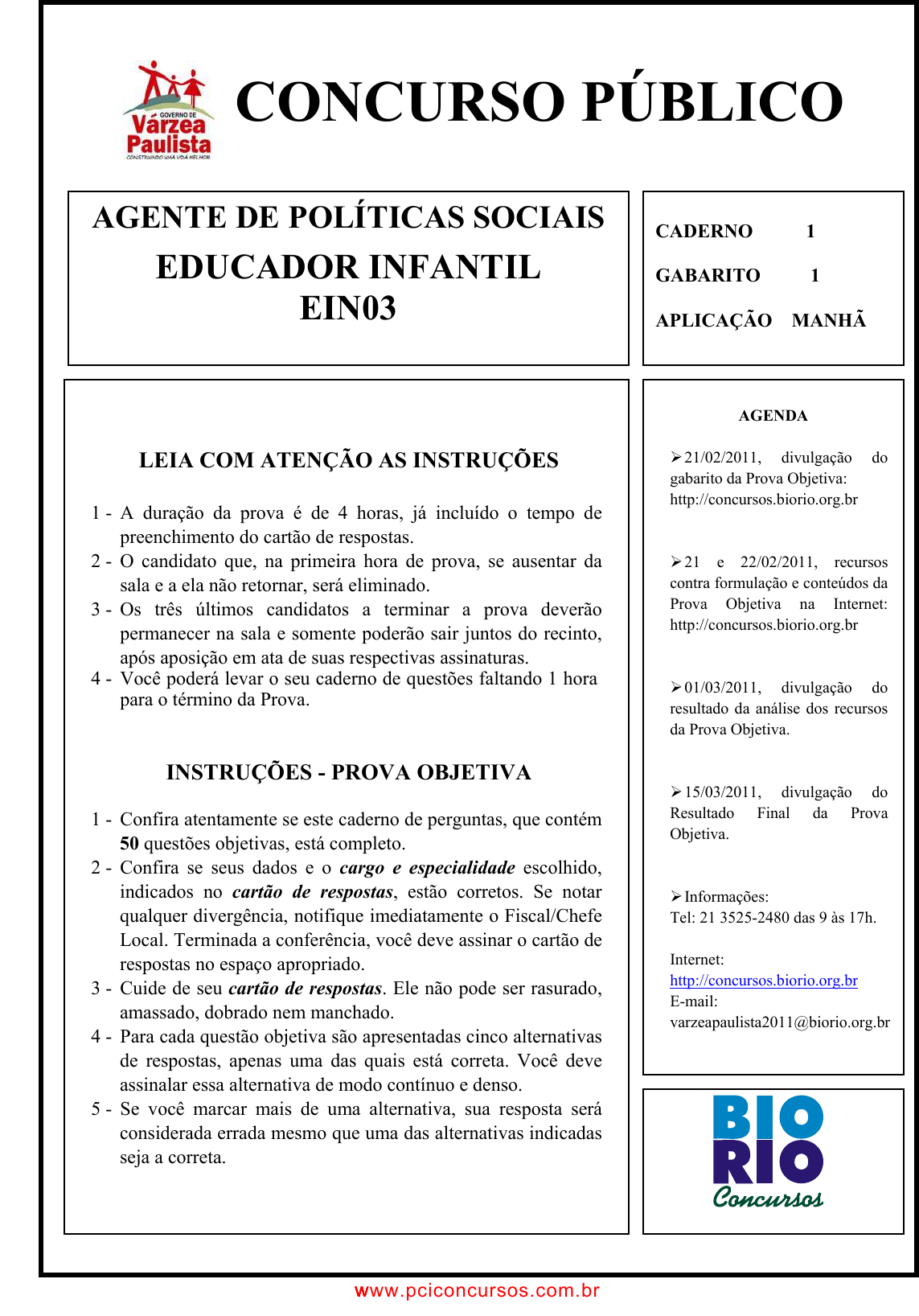 pcimarkpci MjgwNDowN2YxOmUyMjQ6MmY0Zjo1OTVkOmE4Njc6NmNjYTo4OWMy:VHVlLCAzMCBTZXAgMjAyNSAxNjowODoyMiAtMDMwMA== www.pciconcursos.com.br CONCURSO PÚBLICO CADERNO 1 GABARITO 1 APLICAÇÃO MANHÃ AGENTE DE POLÍTICAS SOCIAIS EDUCADOR INFANTIL EIN03 LEIA COM ATENÇÃO AS INSTRUÇÕES 1 - A duração da prova é de 4 horas, já incluído o tempo de preenchimento do cartão de respostas. 2 - O candidato que, na primeira hora de prova, se ausentar da sala e a ela não retornar, será eliminado. 3 - Os três últimos candidatos a terminar a prova deverão permanecer na sala e somente poderão sair juntos do recinto, após aposição em ata de suas respectivas assinaturas. 4 - Você poderá levar o seu caderno de questões faltando 1 hora para o término da Prova. INSTRUÇÕES - PROVA OBJETIVA 1 - Confira atentamente se este caderno de perguntas, que contém 50 questões objetivas, está completo. 2 - Confira se seus dados e o cargo e especialidade escolhido, indicados no cartão de respostas, estão corretos. Se notar qualquer divergência, notifique imediatamente o Fiscal/Chefe Local. Terminada a conferência, você deve assinar o cartão de respostas no espaço apropriado. 3 - Cuide de seu cartão de respostas. Ele não pode ser rasurado, amassado, dobrado nem manchado. 4 - Para cada questão objetiva são apresentadas cinco alternativas de respostas, apenas uma das quais está correta. Você deve assinalar essa alternativa de modo contínuo e denso. 5 - Se você marcar mais de uma alternativa, sua resposta será considerada errada mesmo que uma das alternativas indicadas seja a correta. AGENDA Ü 21/02/2011, divulgação do gabarito da Prova Objetiva: http://concursos.biorio.org.br Ü 21 e 22/02/2011, recursos contra formulação e conteúdos da Prova Objetiva na Internet: http://concursos.biorio.org.br Ü 01/03/2011, divulgação do resultado da análise dos recursos da Prova Objetiva. Ü 15/03/2011, divulgação do Resultado Final da Prova Objetiva. Ü Informações: Tel: 21 3525-2480 das 9 às 17h. Internet: http://concursos.biorio.org.br E-mail: varzeapaulista2011@biorio.org.br www.pciconcursos.com.br www.pciconcursos.com.br www.pciconcursos.com.br www.pciconcursos.com.br pcimarkpci MjgwNDowN2YxOmUyMjQ6MmY0Zjo1OTVkOmE4Njc6NmNjYTo4OWMy:VHVlLCAzMCBTZXAgMjAyNSAxNjowODoyMyAtMDMwMA== www.pciconcursos.com.br EDUCADOR INFANTIL EIN03 2 Organização: BIORIO Concursos Prefeitura Municipal de Várzea Paulista Estado de São Paulo LÍNGUA PORTUGUESA TEXTO 1 Sobre Ciência e Sapiência Muitas pessoas não gostam do que escrevo. Dizem que o que eu faço não é ciência; é literatura. É verdade. Faz tempo que me mudei da caixa de ferramentas para a caixa dos brinquedos. O que me aborrece é que esses que não gostam do que escrevo pensam que somente a ciência tem dignidade acadêmica. Houve mesmo o caso de uma candidata ao mestrado que teve seu projeto recusado por me citar demais e por propor um assunto que não era científico. Psicóloga e pedagoga, ela sabia por experiência própria do poder do olhar. Há tantos olhares diferentes! Há o olhar de desprezo, de admiração, de ternura, de ódio, de vergonha, de alegria... A mãe encosta o filhinho na parede e, a um metro de distância, lhe estende os braços e diz sorrindo: “Vem”. Encorajada pelo olhar a criança, que ainda não sabe andar, dá seus primeiros passos. Há olhares que dão coragem. E há olhares que destroem. Aquele olhar terrível da professora que olha para a criança de um certo jeito, sem nada dizer. Mas a criança entende o que o seu olhar está dizendo: “Como você é burra”... Há olhares que emburrecem. (...) O olhar é real. É real porque produz efeitos reais. O olho é também real. Sobre ele se pode ter conhecimento científico. Há uma ciência dos olhos. Há uma especialidade médica que se dedica a eles: a oftalmologia. Mas, por mais que procuremos nos tratados de oftalmologia referências ao olhar, não encontraremos nada. O olhar não é objeto de conhecimento científico. Nem tudo o que é real pode ser pescado com as redes metodológicas da ciência. Há objetos que escapam pelos buracos de suas malhas. Será possível fazer uma ciência dos olhares? Tratá-los estatisticamente? Não tem jeito. Aí a proposta de uma tese sobre o olhar foi rejeitada sob a justa alegação de que não era científica. E não era mesmo. Mas o fato é que os olhares são reais! O estudo dos olhos é tarefa da ciência. E por isso eu sou agradecido. Nesse momento estou usando óculos para escrever. Sem eles eu só veria borrões. Mas eu me dedico ao olhar, para que meus olhos sejam sábios. O olhar é uma música que os olhos tocam. Coisa de poeta... São os poetas que falam sobre os olhares. (Eu escrevi “são os poetas que sabem sobre os olhares” – mas logo corrigi. Todo mundo sabe sobre os olhares. Todo mundo observa atentamente os olhares porque são eles, e não os globos oculares, que sinalizam a vida e especialmente o amor... Mas só os poetas sabem falar sobre eles). Escrevo para mudar olhares. Isso não é ciência. É arte. Há olhos perfeitos que são armas mortíferas. Jesus se referiu a esses olhos e sugeriu que deveriam ser arrancados. Os olhos, eles mesmos, são estúpidos. Eles não têm o poder para discriminar as coisas dignas de serem vistas das coisas não dignas de serem vistas. Para eles tanto faz ver um programa idiota de televisão quanto uma tela de Vermeer. A capacidade de discriminar não pertence aos olhos. Pertence ao olhar. Mas isso exige uma luz interior. Se os olhos não serviram como metáforas, falarei sobre pianos. Mais precisamente, sobre os pianos Steinway, os mais perfeitos, que estão nas grandes salas de concerto do mundo. Os pianos Steinway são produzidos de forma absolutamente rigorosa e científica. Tudo neles tem de ter a medida exata. Todos têm de ser absolutamente iguais, para que o pianista não estranhe. Mas um piano, em si mesmo, é estúpido. Falta-lhes o poder de discrim