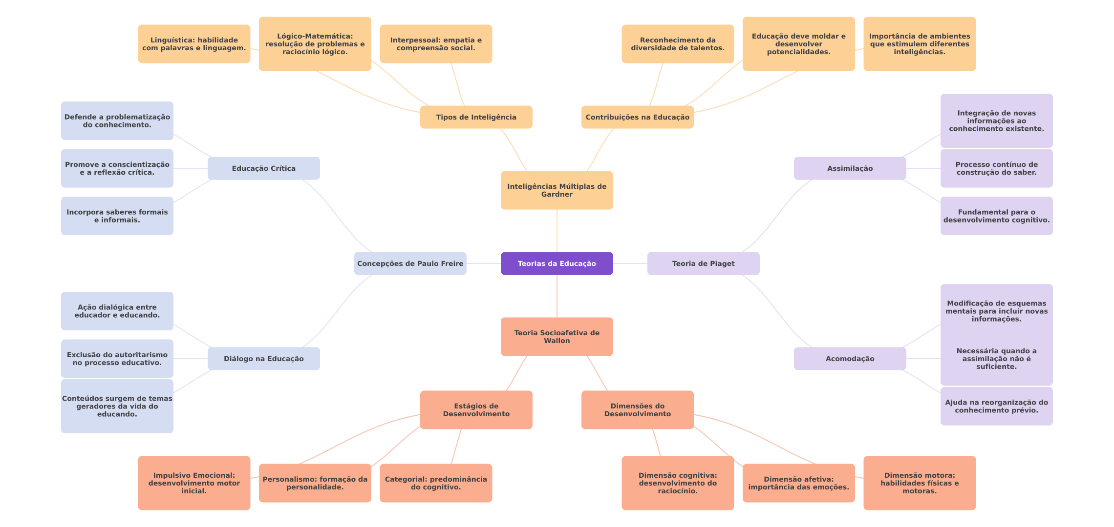 Linguística: habilidade Lógico-Matemática: Interpessoal: empatia e Reconhecimento da Educação deve moldar e Importância de ambientes resolução de problemas e desenvolver com palavras e linguagem. raciocínio lógico. compreensão social. diversidade de talentos. que estimulem diferentes potencialidades. inteligências. Defende a problematização Integração de novas Tipos de Inteligência Contribuições na Educação do conhecimento. informações ao conhecimento existente. Promove a conscientização Processo contínuo de e a reflexão crítica. Educação Crítica Assimilação construção do saber. Inteligências Múltiplas de Gardner Incorpora saberes formais Fundamental para e informais. desenvolvimento cognitivo. Concepções de Paulo Freire Teorias da Educação Teoria de Piaget Ação dialógica entre Modificação de esquemas educador e educando. mentais para incluir novas informações. Teoria Socioafetiva de Wallon Exclusão do autoritarismo Necessária quando a no processo educativo. Diálogo na Educação Acomodação assimilação não é suficiente. Conteúdos surgem de temas geradores da vida do Estágios de Dimensões do Ajuda na reorganização do educando. Desenvolvimento Desenvolvimento conhecimento prévio. Impulsivo Emocional: Dimensão cognitiva: Dimensão motora: Personalismo: formação da Categorial: predominância Dimensão afetiva: desenvolvimento motor desenvolvimento do habilidades físicas e inicial. personalidade. do cognitivo. raciocínio. importância das emoções. motoras.
