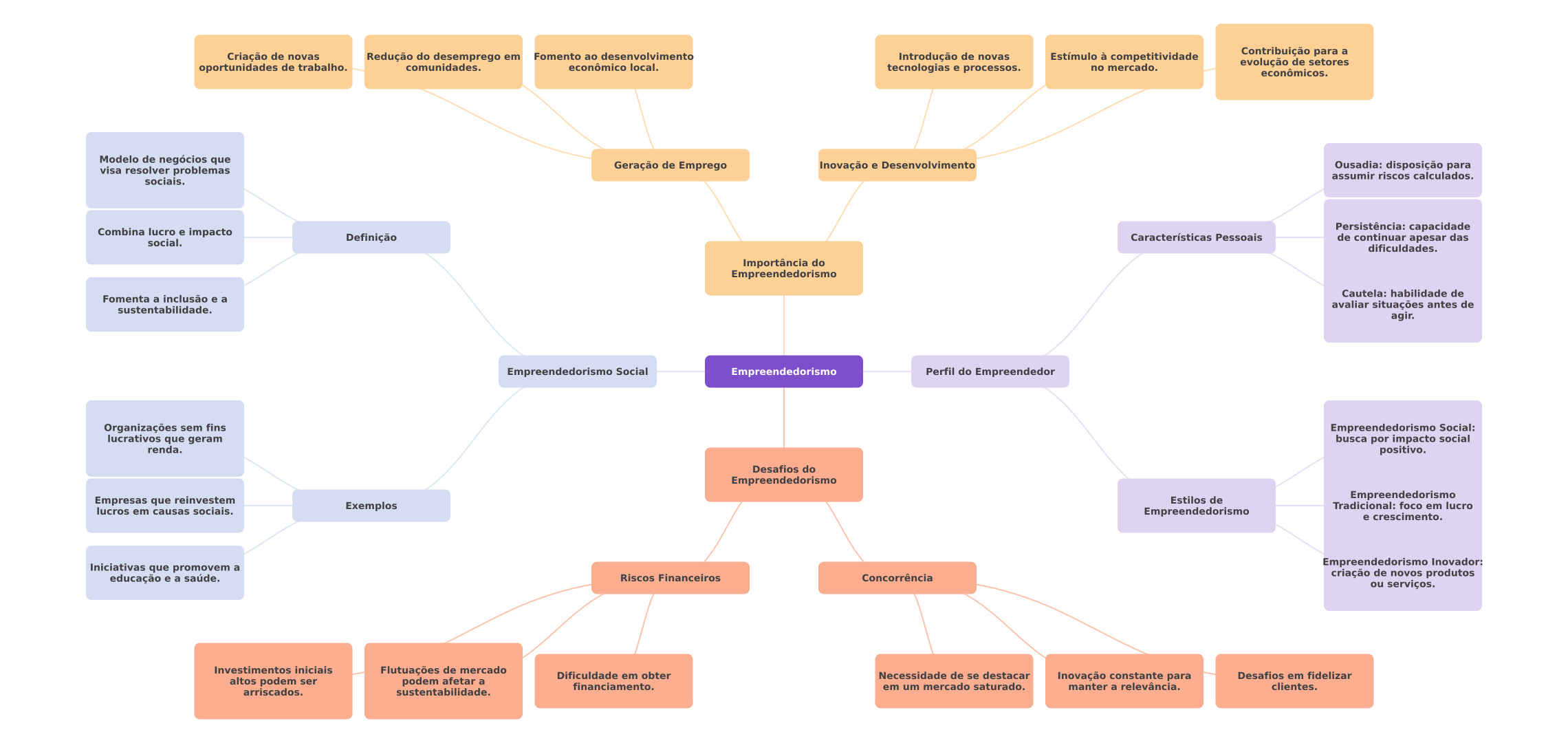 Criação de novas Redução do desemprego em Fomento ao Introdução de novas Estímulo à competitividade Contribuição para a oportunidades de trabalho. comunidades. econômico local. tecnologias e processos. no mercado. evolução de setores econômicos. Modelo de negócios que visa resolver problemas Geração de Emprego Inovação e Desenvolvimento Ousadia: disposição para assumir riscos calculados. sociais. Persistência: capacidade Combina lucro e impacto social. Definição Características Pessoais de continuar apesar das dificuldades. Importância do Empreendedorismo Cautela: habilidade de Fomenta a inclusão e a avaliar situações antes de sustentabilidade. agir. Empreendedorismo Social Empreendedorismo Perfil do Empreendedor Organizações sem fins Empreendedorismo Social: lucrativos que geram busca por impacto social renda. positivo. Desafios do Empreendedorismo Empresas que reinvestem Estilos de Empreendedorismo lucros em causas sociais. Exemplos Tradicional: foco em lucro Empreendedorismo e crescimento. Empreendedorismo Inovador: Iniciativas que promovem a educação e a saúde. Riscos Financeiros Concorrência criação de novos produtos ou serviços. Investimentos iniciais Flutuações de mercado Dificuldade em obter Necessidade de se destacar Inovação constante para Desafios em fidelizar altos podem ser podem afetar a financiamento. em um mercado saturado. manter a relevância. clientes. arriscados. sustentabilidade.
