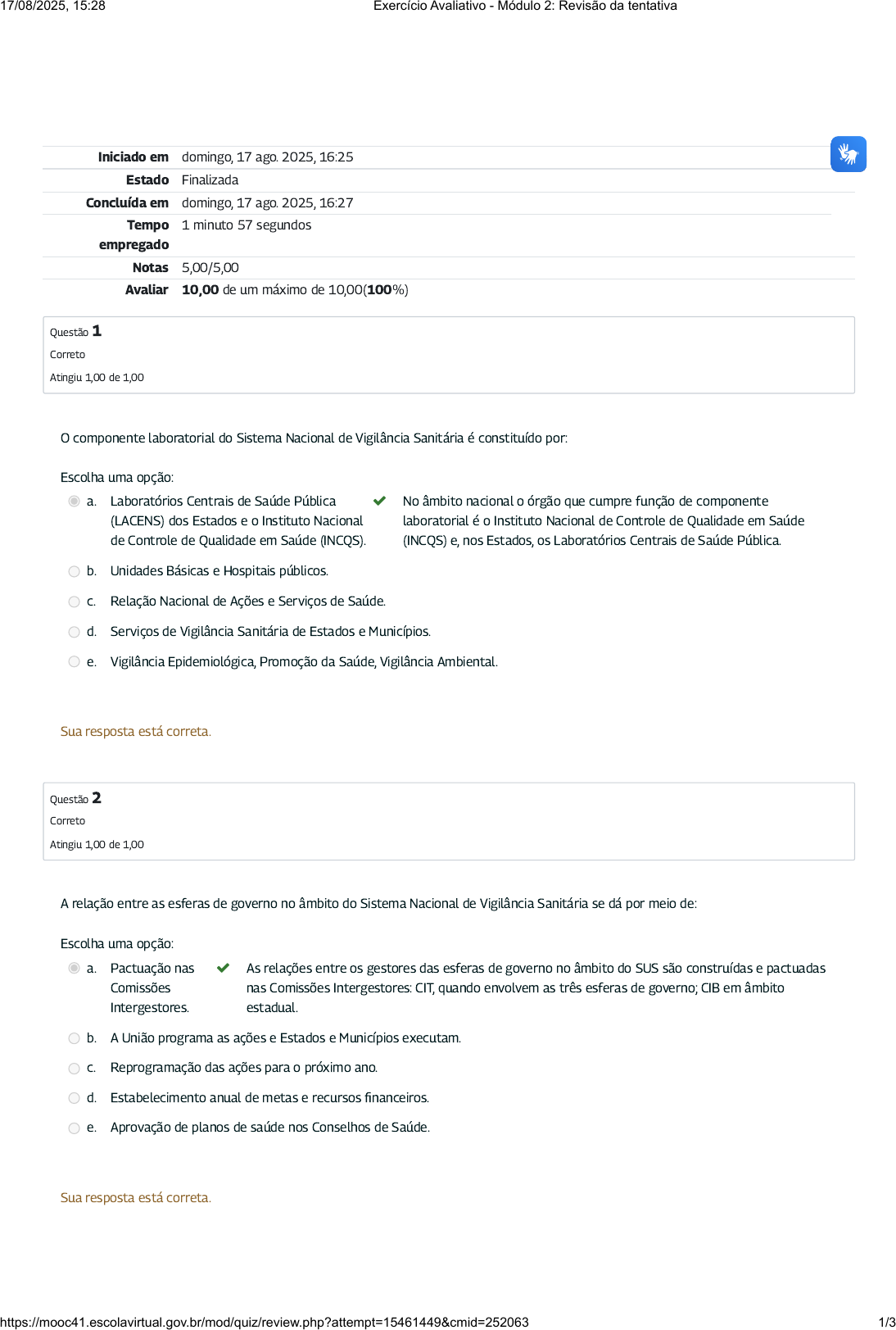 Iniciado em domingo, 17 ago. 2025, 16:25 Estado Finalizada Concluída em domingo, 17 ago. 2025, 16:27 Tempo empregado 1 minuto 57 segundos Notas 5,00/5,00 Avaliar 10,00 de um máximo de 10,00(100%) Questão 1 Correto Atingiu 1,00 de 1,00 Questão 2 Correto Atingiu 1,00 de 1,00 O componente laboratorial do Sistema Nacional de Vigilância Sanitária é constituído por: Escolha uma opção: a. Laboratórios Centrais de Saúde Pública (LACENS) dos Estados e o Instituto Nacional de Controle de Qualidade em Saúde (INCQS). No âmbito nacional o órgão que cumpre função de componente laboratorial é o Instituto Nacional de Controle de Qualidade em Saúde (INCQS) e, nos Estados, os Laboratórios Centrais de Saúde Pública. b. Unidades Básicas e Hospitais públicos. c. Relação Nacional de Ações e Serviços de Saúde. d. Serviços de Vigilância Sanitária de Estados e Municípios. e. Vigilância Epidemiológica, Promoção da Saúde, Vigilância Ambiental. Sua resposta está correta. A relação entre as esferas de governo no âmbito do Sistema Nacional de Vigilância Sanitária se dá por meio de: Escolha uma opção: a. Pactuação nas Comissões Intergestores. As relações entre os gestores das esferas de governo no âmbito do SUS são construídas e pactuadas nas Comissões Intergestores: CIT, quando envolvem as três esferas de governo; CIB em âmbito estadual. b. A União programa as ações e Estados e Municípios executam. c. Reprogramação das ações para o próximo ano. d. Estabelecimento anual de metas e recursos financeiros. e. Aprovação de planos de saúde nos Conselhos de Saúde. Sua resposta está correta. 17/08/2025, 15:28 Exercício Avaliativo - Módulo 2: Revisão da tentativa https://mooc41.escolavirtual.gov.br/mod/quiz/review.php?attempt=15461449&cmid=252063 1/3 Questão 3 Correto Atingiu 1,00 de 1,00 Questão 4 Correto Atingiu 1,00 de 1,00 A diretriz da Descentralização para o Sistema Único de Saúde compreende: Escolha uma opção: a. A razão de ser de uma organização dentro de uma sociedade. b. A transferência de responsabilidades de gestão para os estados e municípios, com a definição de atribuições comuns e competências específicas à União, estados, Distrito Federal e municípios. A descentralização é o processo de transferência de responsabilidades de gestão para os estados e municípios, atendendo às determinações constitucionais e legais que embasam o SUS e que definem atribuições comuns e competências específicas à União, estados, Distrito Federal e municípios. c. Situação ideal a ser alcançada pela instituição. d. Verificação quantitativa e qualitativa dos resultados alcançados com a execução da Programação Anual de Saúde. e. Aprovação do Relatório Anual de Gestão nos Conselhos de Saúde. Sua resposta está correta. O Sistema Único de Saúde é regido pelos seguintes princípios: Escolha uma opção: a. Publicidade, ética e valores morais. b. Impessoalidade, neutralidade e objetividade. c. Legalidade, moralidade e eficiência. d. Universalidade, integralidade e equidade. A Lei 8.080/90 estabelece que "As ações e serviços públicos de saúde e os serviços privados contratados ou conveniados que integram o Sistema Único de Saúde - SUS são desenvolvidos de acordo com as diretrizes previstas no Art.198 da Constituição Federal, obedecendo ainda aos seguintes princípios: universalidade, integralidade e equidade". e. Transparência, publicidade e ética. Sua resposta está correta. 17/08/2025, 15:28 Exercício Avaliativo - Módulo 2: Revisão da tentativa https://mooc41.escolavirtual.gov.br/mod/quiz/review.php?attempt=15461449&cmid=252063 2/3 Questão 5 Correto Atingiu 1,00 de 1,00 O Sistema Nacional de Vigilância Sanitária, como componente integrante do SUS, é regido pelas seguintes diretrizes: Escolha uma opção: a. O diagnóstico, formulação do plano, definição das metas. b. Os instrumentos de planejamento do SUS. c. Análise da situação de saúde de uma população. d. Cumprimento de metas de fiscalização. e. Regionalização, descentralização, participação e controle social. A Lei 8.080/90 estabelece que "As ações e serviços públicos de saúde e os serviços privados contratados ou conveniados que integram o Sistema Único de Saúde - SUS são desenvolvidos de acordo com as diretrizes previstas no Art.198 da Constituição Federal: descentralização político- administrativa com direção única em cada esfera de governo; regionalização e hierarquização, participação da comunidade. Sua resposta está correta. 17/08/2025, 15:28 Exercício Avaliativo - Módulo 2: Revisão da tentativa https://mooc41.escolavirtual.gov.br/mod/quiz/review.php?attempt=15461449&cmid=252063 3/3
