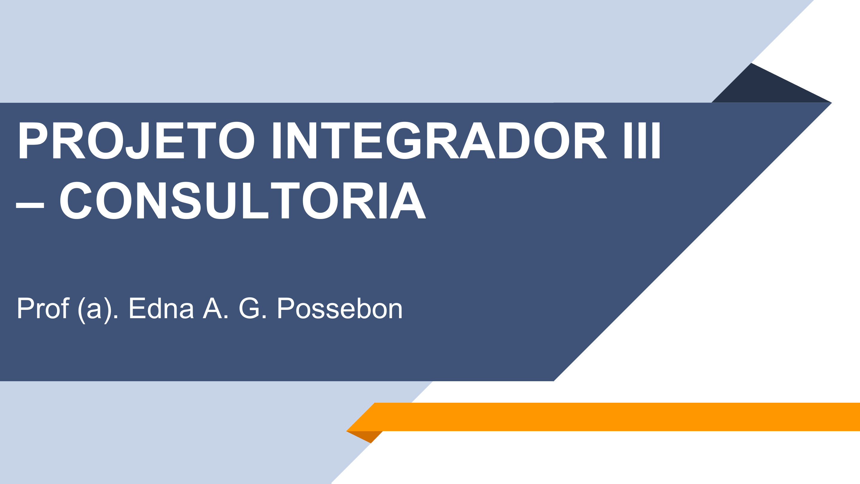 PROJETO INTEGRADOR III – CONSULTORIA Prof (a). Edna A. G. Possebon APRESENTAÇÃO 2 Profa. Edna Aparecida Greggio Possebon ▰ Graduado em Administração (UEM); ▰ MBA em Gestão de Projetos; ▰ Mestre em Administração (UEM); ▰ Doutoranda em Finanças (FEA/USP). APRESENTAÇÃO 3 Unidade I – O que é consultoria? Conceitos Básicos; Unidade II – Tipos de Consultoria; Unidade III – O Mercado de Trabalho e o Profissional da Consultoria; Unidade IV – Consultoria e Cases de Sucesso 4 Obrigado(a)! Nome do professor(a) Edna Ap. Greggio Possebon Contato/Rede Social: @ednagreggio
