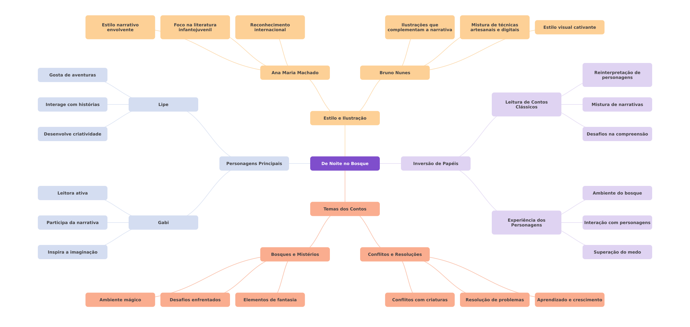 Estilo narrativo Foco na literatura Ilustrações que Mistura de técnicas Estilo visual cativante envolvente infantojuvenil internacional complementam a narrativa artesanais e digitais Ana Maria Machado Bruno Nunes Gosta de aventuras Reinterpretação de personagens Leitura de Contos Interage com histórias Lipe Mistura de narrativas Clássicos Estilo e Ilustração Desenvolve criatividade Desafios na compreensão Personagens Principais De Noite no Bosque Inversão de Papéis Leitora ativa Ambiente do bosque Temas dos Contos Participa da narrativa Gabi Experiência dos Personagens Interação com personagens Inspira a imaginação Bosques e Mistérios Conflitos e Resoluções Superação do medo Ambiente mágico Desafios enfrentados Elementos de fantasia Conflitos com criaturas Resolução de problemas Aprendizado e crescimento