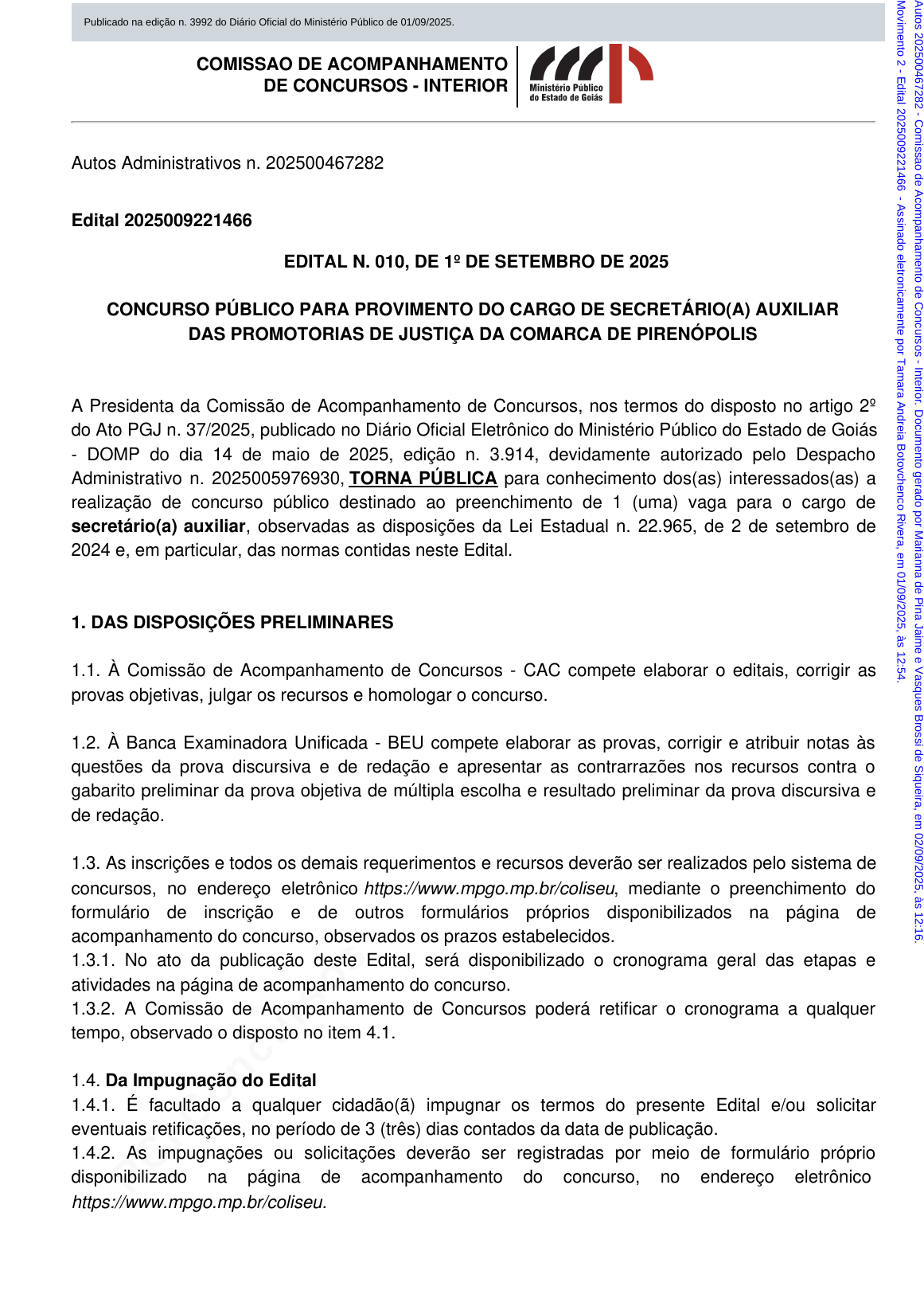 pcimarkpci MjgwNDo0ZjgwOjNmMDA6YWIxMDo3ZGY2OmVmOGE6NjdiMTphN2Uw:RnJpLCAwMyBPY3QgMjAyNSAxMTo0NjoxMyAtMDMwMA== www.pciconcursos.com.br COMISSAO DE ACOMPANHAMENTO DE CONCURSOS - INTERIOR Autos Administrativos n. 202500467282 Edital 2025009221466 EDITAL N. 010, DE 1º DE SETEMBRO DE 2025 CONCURSO PÚBLICO PARA PROVIMENTO DO CARGO DE SECRETÁRIO(A) AUXILIAR DAS PROMOTORIAS DE JUSTIÇA DA COMARCA DE PIRENÓPOLIS A Presidenta da Comissão de Acompanhamento de Concursos, nos termos do disposto no artigo 2º do Ato PGJ n. 37/2025, publicado no Diário Oficial Eletrônico do Ministério Público do Estado de Goiás - DOMP do dia 14 de maio de 2025, edição n. 3.914, devidamente autorizado pelo Despacho Administrativo n. 2025005976930, TORNA PÚBLICA para conhecimento dos(as) interessados(as) a realização de concurso público destinado ao preenchimento de 1 (uma) vaga para o cargo de secretário(a) auxiliar, observadas as disposições da Lei Estadual n. 22.965, de 2 de setembro de 2024 e, em particular, das normas contidas neste Edital. 1. DAS DISPOSIÇÕES PRELIMINARES 1.1. À Comissão de Acompanhamento de Concursos - CAC compete elaborar o editais, corrigir as provas objetivas, julgar os recursos e homologar o concurso. 1.2. À Banca Examinadora Unificada - BEU compete elaborar as provas, corrigir e atribuir notas às questões da prova discursiva e de redação e apresentar as contrarrazões nos recursos contra o gabarito preliminar da prova objetiva de múltipla escolha e resultado preliminar da prova discursiva e de redação. 1.3. As inscrições e todos os demais requerimentos e recursos deverão ser realizados pelo sistema de concursos, no endereço eletrônico https://www.mpgo.mp.br/coliseu, mediante o preenchimento do formulário de inscrição e de outros formulários próprios disponibilizados na página de acompanhamento do concurso, observados os prazos estabelecidos. 1.3.1. No ato da publicação deste Edital, será disponibilizado o cronograma geral das etapas e atividades na página de acompanhamento do concurso. 1.3.2. A Comissão de Acompanhamento de Concursos poderá retificar o cronograma a qualquer tempo, observado o disposto no item 4.1. 1.4. Da Impugnação do Edital 1.4.1. É facultado a qualquer cidadão(ã) impugnar os termos do presente Edital e/ou solicitar eventuais retificações, no período de 3 (três) dias contados da data de publicação. 1.4.2. As impugnações ou solicitações deverão ser registradas por meio de formulário próprio disponibilizado na página de acompanhamento do concurso, no endereço eletrônico https://www.mpgo.mp.br/coliseu. Publicado na edição n. 3992 do Diário Oficial do Ministério Público de 01/09/2025. M ovim ento 2 - E dital 2025009221466 - A ssinado eletronicam ente por Tam ara A ndreia B otovchenco R ivera, em 01/09/2025, às 12:54. A utos 202500467282 - C om issao de A com panham ento de C oncursos - Interior. D ocum ento gerado por M arianna de P ina Jaim e e V asques B rossi de S iqueira, em 02/09/2025, às 12:16. pcimarkpci MjgwNDo0ZjgwOjNmMDA6YWIxMDo3ZGY2OmVmOGE6NjdiMTphN2Uw:RnJpLCAwMyBPY3QgMjAyNSAxMTo0NjoxMyAtMDMwMA== www.pciconcursos.com.br 1.4.3. As impugnações ou solicitações serão analisadas e julgadas pela Comissão de Acompanhamento de Concursos, que publicará a decisão final na página de acompanhamento do concurso, no prazo de até 3 (três) dias anteriores ao início do prazo de inscrição. 1.4.4. Não caberá, sob nenhuma hipótese, recurso administrativo sobre o resultado do julgamento das impugnações ou solicitações. 2. DO CARGO 2.1. O cargo de secretário(a) auxiliar, criado pela Lei Estadual n. 13.162, de 5 de novembro de 1997, integra o grupo ocupacional auxiliar do Ministério Público do Estado de Goiás, e possui as seguintes características: Quantidade de cargos vagos : 1 (um) Quantidade de cargos vagos destinados à pessoa com deficiência: 0 (zero) Quantidade de cargos vagos destinados à pessoa negra: 0 (zero) Remuneração inicial: R$ 4.542,73 (quatro mil, quinhentos e quarenta e dois reais e setenta e três centavos). Outros benefícios: Auxílio-alimentação; auxílio-transporte; auxílio-creche; auxílio-saúde. Jornada de trabalho: 40 (quarenta) horas semanais. Local de lotação: Promotoria de Justiça da comarca de Pirenópolis. Pré-requisitos para o cargo: O(a) candidato(a) deverá possuir ensino fundamental completo e ser aprovado em concurso público de provas e títulos, o qual avaliará seus conhecimentos acerca das disciplinas constantes do Anexo I deste Edital, das funções e da organização do Ministério Público, bem como o domínio das diversas ferramentas básicas de informática, essenciais ao desempenho do cargo. Atribuições do cargo: Auxiliar no planejamento, execução e avaliação de planos, projetos, programas e pesquisas da administração superior do Ministério Público e dos órgãos de execução, auxiliar no atendimento ao público; receber, autuar e controlar a tramitação de processos administrativos e judiciais atinentes à unidade ou órgão, cumprindo despachos e registrando-os devidamente; organizar preencher e manter os livros obrigatórios da unidade ou órgão; controlar a emissão e o recebimento de expedientes; organizar o arquivo da unidade ou órgão; redigir ou digitar documentos diversos; cuidar das correspondências; auxiliar na realização de diligências e audiências; organizar agenda e contatos de interesse da unidade ou órgão, com os devidos registros; zelar pelos equipamentos e materiais da unidade ou órgão, mantendo controle de estoque e tombamento; operar equipamentos diversos necessários ao desempenho de suas tarefas; substituir temporariamente o(a) oficial(a) de promotoria; auxiliar na organização das rotinas burocráticas da unidade ou órgão; compilar os dados para a elaboração do relatório estatístico mensal das atividades desenvolvidas pela unidade ou órgão; secretariar os(as) promotores(as) de just