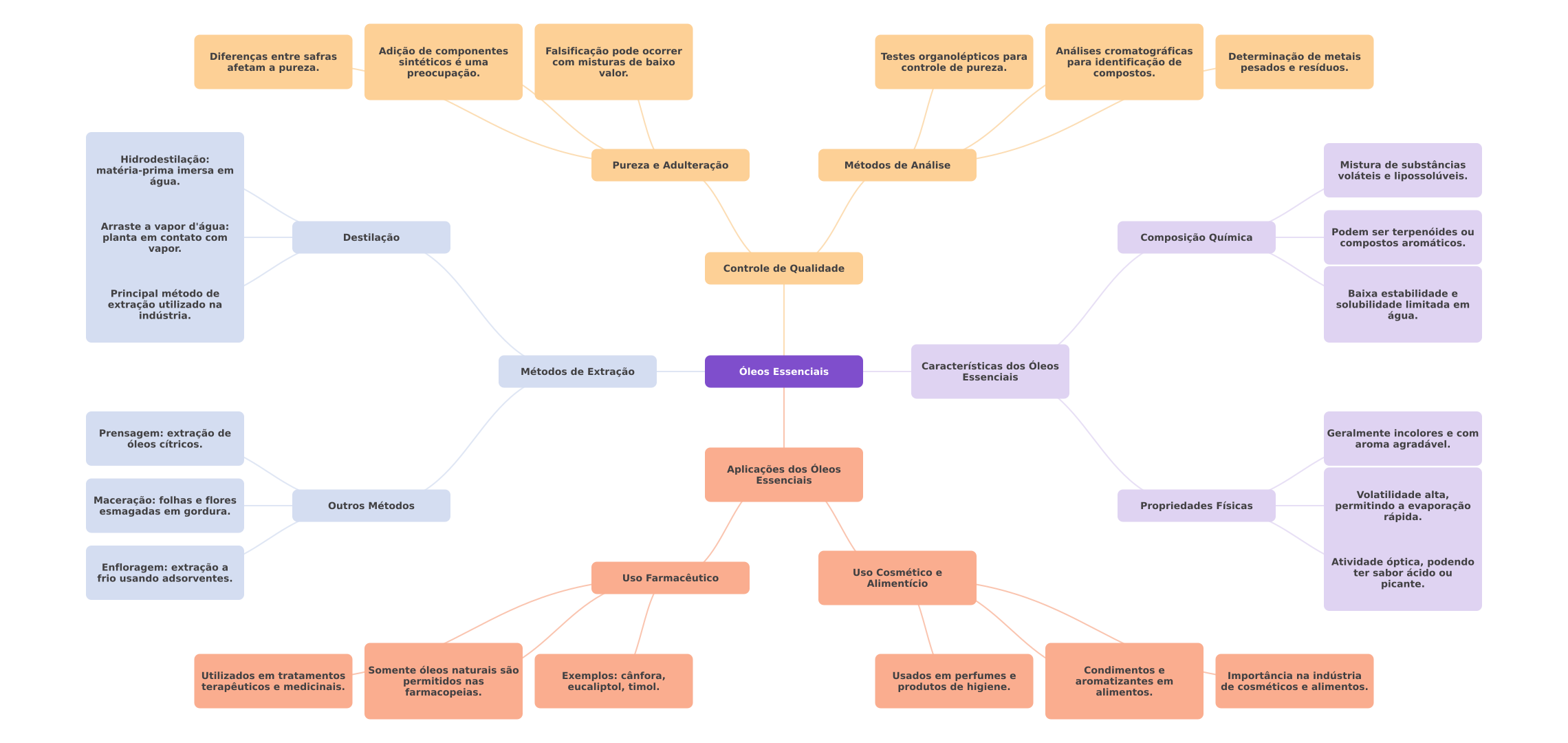Diferenças entre safras Adição de componentes Falsificação pode ocorrer sintéticos é uma com misturas de baixo Testes organolépticos para Análises cromatográficas Determinação de metais afetam a pureza. preocupação. valor. controle de pureza. para identificação de pesados e resíduos. compostos. Hidrodestilação: Pureza e Adulteração Métodos de Análise Mistura de substâncias matéria-prima imersa em voláteis e lipossolúveis. água. Arraste a vapor d'água: planta em contato com Composição Química Podem ser terpenóides ou Destilação compostos aromáticos. vapor. Controle de Qualidade Principal método de Baixa estabilidade e extração utilizado na solubilidade limitada em indústria. água. Características dos Óleos Métodos de Extração Óleos Essenciais Essenciais Prensagem: extração de Geralmente incolores e com óleos cítricos. aroma agradável. Aplicações dos Óleos Essenciais Volatilidade alta, Maceração: folhas e flores Outros Métodos Propriedades Físicas permitindo a evaporação esmagadas em gordura. rápida. Enfloragem: extração a Atividade óptica, podendo Uso Cosmético e ter sabor ácido ou frio usando adsorventes. Uso Farmacêutico Alimentício picante. Somente óleos naturais são Condimentos e Utilizados em tratamentos permitidos nas Exemplos: cânfora, Usados em perfumes e Importância na indústria aromatizantes em terapêuticos e medicinais. farmacopeias. eucaliptol, timol. produtos de higiene. de cosméticos e alimentos. alimentos.
