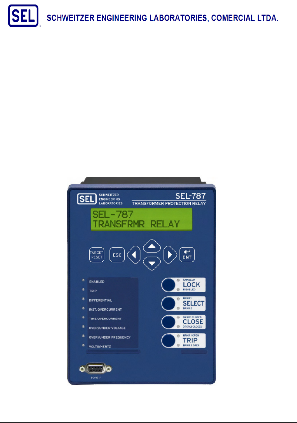 Rodovia Campinas Mogi-Mirim (SP-340), Km 118,50 Prédio 11 – Campinas-SP CEP 13086-902 Tel: (19) 3515 2000 home-page: www.selinc.com.br Fax: (19) 3515 2011 CNPJ: 03.837.858/0001-01 Insc. Estadual: 244.668.694.116 1/247 MEMÓRIA DE CÁLCULO PARA OS AJUSTES DO RELÉ DE PROTEÇÃO DE TRANSFORMADOR SEL-787 Rodovia Campinas Mogi-Mirim (SP-340), Km 118,50 Prédio 11 – Campinas-SP CEP 13086-902 Tel: (19) 3515 2000 home-page: www.selinc.com.br Fax: (19) 3515 2011 CNPJ: 03.837.858/0001-01 Insc. Estadual: 244.668.694.116 2/247 ÍNDICE PÁG. 1. INTRODUÇÃO ................................................................................................. 3 2. CARACTERÍSTICAS DO RELÉ SEL-787 ....................................................... 7 2.1. Funções de Proteção ..................................................................................... 7 2.2. Funções de Medição ...................................................................................... 7 2.3. Funções de Monitoramento ........................................................................... 8 2.4. Funções de Controle ...................................................................................... 8 2.5. Lógicas Adicionais ......................................................................................... 9 2.6. Integração e Comunicação ............................................................................ 9 2.7. Outras Características ................................................................................... 9 2.8. Opcionais ...................................................................................................... 10 2.9. Kit Retrofit (Opcional) .................................................................................. 11 3. MEMÓRIA DE CÁLCULO .............................................................................. 12 3.1. Correntes de curtos-circuitos...................................................................... 12 3.2. Global ............................................................................................................ 12 3.3. Group 1 .......................................................................................................... 50 3.4. Front Panel .................................................................................................. 159 3.5. Report .......................................................................................................... 169 3.6. Port F ........................................................................................................... 174 3.7. Port 1 ........................................................................................................... 177 3.8. Port 2 ........................................................................................................... 200 3.9. Port 3 ........................................................................................................... 211 3.10. Port 4 ........................................................................................................... 226 3.11. Modbus User Map ....................................................................................... 240 3.12. DNP Maps .................................................................................................... 242 4. ANEXOS ...................................................................................................... 245 4.1. Anexo I ......................................................................................................... 245 5. Referências ................................................................................................. 247 Rodovia Campinas Mogi-Mirim (SP-340), Km 118,50 Prédio 11 – Campinas-SP CEP 13086-902 Tel: (19) 3515 2000 home-page: www.selinc.com.br Fax: (19) 3515 2011 CNPJ: 03.837.858/0001-01 Insc. Estadual: 244.668.694.116 3/247 1. INTRODUÇÃO O presente documento tem a finalidade de apresentar um exemplo de memória de cálculo e a respectiva parametrização dos ajustes, para o Relé de Proteção de Transformador SEL-787, utilizado na proteção de um transformador de 2 enrolamentos, de 138/13,8 kV – 50,00 MVA, ligado em estrela/delta, conforme Figura 1. Figura 1 – Proteção Diferencial em Transformador de Dois Enrolamentos com REF e Proteção de Tensão Rodovia Campinas Mogi-Mirim (SP-340), Km 118,50 Prédio 11 – Campinas-SP CEP 13086-902 Tel: (19) 3515 2000 home-page: www.selinc.com.br Fax: (19) 3515 2011 CNPJ: 03.837.858/0001-01 Insc. Estadual: 244.668.694.116 4/247 NOTA IMPORTANTE: Este documento é apenas um exemplo de memória de cálculo para o relé SEL- 787, o profissional que irá executar os estudos deve ser qualificado para tal tarefa e utilizar de outras literaturas, não tomando este documento como única referência. Devido à complexidade e inúmeros detalhes das subestações onde o relé SEL-787 pode ser usado, a SCHWEITZER ENGINEERING LABORATORIES não se responsabiliza por qualquer uso inadequado deste documento e que venha a causar danos. Rodovia Campinas Mogi-Mirim (SP-340), Km 118,50 Prédio 11 – Campinas-SP CEP 13086-902 Tel: (19) 3515 2000 home-page: www.selinc.com.br Fax: (19) 3515 2011 CNPJ: 03.837.858/0001-01 Insc. Estadual: 244.668.694.116 5/247 Diagrama de Conexão Os diagramas de conexão das Figuras 2 e 3 ilustram as entradas, saídas e portas de comunicação do relé SEL-787. Figura 2 – båíê~Ç~ëbåíê~Ç~ëbåíê~Ç~ëbåíê~Ç~ë==== ÉÉÉÉ==== p~∞Ç~ëp~∞Ç~ëp~∞Ç~ëp~∞Ç~ë==== aáÖáí~áë= É= ^å~äµÖáÅ~ëI=aáÖáí~áë= É= ^å~äµÖáÅ~ëI=aáÖáí~áë= É= ^å~äµÖáÅ~ëI=aáÖáí~áë= É= ^å~äµÖáÅ~ëI= moêí~ë= ÇÉ= `oãìåáÅ~´©o=moêí~ë= ÇÉ= `oãìåáÅ~´©o=moêí~ë= ÇÉ= `oãìåáÅ~´©o=moêí~ë= ÇÉ= `oãìåáÅ~´©o= Åoã= cáÄê~=Åoã= cáÄê~=Åoã= cáÄê~=Åoã= cáÄê~= þíáÅ~þíáÅ~þíáÅ~þíáÅ~======== Figur