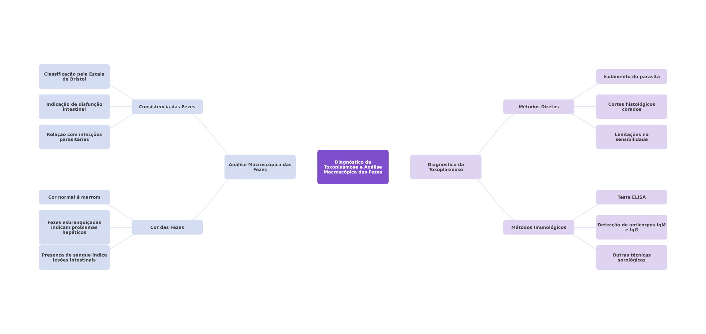 Classificação pela Escala de Bristol Isolamento do parasita Indicação de disfunção Consistência das Fezes Métodos Diretos Cortes histológicos intestinal corados Relação com infecções Limitações na parasitárias sensibilidade Análise Macroscópica das Diagnóstico da Diagnóstico da Fezes Toxoplasmose e Análise Macroscópica das Fezes Toxoplasmose Cor normal é marrom Teste ELISA Fezes esbranquiçadas indicam problemas Cor das Fezes Métodos Imunológicos Detecção de anticorpos IgM e IgG hepáticos Presença de sangue indica Outras técnicas lesões intestinais sorológicas