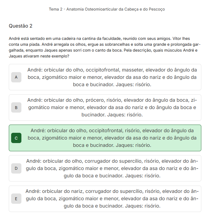Tema 2 Anatomia Osteomioarticular da Cabeça e do Pescoço Questão 2 André está sentado em uma cadeira na cantina da faculdade, reunido com seus amigos. Vitor lhes conta uma piada. Andre arregala olhos, ergue as sobrancelhas e solta uma grande e prolongada gar- galhada, enquanto Jaques apenas sorri com canto da boca. Pela descrição, quais músculos e Jaques ativaram neste exemplo? orbicular do olho, occipitofrontal, masseter, elevador do ângulo da A boca, zigomático maior e menor, elevador da asa do nariz e do ângulo da boca e bucinador. Jaques: risório. orbicular do olho, prócero, risório, elevador do ângulo da boca, zi- B gomático maior e menor, elevador da asa do nariz e do ângulo da boca e bucinador. Jaques: risório. André: orbicular do olho, occipitofrontal, risório, elevador do ângulo da C boca, zigomático maior e menor, elevador da asa do nariz e do ângulo da boca e bucinador. Jaques: risório. André: orbicular do olho, corrugador do supercílio, risório, elevador do ân- D gulo da boca, zigomático maior e menor, elevador da asa do nariz e do ân- gulo da boca e bucinador. Jaques: risório. André: orbicular do nariz, corrugador do supercílio, risório, elevador do ân- E gulo da boca, zigomático maior e menor, elevador da asa do nariz e do ân- gulo da boca e bucinador. Jaques: risório.
