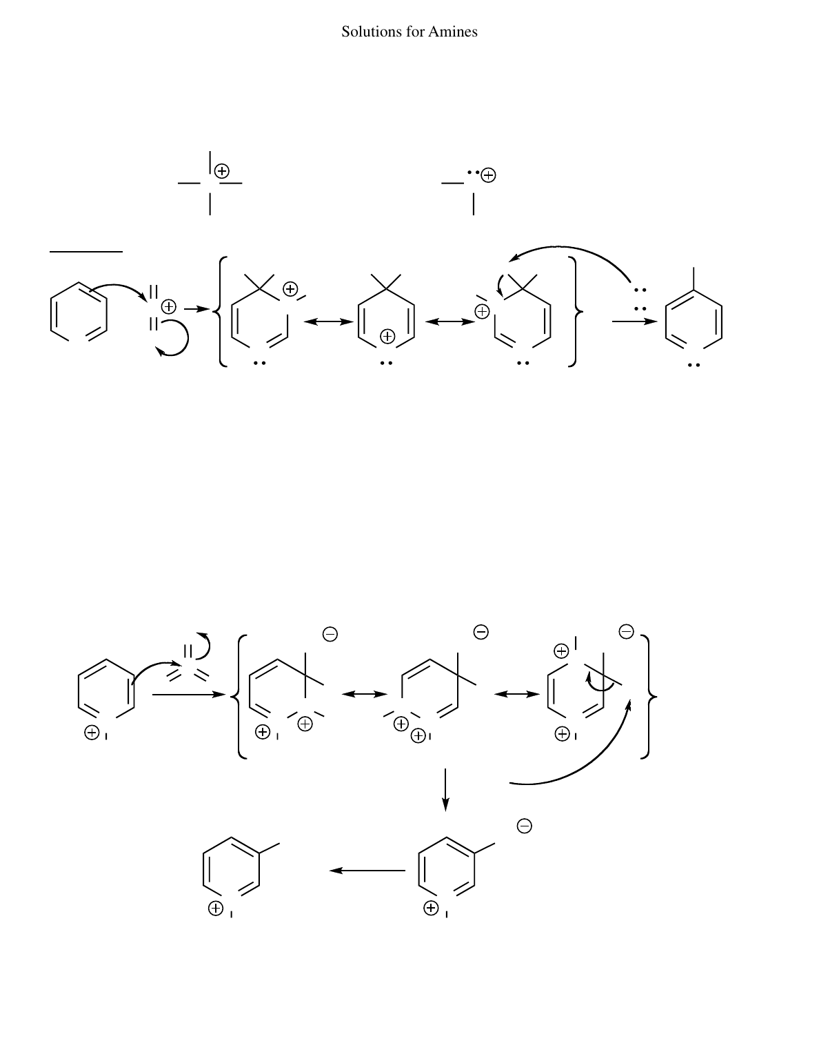 Solutions for Amines H2O NO2 N C N H NO2 H N NO2H N C N H NO2 H N N 11 Nitration at the 4-position of pyridine is not observed for the same reason that nitration at the 2- position is not observed: the intermediate puts some positive character on an electron-deficient nitrogen, and electronegative nitrogen hates that. (It is important to distinguish this type of positive nitrogen without a complete octet of electrons, from the quaternary nitrogen, also positively charged but with a full octet. It is the number of electrons around atoms that is most important; the charge itself is less important.) GOOD: VERY BAD: mechanism VERY BAD— N does not have an octet of electrons. not produced because of unfavorable intermediate N O O C N SO3 H H H HSO4 – N SO3 H H SO3 C NH H H2SO4 C N SO3 H H H SO3H N H O S O O N H 12 Any electrophilic attack, including sulfonation, is preferred at the 3-position of pyridine because the intermediate is more stable than the intermediate from attack at either the 2-position or the 4-position. (Resonance forms of the sulfonate group are not shown, but remember that they are important!) The N of pyridine is basic, and in the strong acid mixture, it will be protonated as shown here. That is part of the reason that pyridine is so sluggish to react: the ring already has a positive charge, so attack of an electrophile is slowed. 455