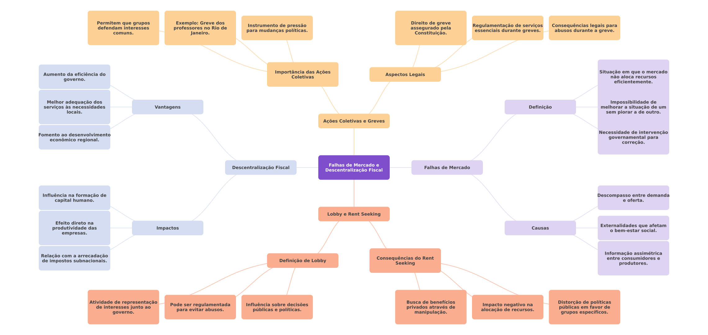 Permitem que grupos Exemplo: Greve dos Instrumento de pressão Direito de greve defendam interesses professores no Rio de assegurado pela Regulamentação de serviços Consequências legais para comuns. Janeiro. para mudanças políticas. Constituição. essenciais durante greves. abusos durante a greve. Aumento da eficiência do Importância das Ações Situação em que mercado Coletivas Aspectos Legais não aloca recursos governo. eficientemente. Melhor adequação dos Impossibilidade de serviços às necessidades Vantagens Definição melhorar a situação de um locais. sem piorar a de outro. Ações Coletivas e Greves Fomento ao desenvolvimento Necessidade de intervenção econômico regional. governamental para correção. Falhas de Mercado e Descentralização Fiscal Falhas de Mercado Descentralização Fiscal Influência na formação de Descompasso entre demanda capital humano. e oferta. Lobby e Rent Seeking Efeito direto na produtividade das Causas Externalidades que afetam Impactos bem-estar social. empresas. Informação assimétrica Relação com a arrecadação Definição de Lobby Consequências do Rent entre consumidores e de impostos subnacionais. Seeking produtores. Atividade de representação Busca de benefícios Pode ser regulamentada Influência sobre decisões Distorção de políticas de interesses junto ao para evitar abusos. públicas e políticas. privados através de Impacto negativo na alocação de recursos. públicas em favor de governo. manipulação. grupos específicos.