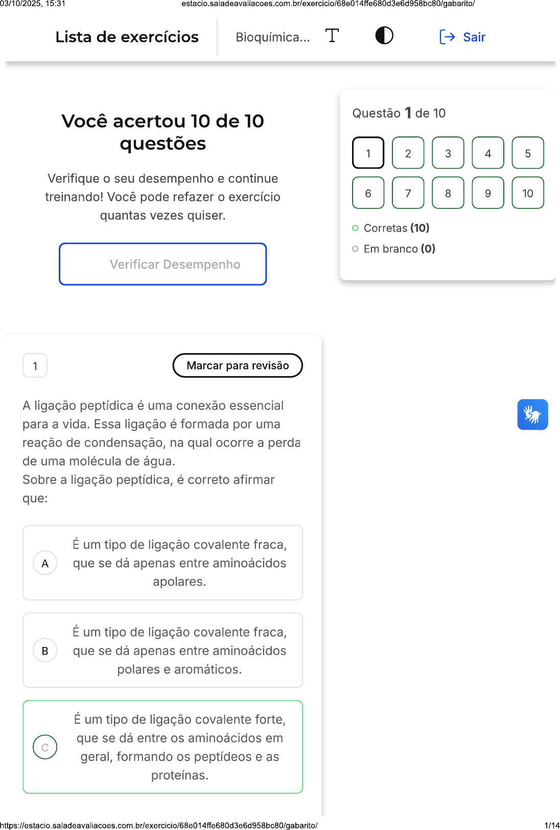 03/10/2025, 15:31 estacio.saladeavaliacoes.com.br/exercicio/68e014ffe680d3e6d958bc80/gabarito/ Lista de exercícios Bioquímica... T Sair Questão 1 de 10 Você acertou 10 de 10 questões 1 2 3 4 5 Verifique seu desempenho e continue treinando! Você pode refazer exercício 6 7 8 9 10 quantas vezes quiser. Corretas (10) Em branco (0) Verificar Desempenho 1 Marcar para revisão A ligação peptídica é uma conexão essencial para a vida. Essa ligação é formada por uma reação de condensação, na qual ocorre a perda de uma molécula de água. Sobre a ligação peptídica, é correto afirmar que: É um tipo de ligação covalente fraca, A que se dá apenas entre aminoácidos apolares. É um tipo de ligação covalente fraca, que se dá apenas entre aminoácidos polares e aromáticos. É um tipo de ligação covalente forte, que se dá entre os aminoácidos em c geral, formando os peptídeos e as proteínas. https://estacio.saladeavaliacoes.com.br/exercicio/68e014ffe680d3e6d958bc80/gabarito/ 1/1403/10/2025, 15:31 estacio.saladeavaliacoes.com.br/exercicio/68e014ffe680d3e6d958bc80/gabarito/ É um tipo de ligação covalente forte, D que se dá entre as cadeias laterais dos aminoácidos em geral. É um tipo de ligação iônica, que se dá E entre as carboxilas dos aminoácidos. Resposta correta Parabéns, você selecionou a alternativa correta. Confira gabarito comentado! Gabarito Comentado A ligação peptídica é um tipo de ligação covalente forte, que se dá entre os aminoácidos em geral, formando os peptídeos e as proteínas. Essa ligação é formada pela união da carboxila de um aminoácido com grupo amino de outro aminoácido, liberando uma molécula de água. A ligação peptídica é a principal responsável pela estrutura tridimensional das proteínas. 2 Marcar para revisão Os aminoácidos possuem em comum um carbono assimétrico, com quatro ligantes diferentes. Aminoácidos H H N H R c https://estacio.saladeavaliacoes.com.br/exercicio/68e014ffe680d3e6d958bc80/gabarito/ 2/1403/10/2025, 15:31 Sobre esses quatro ligantes diferentes, marque a alternativa correta. A grupo amino, cadeia lateral; c A grupo carboxila. A - grupo cetona, grupo carbonila; c - grupo carboxila. A grupo cetona, cadeia lateral; c c grupo éster. A - grupo cetona, radical carboxila; D c - grupo aromático. A grupo amino, - cadeia lateral; c E radical álcool. Resposta correta Parabéns, você selecionou a alternativa correta. Confira gabarito comentado! Gabarito Comentado A estrutura geral de um aminoácido consta com três ligantes fixos: um grupo carboxila, um grupo amino, um átomo de hidrogênio; e um ligante variável: a cadeia lateral, a qual chamaremos de grupo R. 3 Marcar para revisão É esperado para uma enzima: 3/1403/10/2025, 15:31 estacio.saladeavaliacoes.com.br/exercicio/68e014ffe680d3e6d958bc80/gabarito/ Que ela se ligue apenas em substratos A lipídicos. Que ela se ligue apenas em substratos com característica de material genético. Que elas sejam digeridas em c substituição aos carboidratos. Que elas tenham especificidade com D os substratos e catalisem sua conversão em produto. Que elas atuem independente do pH E do meio reacional Resposta correta Parabéns, você selecionou a alternativa correta. Confira gabarito comentado! Gabarito Comentado As enzimas são proteínas que atuam como catalisadores biológicos, acelerando reações químicas que ocorrem nos organismos vivos. Elas possuem uma característica fundamental que é a especificidade, ou seja, cada enzima atua sobre um determinado substrato, catalisando sua conversão em produto. Portanto, a alternativa correta é a D: "Que elas tenham especificidade com os substratos e catalisem sua conversão em produto". 4/1403/10/2025, 15:31 estacio.saladeavaliacoes.com.br/exercicio/68e014ffe680d3e6d958bc80/gabarito/ 4 Marcar para revisão (IBADE/2018 adaptada) A pepsina é a enzima mais eficiente do suco gástrico sendo regulada pela ação do hormônio gastrina. A respeito do processo de digestão e as enzimas que participam desse processo, analise as asserções e II. I. Durante processo de mastigação os alimentos passam por reações de hidrólise. Porque II. Passam pela atividade enzimática da ptialina (amilase salivar) que vai atuar sobre amido (carboidrato) quebrando-o em moléculas através adição de água. Marque a alternativa que apresenta a relação correta entre as asserções e II. Ambas as asserções são verdadeiras, A e a asserção é uma justificativa para a asserção I. Ambas as asserções são verdadeiras, mas a asserção não é uma justificativa para a asserção I. A asserção I é verdadeira e a asserção c é falsa. A asserção I é falsa e a asserção é D verdadeira. E Ambas as asserções são falsas. 5/1403/10/2025, 15:31 Resposta correta Parabéns, você selecionou a alternativa correta. Confira gabarito comentado! Gabarito Comentado Enzimas que catalisam as reações de hidrólise, ou seja, a quebra de moléculas através da adição de água. Como exemplo, podemos citar a enzima amilase, importante enzima utilizada na digestão de carboidratos. 5 Marcar para revisão Os grupos funcionais destas moléculas são representados pelos radicais hidroxila (-OH), sulfidrilas (-SH) e amida (-CONH2). Estes radicais conferem aos aminoácidos uma maior solubilidade em água pela possibilidade de ligações de hidrogênio. Entre os principais representantes deste grupo estão os aminoácidos: serina, glutamina, asparagina, treonina e cisteína. Marque a alternativa que representa grupo funcional descrito acima. A Grupos R polares e não carregados. Grupos R carregados positivamente. c Grupos R carregados negativamente. 6/1403/10/2025, 15:31 D Grupos R alifáticos. E Grupos R aromáticos. Resposta correta Parabéns, você selecionou a alternativa correta. Confira gabarito comentado! Gabarito Comentado Grupos R polares e não carregados: Destacam-se neste grupo os aminoácidos serina, glutamina, asparagi
