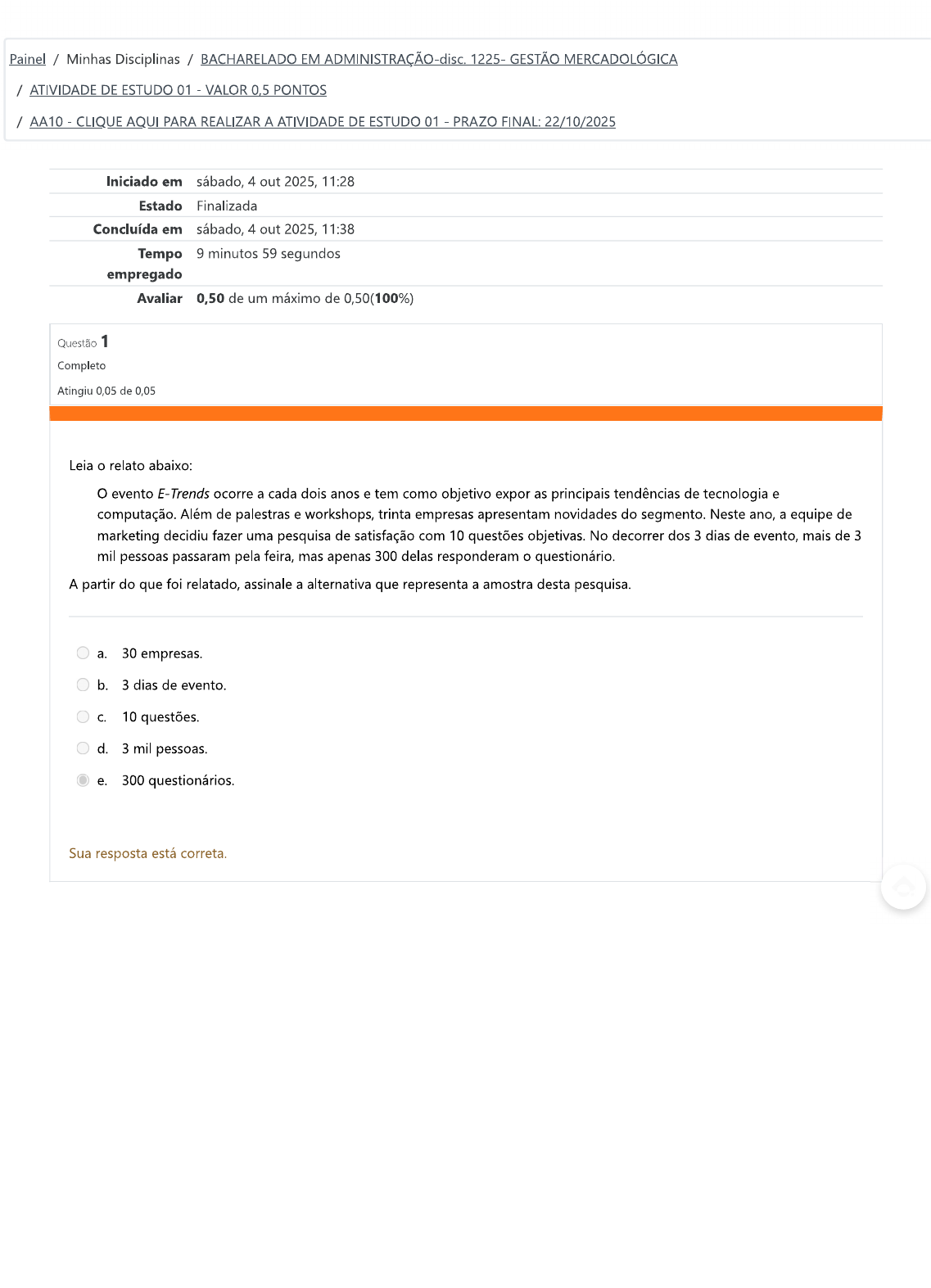 Painel / Minhas Disciplinas / BACHARELADO EM ADMINISTRAÇÃO-disc. 1225- GESTÃO MERCADOLÓGICA / ATIVIDADE DE ESTUDO 01 VALOR 0,5 PONTOS / AA10 CLIQUE AQUI PARA REALIZAR A ATIVIDADE DE ESTUDO 01 PRAZO FINAL: 22/10/2025 Iniciado em sábado, 4 out 2025, 11:28 Estado Finalizada Concluída em sábado, 4 out 2025, 11:38 Tempo 9 minutos 59 segundos empregado Avaliar 0,50 de um máximo de 0,50(100%) Questão 1 Completo Atingiu 0,05 de 0,05 Leia o relato abaixo: evento E-Trends ocorre a cada dois anos e tem como objetivo expor as principais tendências de tecnologia e computação. Além de palestras e workshops, trinta empresas apresentam novidades do segmento. Neste ano, a equipe de marketing decidiu fazer uma pesquisa de satisfação com 10 questões objetivas. No decorrer dos 3 dias de evento, mais de 3 mil pessoas passaram pela feira, mas apenas 300 delas responderam o questionário. A partir do que foi relatado, assinale a alternativa que representa a amostra desta pesquisa. a. 30 empresas. b. 3 dias de evento. C. 10 questões. d. 3 mil pessoas. e. 300 questionários. Sua resposta está correta.Questão 2 Completo Atingiu 0,05 de 0,05 Leia o relato: A empresa Papel&Caneta possui uma variada cartela de revistas impressas que podem ser assinadas por leitores do Brasil todo. A fim de divulgar a revista de negócios Top Business fez uma ação dentro dos principais aeroportos do país. Contratou vários atendentes e ofereciam uma mala de viagem para quem realizasse assinaturas da revista e ofereceram para todos aqueles que embarcavam nos voos, os atendentes eram muito persuasivos e insistentes, que resultou em um grande aumento no número de assinantes. A partir das orientações das empresas, assinalar a alternativa que representa o tipo de orientação da Papel&Caneta neste caso. a. Produto. b. Marketing. C. Mercadológico. d. Produção. e. Vendas. Sua resposta está correta. Questão 3 Completo Atingiu 0,05 de 0,05 "Em suma, a era do Marketing 3.0 é aquela em que as práticas de marketing são muito influenciadas pelas mudanças no comportamento e nas atitudes do consumidor. É a forma mais sofisticada da era centrada no consumidor, em que o consumidor demanda abordagens de marketing colaborativas, culturais e espirituais." Fonte: KOTLER, Philip. Marketing 3.0: As forças que estão definindo novo marketing centrado no ser humano. Rio de Janeiro: Elsevier, 2010. De acordo com a afirmação mencionada, assinale a alternativa que representa os conceitos de Marketing 3.0: a. Mercado de massa em que as necessidades dos consumidores são tangíveis. b. Teve como força propulsora a Revolução Industrial; marketing é centrado no produto. C. Impulsionado pela nova onda da tecnologia, o conceito de marketing é focado nos valores da empresa. d. As diretrizes de marketing da empresa são focadas em seu posicionamento e em sua diferenciação dos concorrentes. e. As empresas influenciam as atitudes do consumidor que é cada vez mais passivo e menos colaborativo. Sua resposta está correta.Questão 4 Completo Atingiu 0,05 de 0,05 Hoje em dia é possível verificar algumas alterações na influência do consumidor. Um exemplo acontece no mercado infantil, já que muitas crianças consomem vídeos no Youtube e jogos digitais. Este tipo de comportamento afeta diretamente a forma em que empresas que desenvolvem produtos e serviços para estes públicos irão agir no mercado. A partir do caso exemplificado, assinale a alternativa que está ligado a estes fatores de influência com relação ao comportamento do consumidor. a. Fatores psicológicos. b. Fatores sociais. C. Fatores pessoais. d. Fatores financeiros. e. Fatores culturais. Sua resposta está correta.Questão 5 Completo Atingiu 0,05 de 0,05 Para a AMA (American Marketing Association), a pesquisa de marketing é a função que liga o consumidor, o cliente e o público ao profissional de marketing. Por meio dessa pesquisa, levantam-se as informações necessárias para resolver problemas, por meio de projetos e métodos de coleta de informações. DEFINITIONS of Marketing. AMA. Disponível em: Acesso em: 25 set. 2019. De acordo com os conteúdos sobre pesquisa de marketing, avalie as asserções a seguir e a relação proposta entre elas. I. A pesquisa pode levantar informações importantes para as marcas, como identificar e definir oportunidades e problemas de marketing. POIS: II. Uma pesquisa bem aplicada garante o sucesso das ações de marketing. Após analisar as asserções, assinale a alternativa correta: a. A asserção lé uma proposição verdadeira, e a asserção é uma proposição falsa. b. As asserções e são proposições verdadeiras, e a é uma justificativa correta da I. C. As asserções e são proposições verdadeiras, mas a não é uma justificativa correta da I. d. As asserções e são proposições falsas. e. A asserção lé uma proposição falsa, e a é uma proposição verdadeira. Sua resposta está correta.Questão 6 Completo Atingiu 0,05 de 0,05 Na atualidade, é possível perceber que o conceito de comunicação mercadológica vai além da mera transmissão de mensagens entre as marcas e seus consumidores. A comunicação mercadológica atual é entendida como a composição de um ambiente comum entre duas ou mais partes, onde participam juntas, fornecem e extraem informações. Com tantas mudanças na sociedade, o desenvolvimento da comunicação tornou-se essencial não só para as pessoas, mas também para as empresas e todo o mundo corporativo. A este respeito, reveja as seguintes afirmações e suas inter-relações. I. Na mercadologia, a comunicação é importante para obter excelência e conquistar uma maior eficácia na tecnologia empresarial. PORQUE II. As empresas precisam consumir informações dos consumidores e do mercado para poderem se ajustar. A respeito dessas asserções, assinale a opção correta. a. As afirmações e são verdadeiras, e a afirmação I justifica a afirmação II. b. A afi