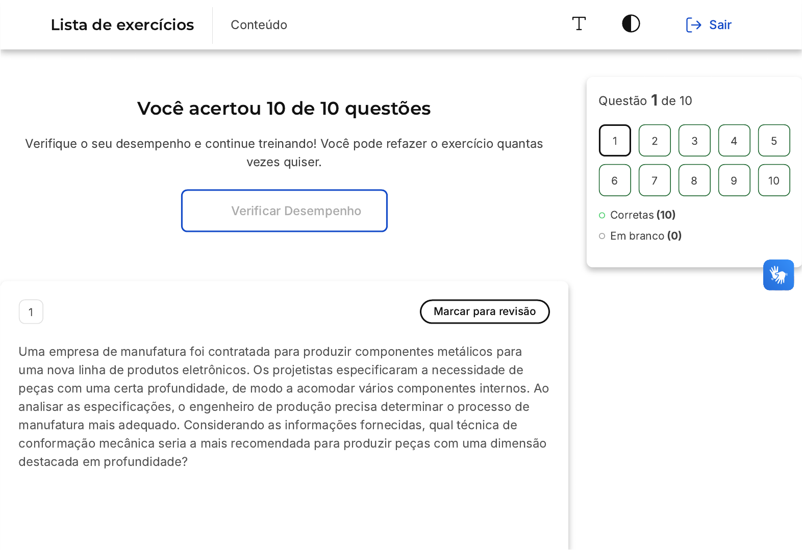 Você acertou 10 de 10 questões Verifique o seu desempenho e continue treinando! Você pode refazer o exercício quantas vezes quiser. Verificar Desempenho 1 Marcar para revisão Uma empresa de manufatura foi contratada para produzir componentes metálicos para uma nova linha de produtos eletrônicos. Os projetistas especificaram a necessidade de peças com uma certa profundidade, de modo a acomodar vários componentes internos. Ao analisar as especificações, o engenheiro de produção precisa determinar o processo de manufatura mais adequado. Considerando as informações fornecidas, qual técnica de conformação mecânica seria a mais recomendada para produzir peças com uma dimensão destacada em profundidade? Questão 1 de 10 Corretas (10) Em branco (0) 1 2 3 4 5 6 7 8 9 10 Lista de exercícios Conteúdo Sair A B C D E Torneamento. Estampagem. Fresagem. Embutimento. Laminação. Resposta correta Parabéns, você selecionou a alternativa correta. Confira o gabarito comentado! Gabarito Comentado A estampagem rasa, muitas vezes chamada apenas de estampagem, é usada principalmente para criar formas superficiais em peças, enquanto o embutimento (estampagem profunda) é usado para produzir peças com uma dimensão destacada em profundidade. Considerando a necessidade de peças com uma certa profundidade para acomodar componentes internos, a técnica mais adequada seria o embutimento (ou estampagem profunda). A B C D E 2 Marcar para revisão A curva da energia total de trefilação possui um valor mínimo que corresponde à mínima energia necessária para a trefilação. A esse valor mínimo, está associado um ângulo de abordagem ótimo. À medida que o ângulo de abordagem aumenta, tem-se que a partir de um determinado ângulo crítico: A força de reação da matriz sobre o material faz com que o material mude a direção de deformação, invertendo o sentido do fluxo do metal A energia total de trefilação é reduzida em função do aumento do atrito entre o material e a fieira Ocorre a formação de uma zona morta na matriz, que caracteriza-se por uma região do material que permanece estagnado na parede da fieira formando uma falsa matriz O material sofre um descascamento e a região do núcleo do material tem sua dureza aumentada ao passar pela fieira Ocorre a formação de uma zona morta na matriz que provoca o descascamento do material A B Resposta correta Parabéns, você selecionou a alternativa correta. Confira o gabarito comentado! Gabarito Comentado A alternativa correta é a letra C. Na trefilação, quando o ângulo de abordagem aumenta além de um determinado ângulo crítico, ocorre a formação de uma zona morta na matriz. Esta zona morta é caracterizada por uma região do material que permanece estagnada na parede da fieira, formando o que é conhecido como uma falsa matriz. Isso significa que o material não está sendo devidamente deformado e puxado através da fieira, o que pode levar a problemas na qualidade do produto final. 3 Marcar para revisão Os processos de fabricação por Conformação Mecânica para a produção de peças metálicas abrangem um grande número de processos que são classificados em função dos tipos de esforços aplicados. Um dos objetivos da Conformação Mecânica é: Fabricar peças complexas utilizando polímeros Promover a união de partes metálicas para produzir uma peça C D E Obter uma tolerância dimensional reduzida por deformação plástica Obter uma melhoria nas propriedades mecânicas do produto em função do encruamento causado pela deformação plástica do material Produzir peças metálicas pela mudança de fase da matéria-prima Resposta correta Parabéns, você selecionou a alternativa correta. Confira o gabarito comentado! Gabarito Comentado A alternativa correta é a D, que afirma que um dos objetivos da Conformação Mecânica é obter uma melhoria nas propriedades mecânicas do produto em função do encruamento causado pela deformação plástica do material. O encruamento é um fenômeno que ocorre quando um material é deformado plasticamente, o que resulta em um aumento de sua resistência e dureza. Portanto, a Conformação Mecânica busca aproveitar esse fenômeno para melhorar as propriedades mecânicas do produto final. 4 Marcar para revisão A B C D E Um fabricante de componentes aeronáuticos precisa produzir uma peça de metal com formato complexo. Dada a complexidade do formato, o processo de forjamento precisa ser dividido em etapas. Na primeira etapa, ao invés de tentar obter diretamente a forma final da peça, o fabricante foca em distribuir o metal para regiões que facilitarão o forjamento subsequente. Qual das alternativas a seguir descreve corretamente essa primeira etapa? O fabricante realiza o forjamento final, garantindo a forma exata da peça desejada. O fabricante faz uso de uma matriz de esboço para obter uma pré-forma aproximada da peça final. A matriz final é usada para a distribuição do metal, sem necessidade de uma matriz intermediária. O forjamento é feito diretamente na matriz final, mas em temperaturas mais baixas. O fabricante utiliza o processo de forjamento a frio para garantir a forma final imediatamente. Resposta correta Parabéns, você selecionou a alternativa correta. Confira o gabarito comentado! A B C Gabarito Comentado O pré-forjamento tem como objetivo fazer uma distribuição adequada do metal em regiões que facilitarão o forjamento subsequente. Para isso, é utilizado uma matriz de esboço, que permite obter uma configuração mais próxima da forma final, mas ainda não a forma definitiva, minimizando assim o esforço de forjamento nas etapas subsequentes. 5 Marcar para revisão No forjamento em matriz aberta, também chamado de forjamento livre, a matéria-prima é conformada entre matrizes planas ou de forma simples, que geralmente não se tocam. Sobre o forjamento de matriz aberta, não é correto dizer que: Esse tipo de forjamento é usado pa