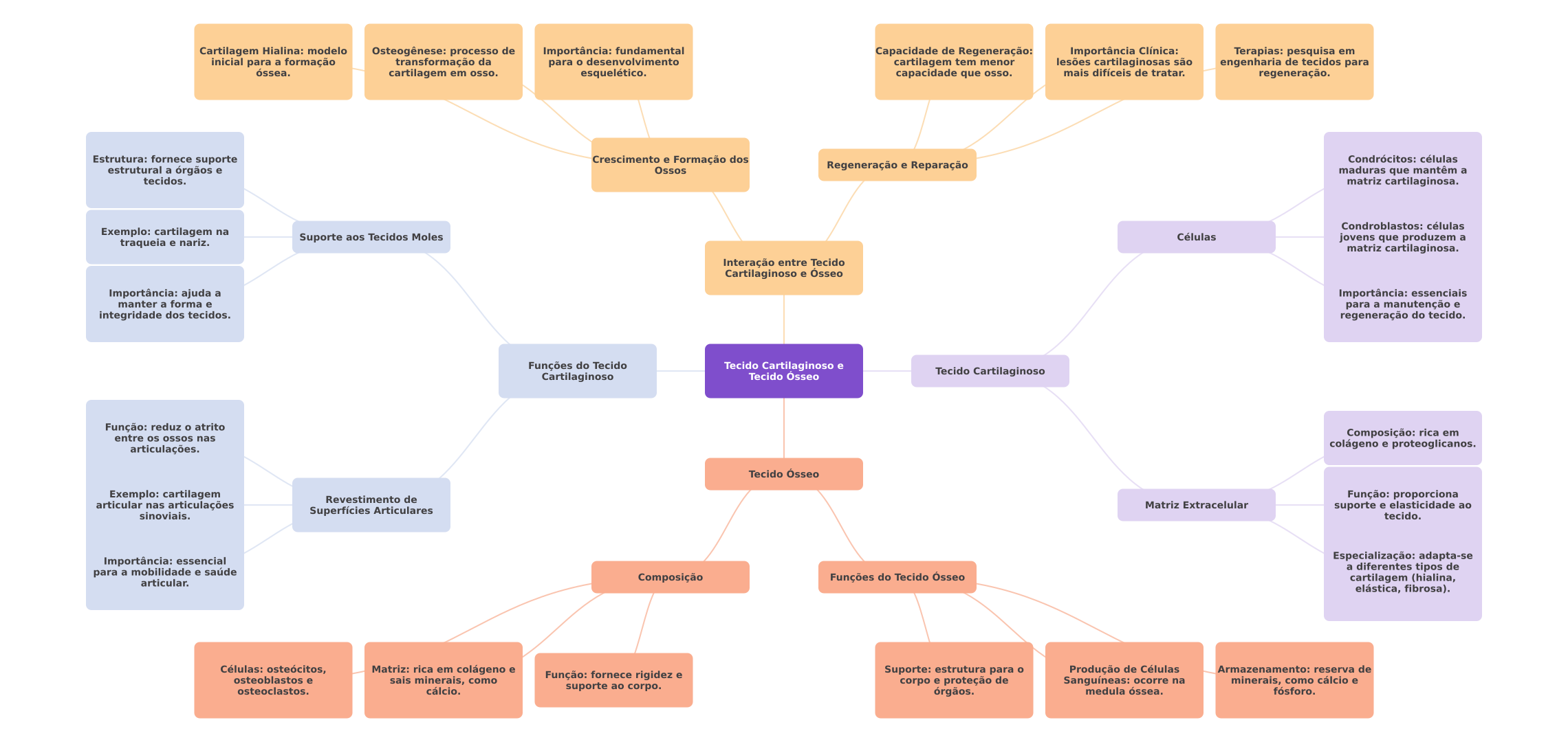 Cartilagem Hialina: modelo Osteogênese: processo de Importância: fundamental Capacidade de Regeneração: Importância Clínica: Terapias: pesquisa em inicial para a formação transformação da para desenvolvimento cartilagem tem menor lesões cartilaginosas são engenharia de tecidos para óssea. cartilagem em osso. esquelético. capacidade que osso. mais difíceis de tratar. regeneração. Estrutura: fornece suporte Crescimento e Formação dos Condrócitos: células estrutural a órgãos e Ossos Regeneração e Reparação maduras que mantêm a tecidos. matriz cartilaginosa. Condroblastos: células Exemplo: cartilagem na Suporte aos Tecidos Moles Células traqueia e nariz. jovens que produzem a matriz cartilaginosa. Interação entre Tecido Cartilaginoso e Ósseo Importância: ajuda a Importância: essenciais manter a forma e para a manutenção e integridade dos tecidos. regeneração do tecido. Funções do Tecido Tecido Cartilaginoso e Cartilaginoso Tecido Ósseo Tecido Cartilaginoso Função: reduz atrito entre os ossos nas Composição: rica em articulações. colágeno e proteoglicanos. Tecido Ósseo Exemplo: cartilagem Revestimento de Função: proporciona articular nas articulações Matriz Extracelular Superfícies Articulares suporte e elasticidade ao sinoviais. tecido. Importância: essencial Especialização: adapta-se para a mobilidade e saúde a diferentes tipos de articular. Composição Funções do Tecido Ósseo cartilagem (hialina, elástica, fibrosa). Células: osteócitos, Matriz: rica em colágeno e osteoblastos e Função: fornece rigidez e Suporte: estrutura para Produção de Células Armazenamento: reserva de sais minerais, como corpo e proteção de Sanguíneas: ocorre na minerais, como cálcio e osteoclastos. cálcio. suporte ao corpo. órgãos. medula óssea. fósforo.