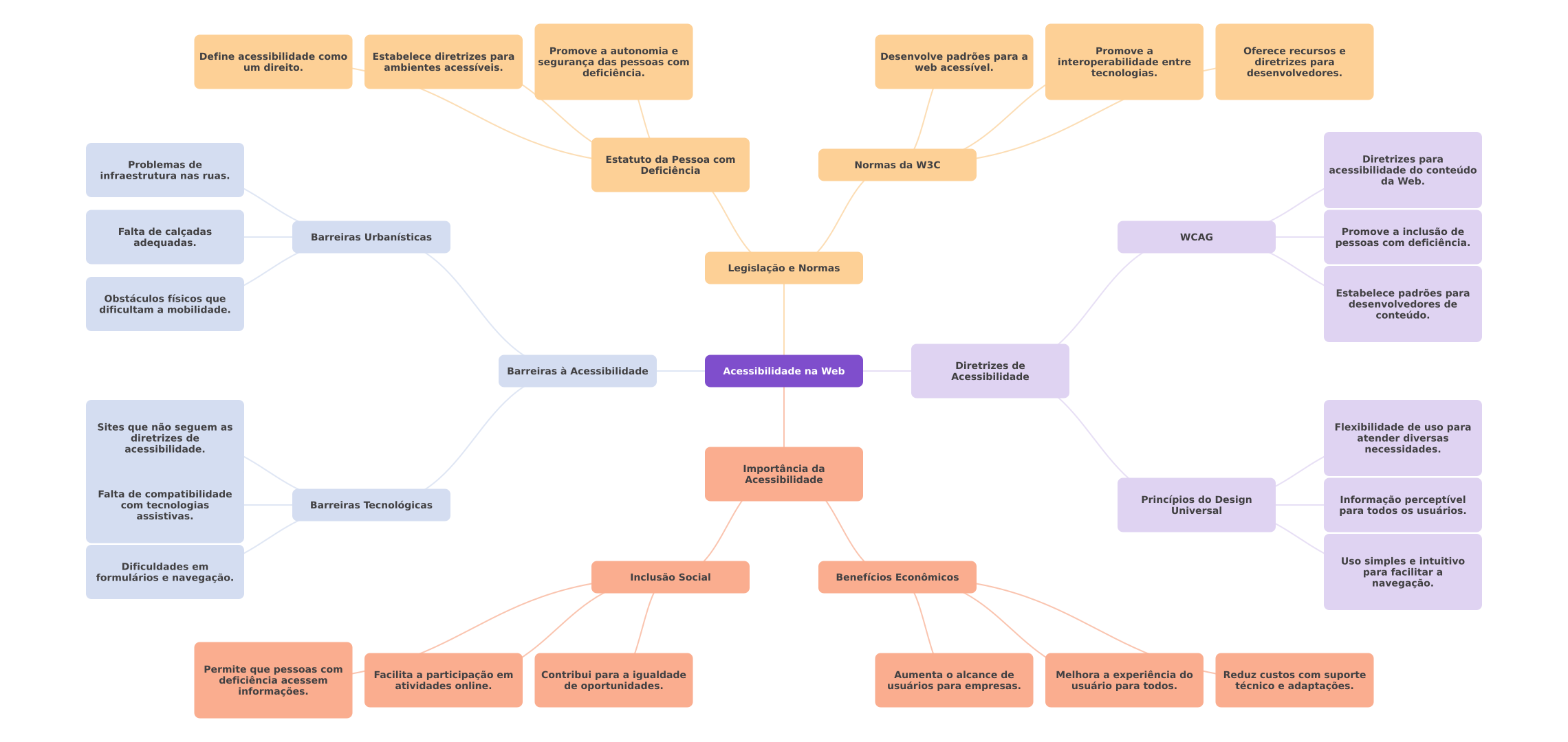 Promove a autonomia e Promove a Oferece recursos e Define acessibilidade como Estabelece diretrizes para um direito. segurança das pessoas com Desenvolve padrões para a ambientes acessíveis. web acessível. interoperabilidade entre diretrizes para deficiência. tecnologias. desenvolvedores. Estatuto da Pessoa com Problemas de Normas da W3C Diretrizes para Deficiência acessibilidade do conteúdo infraestrutura nas ruas. da Web. Falta de calçadas Barreiras Urbanísticas Promove a inclusão de WCAG adequadas. pessoas com deficiência. Legislação e Normas Obstáculos físicos que Estabelece padrões para desenvolvedores de dificultam a mobilidade. conteúdo. Diretrizes de Barreiras à Acessibilidade Acessibilidade na Web Acessibilidade Sites que não seguem as Flexibilidade de uso para diretrizes de atender diversas acessibilidade. necessidades. Importância da Acessibilidade Falta de compatibilidade com tecnologias Princípios do Design Informação perceptível Barreiras Tecnológicas Universal assistivas. para todos os usuários. Dificuldades em Uso simples e intuitivo formulários e navegação. Inclusão Social Benefícios Econômicos para facilitar a navegação. Permite que pessoas com Facilita a participação em Contribui para a igualdade Aumenta alcance de deficiência acessem Melhora a experiência do Reduz custos com suporte atividades online. informações. de oportunidades. usuários para empresas. usuário para todos. técnico e adaptações.