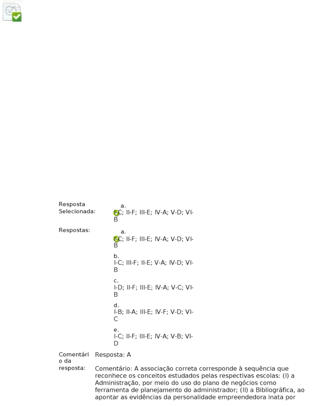 EMPREENDEDORISMO, CRIATIVIDADE E INOVAÇÃO QUESTIONÁRIO I PERGUNTA 1 Os estudiosos do empreendedorismo associaram o tema a seis escolas de pensamento, possibilitando o desenvolvimento de investigações mais específicas por cada uma destas áreas. Nos tópicos a seguir, associe as escolas a seus respectivos temas estudados. Escolas: I) Bibliográfica. II) Liderança. III) Psicológica. IV) Clássica. V) Corporativa. VI) Administração. Temas estudados: a) O papel do empreendedor como o “arquiteto” das coisas que ainda não possui. b) O uso do plano de negócios como ferramenta de planejamento para o administrador. c) Evidências de personalidade empreendedora inata por meio da biografia do empreendedor. d) Como lidar com cenários complexos na perspectiva de empreendedores corporativos. e) A influência da personalidade e crenças do empreendedor sobre o comportamento de outras pessoas. f) A liderança dos empreendedores como catalizadores no engajamento das pessoas para um propósito comum.2 A alternativa que apresenta a associação correta entre escolas e temas estudados é: PERGUNTA 2 De acordo com os estudos de Longenecker e Schoen (1975) foram estabelecidos alguns elementos que corroboram o conceito de “essência do empreendedorismo”. Porém, apenas quando estes elementos ocorrem conjuntamente é que é possível qualificar o empreendedorismo. Entre as alternativas a seguir, qual apresenta, conjuntamente, os elementos essenciais ao empreendedorismo? PERGUNTA 3 Entre as alternativas a seguir, assinale aquela que representa a definição do papel de empresário que o empreendedor assume ao: PERGUNTA 4 Entre os itens a seguir, qual alternativa não representa uma vantagem em tornar-se empreendedor? PERGUNTA 5 Em termos de políticas públicas implementadas em alguns países da Europa e da Ásia desde a década de 1990, é correto afirmar que: PERGUNTA 6 (Enade 2012) Oportunidades de negócio podem ser encontradas por toda parte e sob as mais diversas formas. Para identificá-las, o empreendedor precisa ter predisposição e criatividade. Além disso, precisa conhecer os negócios e o estilo de vida de seus clientes. Com relação ao empreendedorismo, avalie as seguintes afirmações: I. Todo negócio deve atender às necessidades de clientes, mediante a oferta de algum produto ou serviço pelo qual eles estão dispostos a pagar. II. O caminho principal para identificar oportunidades de negócio é pesquisar sobre as necessidades de potenciais clientes que não estão sendo satisfeitas e desenvolver produtos ou serviços para satisfazê-las a um custo compatível com o valor que os clientes estejam dispostos a pagar. III. O levantamento de oportunidades que já foram atendidas é o caminho mais usado pelos empreendedores e normalmente gera boas oportunidades de negócios. IV. O candidato a empreendedor bem-sucedido é aquele que não se cansa de observar os negócios ao seu redor, na constante procura de novas ideias e oportunidades. É correto apenas o que se afirma em: PERGUNTA 7 (Enade 2015) Nos últimos anos, a força empreendedora no Brasil cresceu 47%, alcançando a marca de 6,2 milhões de negócios. O Brasil cria 316 mil novos negócios por ano, sendo o terceiro país mais empreendedor, superado apenas pelos EUA e pelo Reino Unido. Estima-se que, nos próximos anos, essa iniciativa aumente. Pesquisas indicam que 65% dos universitários têm o desejo de ter um negócio próprio no futuro. SEGALA, M.; FAUST, A. Um país de empreendedores. Exame. São Paulo, 2012 (adaptado). Considerando as informações desse texto, avalie as informações a seguir: I. Mudanças de ordem legal, tecnológica, ambiental, cultural ou social fomentam, principalmente, o empreendedorismo social, em que o empreendedor potencial cria um novo negócio. II. Entre os desafios e os riscos que os novos empreendedores enfrentam, estão a necessidade de obtenção de recursos financeiros, a falta de informações precisas acerca do mercado e a possibilidade de insucesso. III. Resultados da pesquisa tecnológica universitária podem ser fontes de oportunidades para novos empreendimentos, a exemplo das startups. É correto o que se afirma em: PERGUNTA 8 (Enade 2015) A concepção de ação empreendedora amplia o escopo dos estudos em empreendedorismo. Trata-se a ação empreendedora como algo que ocorre em situações além da configuração de novos negócios e da definição de novas organizações. Assim, a ação empreendedora permite deslocar o foco da figura do empreendedor como agente solitário de transformação de recursos em atividades produtivas, apresentando características especiais e diferenciadas em relação a outros agentes que, porventura, não tenham tido sucesso na criação, condução ou sustentabilidade de empreendimentos por eles conduzidos. O caráter situacional implica verificar a lógica das ações empreendedoras, na medida em que o foco na lógica da ação privilegia as trajetórias individuais, considerando, no entanto, como se articulam com dinâmicas coletivas, com as características ambientais e com a ação de estruturas econômicas e sociais, identificando-se fatores sociológicos que operam na tomada de decisão de conceber e implantar uma empresa, por exemplo. BORGES, A. F. et aI. Práticas de empreendedorismo em empresas familiares empreendedoras. Disponível em: http: www.anpad.org.br. Acesso em: 12 jul. 2015 (adaptado). Considerando esse contexto, avalie as asserções a seguir e a relação proposta entre elas: I. O empreendedorismo pode ser entendido como uma prática que está para além da abertura de determinado negócio. Porque II. O empreendedor pode tomar decisões e contribuir para o desenvolvimento de pessoas, tecnologias e processos, ações que, no ambiente corporativo, permitem ao profissional empreendedor atuar ativamente em um contexto de mudanças na organização. A respeito dessas asserções, assinale a opção correta. PERGUNTA 9 (Enade 