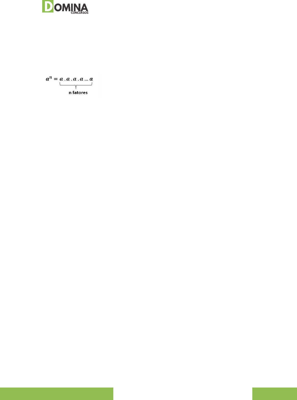 POTENCIAÇÃO 1 WWW.DOMINACONCURSOS.COM.BR Potenciação A potenciação ou exponenciação é a operação matemática que representa a multiplicação de fato- res iguais. Ou seja, usamos a potenciação quando um número é multiplicado por ele mesmo várias vezes. Para escrever um número na forma de potenciação usamos a seguinte notação: Sendo a ≠ 0, temos: a: Base (número que está sendo multiplicado por ele mesmo) n: Expoente (número de vezes que o número é multiplicado) Para melhor entender a potenciação, no caso do número 23 (dois elevado a terceira potência ou dois elevado ao cubo), tem-se: 23 = 2 x 2 x 2 = 4 x 2 = 8 Sendo, 2: Base 3: Expoente 8: Potência (resultado do produto) Exemplos de Potenciação 52: lê-se 5 elevado à segunda potência ou 5 ao quadrado, donde: 5 x 5 = 25 Logo, A expressão 52 equivale a 25. 33: lê-se 3 elevado à terceira potência ou 3 ao cubo, donde: 3 x 3 x 3 = 27 Logo, A expressão 33 equivale a 27. Propriedades da Potenciação Toda potência com expoente igual a zero, o resultado será 1, por exemplo: 50=1 Toda potência com expoente igual 1, o resultado será a própria base, por exemplo: 81 = 8 Quando a base for negativa e o expoente um número ímpar, o resultado será negativo, por exemplo: (- 3)3 = (- 3) x (- 3) x (- 3) = - 27. Quando a base for negativa e o expoente um número par, o resultado será positivo, por exemplo: (- 2)2 = (- 2) x (- 2) = +4 Quando o expoente for negativo, inverte-se a base e muda-se o sinal do expoente para posi- tivo, por exemplo: (2)- 4 = (1/2)4 = 1/16 POTENCIAÇÃO 2 WWW.DOMINACONCURSOS.COM.BR Nas frações, tanto o numerador quanto o denominador ficam elevados ao expoente, por exemplo: (2/3)3 = (23 / 33) = 8/27 Multiplicação e Divisão de Potências Na multiplicação das potências de bases iguais, mantém-se a base e soma-se os expoentes: ax . ay = ax+y 52.53= 52+3= 55 Na Divisão das potências de bases iguais, mantém-se a base e subtrai-se os expoentes: (ax) / (ay) = ax-y (53) / (52) = 53-2 = 51 Quando a base está entre parênteses e há outro expoente fora (potência de potência), mantém-se a base e multiplica-se os expoentes: (ax)y = ax.y (32)5= 32.5 = 310 Potenciação: Propriedades e Exemplos Potenciação ou exponenciação é a forma de abreviar a multiplicação de uma sequência de fatores iguais. Dessa forma, quando multiplicamos um número sucessivas vezes, podemos abreviar elevando-o a quantidade de vezes que o número é multiplicado. Definição de potenciação Seja um número real a e um número natural n, com n > 1, chamamos de potência de base a e expo- ente n o número an, isto é, o produto de n fatores iguais a a. Exemplo: a² = a.a, com n = 2; a³ = a.a.a, com n = 3; a5 = a.a.a.a.a, com n = 5; Chamamos a de base e n de expoente, e a multiplicação sucessiva após a igualdade chamamos de potência. A base nesse caso é o número que se repete, o expoente é a quantidade de vezes que esse número se repetiu e a potência é o resultado. Potência com expoente negativo Seja a um número real diferente de zero, e n um número natural, chamamos de potência de base a e expoente -n o número a-n, que é o número inverso de an. Exemplo: POTENCIAÇÃO 3 WWW.DOMINACONCURSOS.COM.BR Seja a multiplicação 3 x 3 x 3 x 3, temos uma sequência do número 3 multiplicado 4 vezes. Assim, po- demos simplificar da seguinte forma: Leia-se: três elevado a quatro é igual a oitenta e um onde, 3 é o número multiplicado e 4 a quantidade de vezes que ele foi multiplicado. Agora com expoente negativo. Outros tipos de potência Expoente inteiro maior que 1. Neste caso é o produto de vários fatores iguais à base de acordo com quantas forem as unidades do expoente. Exemplo: 4³ = 4 x 4 x 4 = 64 5² = 5 x 5 = 25 Expoente igual a 1. Neste caso, todas as potências com expoente 1 é igual a base. Logo: a¹ = a Exemplo: 2¹ = 2; 25¹ = 25 Expoente igual a zero. Neste caso, todas as potências com expoente igual a zero é igual a 1. Logo: a0 = 1 Exemplo: 30 = 1 80 = 1 Casos particulares de potenciação: Sendo n um número inteiro, podemos ter: a = 0 e n > 0 ⇒ an = 0 a = 0 e n < 0 ⇒ não existe an ∈ R a > 0 ⇒ an > 0 POTENCIAÇÃO 4 WWW.DOMINACONCURSOS.COM.BR a < 0 e n par ⇒ an > 0 a < 0 e n ímpar ⇒ an < 0 Propriedades da potenciação Considerando as bases a e b números reais, e os números naturais para m e n. Temos as seguintes propriedades: Qualquer número real elevado ao expoente natural 1 é igual ao próprio número. Exemplo: 5¹ = 5 Qualquer número real não-nulo elevado ao expoente natural 0 é igual a 1. Exemplo: 30 = 1 Qualquer potência que possui na base o número 1 é igual a 1. Exemplo: 1100 = 1 Qualquer potência que tem na base o número 10, o resultado é o número 1 seguido da quantidade de zeros, de acordo com o valor do expoente. Exemplo: 105 = 100000 Veja que a quantidade de zeros foi definida pelo expoente 5. Um potência com expoente negativo indica que temos uma inversão entre o numerador com o denomi- nador. Veja que a potência foi para o denominador sem o sinal, e o numerador é representado pelo número 1 (oculto) do denominador. Uma potência negativa no denominador é equivalente ao numerador vezes o denominador com o sinal da potência trocado. Exemplo: e No primeiro caso o 1 (um) pode ser omitido porque não altera o valor do produto, 1 x 5² = 5² = 25. POTENCIAÇÃO 5 WWW.DOMINACONCURSOS.COM.BR Propriedades operatórias da potenciação É importante conhecer as propriedades operatórias para auxiliar e simplificar os cálculos envolvendo potenciação. Produto de potências de mesma base Ao multiplicar duas ou mais potências de mesma base, devemos proceder da seguinte forma: conser- var a base e somar os expoentes. am.an = am + n Exemplo: 52.53 = 52 + 3 Divisão de potências de mesma base Ao dividirmos potências não-nulas de mesma base, devemos proceder da seguinte forma: conservar a base e subtrair os expoentes. Exemplo: Base negativ