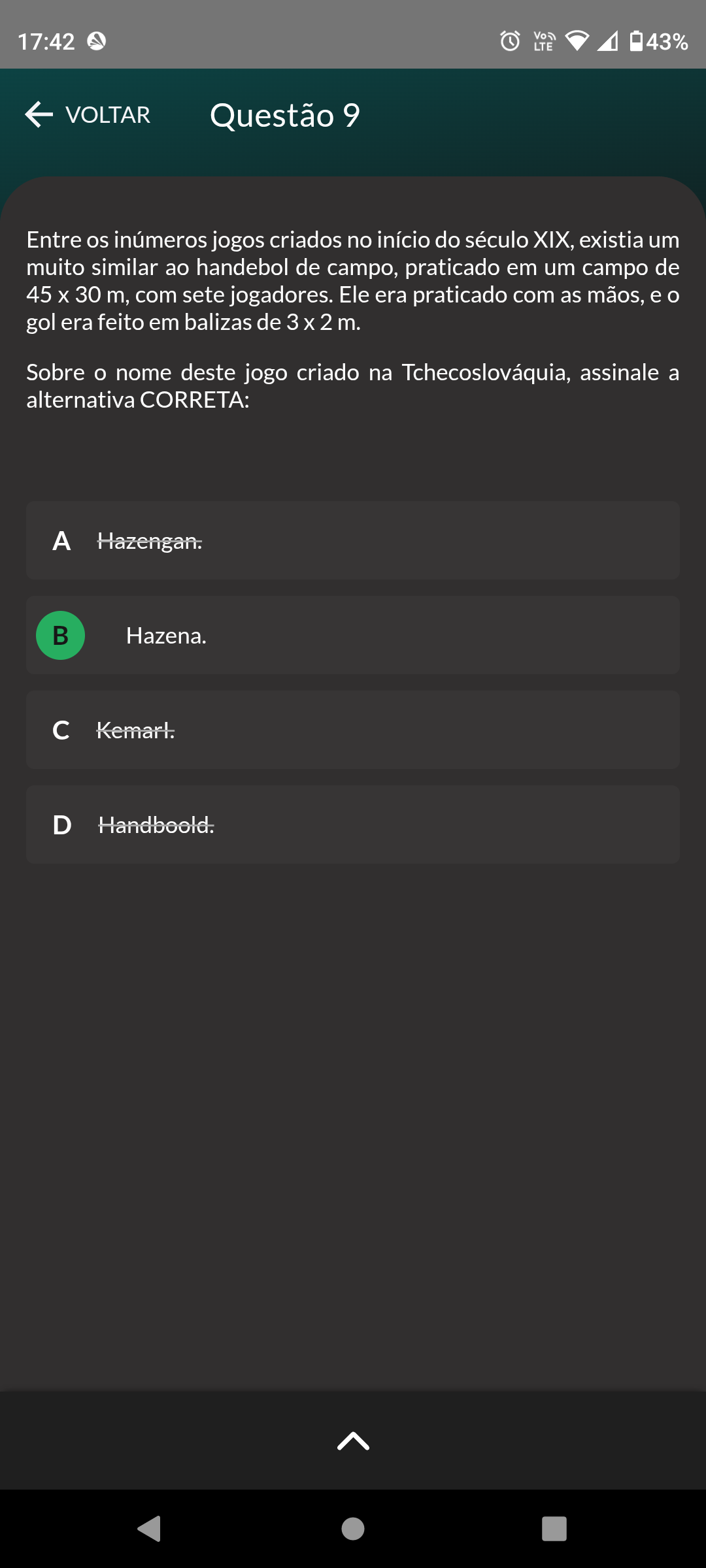 17:42 LTE 1 43% VOLTAR Questão 9 Entre os inúmeros jogos criados no início do século XIX, existia um muito similar ao handebol de campo, praticado em um campo de 45 X 30 m, com sete jogadores. Ele era praticado com as mãos, e o gol era feito em balizas de 3 X 2 m. Sobre o nome deste jogo criado na Tchecoslováquia, assinale a alternativa CORRETA: A Hazengan. Hazena. c Kemarl. D Handboold.