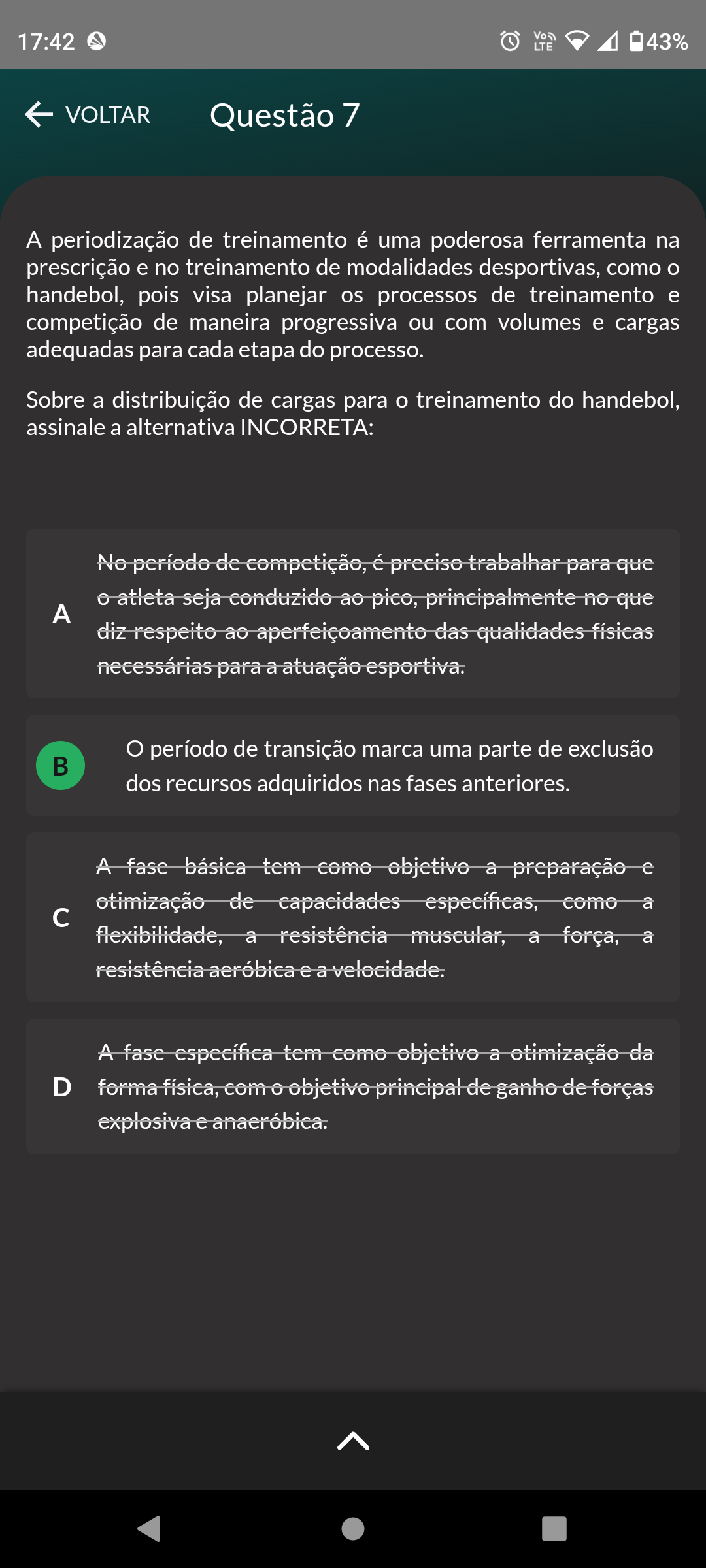 17:42 LTE 43% VOLTAR Questão 7 A periodização de treinamento é uma poderosa ferramenta na prescrição e no treinamento de modalidades desportivas, como handebol, pois visa planejar os processos de treinamento e competição de maneira progressiva ou com volumes e cargas adequadas para cada etapa do processo. Sobre a distribuição de cargas para treinamento do handebol, assinale a alternativa INCORRETA: No período de competição, é preciso trabalhar para que atleta seja conduzido ao pico, principalmente no que diz respeito ao aperfeiçoamento das qualidades físicas necessárias para a atuação esportiva. período de transição marca uma parte de exclusão B dos recursos adquiridos nas fases anteriores. A fase básica tem como objetivo a preparação e otimização de capacidades específicas, como a c flexibilidade, a resistência muscular, a força, a resistência aeróbica ea velocidade. A fase específica tem como objetivo a otimização da D forma física, com objetivo principal de ganho de forças explosiva e anaeróbica.