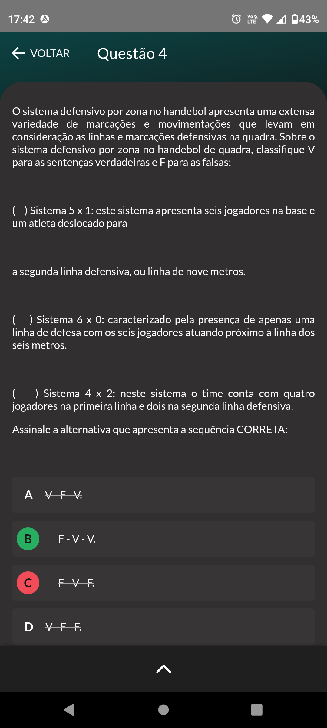 17:42 LTE 1 43% VOLTAR Questão 4 sistema defensivo por zona no handebol apresenta uma extensa variedade de marcações e movimentações que levam em consideração as linhas e marcações defensivas na quadra. Sobre sistema defensivo por zona no handebol de quadra, classifique V para as sentenças verdadeiras e F para as falsas: Sistema 5 X 1: este sistema apresenta seis jogadores na base e um atleta deslocado para a segunda linha defensiva, ou linha de nove metros. ( ) Sistema 6 X caracterizado pela presença de apenas uma linha de defesa com os seis jogadores atuando próximo à linha dos seis metros. ( ) Sistema 4 X 2: neste sistema time conta com quatro jogadores na primeira linha e dois na segunda linha defensiva. Assinale a alternativa que apresenta a sequência CORRETA: A B F-V-F. D