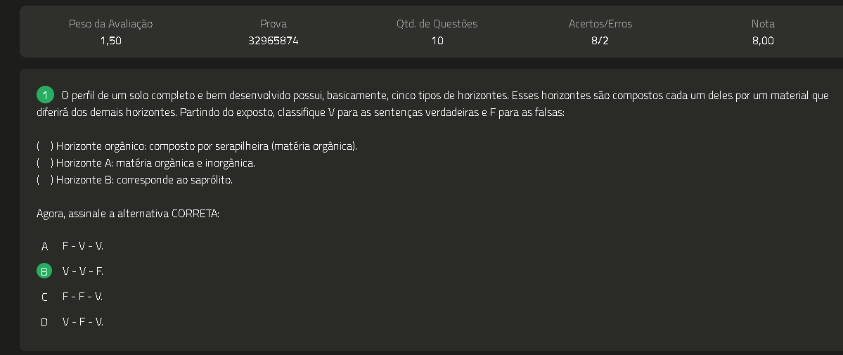 Peso da Avaliação Prova Qtd. de Questões Acertos/Erros Nota 1,50 32965874 10 8/2 8,00 1 0 perfil de um solo completo e bem desenvolvido possui, basicamente, cinco tipos de horizontes. Esses horizontes são compostos cada um deles por um material que dos demais horizontes. Partindo do exposto, classifique V para as sentenças verdadeiras eF para as falsas: ( ) Horizonte orgânico: composto por serapilheira (matéria orgânica). ( ) Horizonte A: matéria orgânica e inorgânica. ( ) Horizonte B: corresponde ao saprólito. Agora, assinale a alternativa CORRETA: A C F F V. D