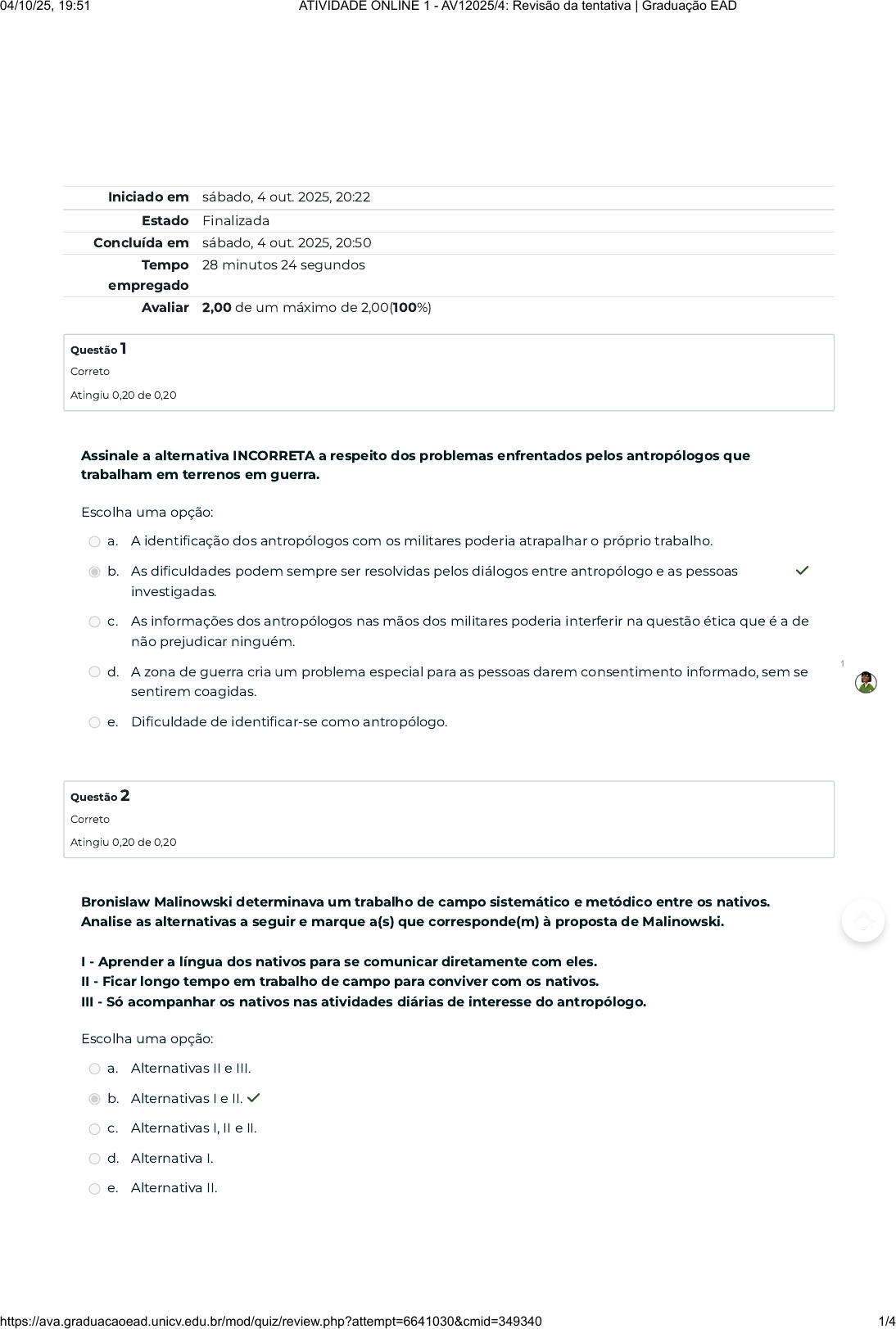 Iniciado em sábado, 4 out. 2025, 20:22 Estado Finalizada Concluída em sábado, 4 out. 2025, 20:50 Tempo empregado 28 minutos 24 segundos Avaliar 2,00 de um máximo de 2,00(100%) Questão 1 Correto Atingiu 0,20 de 0,20 Questão 2 Correto Atingiu 0,20 de 0,20 Assinale a alternativa INCORRETA a respeito dos problemas enfrentados pelos antropólogos que trabalham em terrenos em guerra. Escolha uma opção: a. A identificação dos antropólogos com os militares poderia atrapalhar o próprio trabalho. b. As dificuldades podem sempre ser resolvidas pelos diálogos entre antropólogo e as pessoas investigadas. ✓ c. As informações dos antropólogos nas mãos dos militares poderia interferir na questão ética que é a de não prejudicar ninguém. d. A zona de guerra cria um problema especial para as pessoas darem consentimento informado, sem se sentirem coagidas. e. Dificuldade de identificar-se como antropólogo. Bronislaw Malinowski determinava um trabalho de campo sistemático e metódico entre os nativos. Analise as alternativas a seguir e marque a(s) que corresponde(m) à proposta de Malinowski. I - Aprender a língua dos nativos para se comunicar diretamente com eles. II - Ficar longo tempo em trabalho de campo para conviver com os nativos. III - Só acompanhar os nativos nas atividades diárias de interesse do antropólogo. Escolha uma opção: a. Alternativas II e III. b. Alternativas I e II. ✓ c. Alternativas I, II e II. d. Alternativa I. e. Alternativa II. 1 04/10/25, 19:51 ATIVIDADE ONLINE 1 - AV12025/4: Revisão da tentativa | Graduação EAD https://ava.graduacaoead.unicv.edu.br/mod/quiz/review.php?attempt=6641030&cmid=349340 1/4 Questão 3 Correto Atingiu 0,20 de 0,20 Questão 4 Correto Atingiu 0,20 de 0,20 Questão 5 Correto Atingiu 0,20 de 0,20 Qual é a relação entre teoria e prática na Escola de Frankfurt? Escolha uma opção: a. Depois de formulada a teoria, a prática atesta sua veracidade. b. A teoria deve estar ancorada à prática. ✓ c. A prática da teoria se dá somente na pesquisa. d. Teoria serve para pesquisar a prática com distanciamento. e. Na prática a teoria é diferente. É uma das características do pensamento de Durkheim: Escolha uma opção: a. O estudo da dominação burocrática b. A preocupação com a ordem ✓ c. O positivismo d. O estudo da democracia nos Estados Unidos da América e. A luta de classes Os relatórios etnográficos podem incluir dados de dois ou mais períodos em campo. Pode-se até acompanhar pessoas estudadas quando elas se mudam de uma aldeia para uma cidade, atravessam fronteiras ou fazem viagens internacionais. Sobre essas pesquisas, marque a alternativa correta: Escolha uma opção: a. A ideia de uma pesquisa multitemporal está ligada à necessidade de se debruçar muito tempo sob uma mesma cultura. b. A geografia nunca foi problema para os antropólogos. c. A etnografia hoje está cada vez mais voltada a um estudo multitemporal. ✓ d. Podemos afirmar que desde sempre realizou-se a pesquisa longitudinal. e. A pesquisa longitudinal nunca poderia ser realizada em grupos. 1 04/10/25, 19:51 ATIVIDADE ONLINE 1 - AV12025/4: Revisão da tentativa | Graduação EAD https://ava.graduacaoead.unicv.edu.br/mod/quiz/review.php?attempt=6641030&cmid=349340 2/4 Questão 6 Correto Atingiu 0,20 de 0,20 Questão 7 Correto Atingiu 0,20 de 0,20 Questão 8 Correto Atingiu 0,20 de 0,20 Para ser antropólogo cultural, costuma-se estudar Etnografia (o estudo em primeira mão e pessoal de contextos locais). Sobre o trabalho do etnógrafo, marque a alternativa correta: Escolha uma opção: a. Odores e barulhos que as pessoas fazem, de tão básicos e naturais, não importam à pesquisa. b. Para uma pesquisa de campo, seis meses são suficientes para uma coleta bem realizada de informações. c. Os etnógrafos quase nunca se acostumam com os costumes do local. d. A Etnografia é um processo de pesquisa em que o antropólogo observa, registra e se envolve na vida diária de outra cultura. ✓ e. O método da observação participante não é característico da Etnografia. O conhecimento baseado em crenças culturais aceitas dentro de uma sociedade é chamado de: Escolha uma opção: a. Antropologia. b. Senso comum. ✓ c. Religião. d. Sociologia. e. História. "Os povos combatem entre si sem arte e sem ordem. Os velhos com certas perorações inclinam os jovens ao seu querer, incitando-os à batalha, na qual se matam com crueldade: e aqueles que na batalha são feitos cativos, não vivos, antes para seu alimento servem, por ocasião de sua morte; pois que os vencedores comem os vencidos, e das carnes a humana é entre eles alimento comum.” (Carta de Américo Vespúcio, de 1503, sobre sua viagem ao Novo Mundo) Aponte a qual momento da Antropologia esse relato corresponde. Escolha uma opção: a. Pós-modernistas. b. Primeiros viajantes europeus. ✓ c. Funcionalistas. d. Interpretativistas. e. Estruturalistas. 1 04/10/25, 19:51 ATIVIDADE ONLINE 1 - AV12025/4: Revisão da tentativa | Graduação EAD https://ava.graduacaoead.unicv.edu.br/mod/quiz/review.php?attempt=6641030&cmid=349340 3/4 Questão 9 Correto Atingiu 0,20 de 0,20 Questão 10 Correto Atingiu 0,20 de 0,20 A antropologia é a pesquisa da diversidade humana no tempo e no espaço, estudando o conjunto da condição humana: passado, presente e futuro, biologia, sociedade, língua e cultura. Sobre o trabalho de pesquisa dos etnógrafos, marque a alternativa correta: Escolha uma opção: a. As entrevistas não são métodos comuns utilizados pelos etnógrafos. b. Na observação participante, o etnógrafo acaba por se confundir com um integrante da cultura. ✓ c. A genealogia não é algo que importa aos etnógrafos. d. O casamento não é uma instituição importante nas sociedades pós-industriais. e. Os interlocutores culturais chave não são bem vistos pelos etnógrafos. Para Weber o desenvolvimento da sociedade moderna foi acompanhado por importantes mudanças de ação social, o