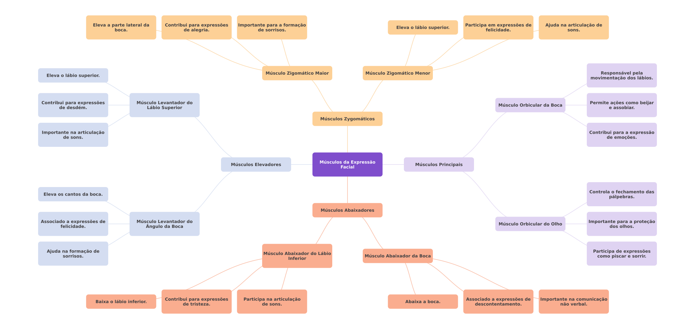 Eleva a parte lateral da Contribui para expressões Importante para a formação Eleva lábio superior. Participa em expressões de Ajuda na articulação de boca. de alegria. de sorrisos. felicidade. sons. Eleva lábio superior. Músculo Zigomático Maior Músculo Zigomático Menor Responsável pela movimentação dos lábios. Contribui para expressões Músculo Levantador do Músculo Orbicular da Boca Permite ações como beijar de desdém. Lábio Superior e assobiar. Músculos Zygomáticos Importante na articulação Contribui para a expressão de sons. de emoções. Músculos Elevadores Músculos da Expressão Facial Músculos Principais Controla fechamento das Eleva os cantos da boca. pálpebras. Músculos Abaixadores Associado a expressões de Músculo Levantador do Músculo Orbicular do Olho Importante para a proteção felicidade. Ängulo da Boca dos olhos. Ajuda na formação de Músculo Abaixador do Lábio Participa de expressões sorrisos. Músculo Abaixador da Boca Inferior como piscar e sorrir. Baixa lábio inferior. Contribui para expressões Participa na articulação Abaixa a boca. Associado a expressões de Importante na comunicação de tristeza. de sons. descontentamento. não verbal.