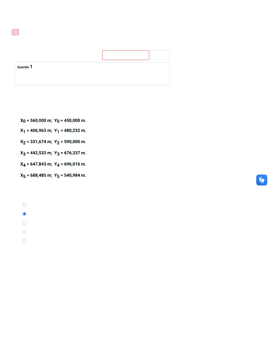 Ainda não respondida Vale 2,00 ponto(s). Obtendo-se as coordenadas cartesianas (X, Y) de um levantamento topográ�co planimétrico de seis pontos abaixo, a distância plana entre os pontos 1 e 4, é: Escolha uma opção: a. 468,036 m b. 323,397 m c. 456,664 m d. 456,664 dm e. 87,687 m Limpar minha escolha Tempo restante 4:53:01 Ocultar Questionário - Semana 3 | AVA - Campus Inconfidentes https://ifs.ava.ifsuldeminas.edu.br/mod/quiz/attempt.php?attempt=237... 1 of 4 04/10/2025, 20:06 https://ifs.ava.ifsuldeminas.edu.br/mod/quiz/attempt.php?attempt=237147&cmid=80029# https://ifs.ava.ifsuldeminas.edu.br/mod/quiz/attempt.php?attempt=237147&cmid=80029# Ainda não respondida Vale 3,00 ponto(s). Ainda não respondida Vale 3,00 ponto(s). Ainda não respondida Vale 3,00 ponto(s). Utilizando-se dos dados da o perímetro do polígono (0-1-2-3-4-5), é: Escolha uma opção: a. 976,985 m b. 948,665 m c. 926,345 m d. 922,478 m e. 953,574 m Utilizando-se dos dados da o azimute verdadeiro da direção do ponto 1 para o ponto 2, é: Escolha uma opção: a. 325º 33' 15" b. 145º 33' 15" c. 34º 26' 45" d. -34º 26' 45" e. 55º 33' 15" Utilizando-se dos dados da o rumo verdadeiro da direção do ponto 2 para o ponto 1, é: Escolha uma opção: a. 55º 33' 15" SW b. 55º 33' 15" NW c. 34º 26' 45" NW d. 34º 26' 45" SW e. 34º 26' 45" SE Questionário - Semana 3 | AVA - Campus Inconfidentes https://ifs.ava.ifsuldeminas.edu.br/mod/quiz/attempt.php?attempt=237... 2 of 4 04/10/2025, 20:06 Ainda não respondida Vale 3,00 ponto(s). Ainda não respondida Vale 3,00 ponto(s). Ainda não respondida Vale 3,00 ponto(s). Utilizando-se dos dados da o ângulo interno no ponto 4 do polígono (0-1-2-3-4-5), é: Escolha uma opção: a. 97º 25' 14" b. 102º 22' 17" c. 95º 14' 25" d. 89º 22' 16" e. 99º 12' 54" Utilizando-se dos dados da a área plana do polígono (3-0-5-4), é: Escolha uma opção: a. 37.478,91 m2 b. 36.198,99 m2 c. 34.298,59 m2 d. 39.128,33 m2 e. 40.187,22 m2 Utilizando-se dos dados da a ordenada do ponto A (XA = 400 m) para que o polígono (0-1-2-3) tenha uma ampliação de 4.000 m2, formando o novo polígono (0-1-2-A-3), é: Escolha uma opção: a. 715,376 m b. 728,456 m c. 712,496 m d. 812,324 m e. 695,453 m Questionário - Semana 3 | AVA - Campus Inconfidentes https://ifs.ava.ifsuldeminas.edu.br/mod/quiz/attempt.php?attempt=237... 3 of 4 04/10/2025, 20:06 Questionário - Semana 3 | AVA - Campus Inconfidentes https://ifs.ava.ifsuldeminas.edu.br/mod/quiz/attempt.php?attempt=237... 4 of 4 04/10/2025, 20:06
