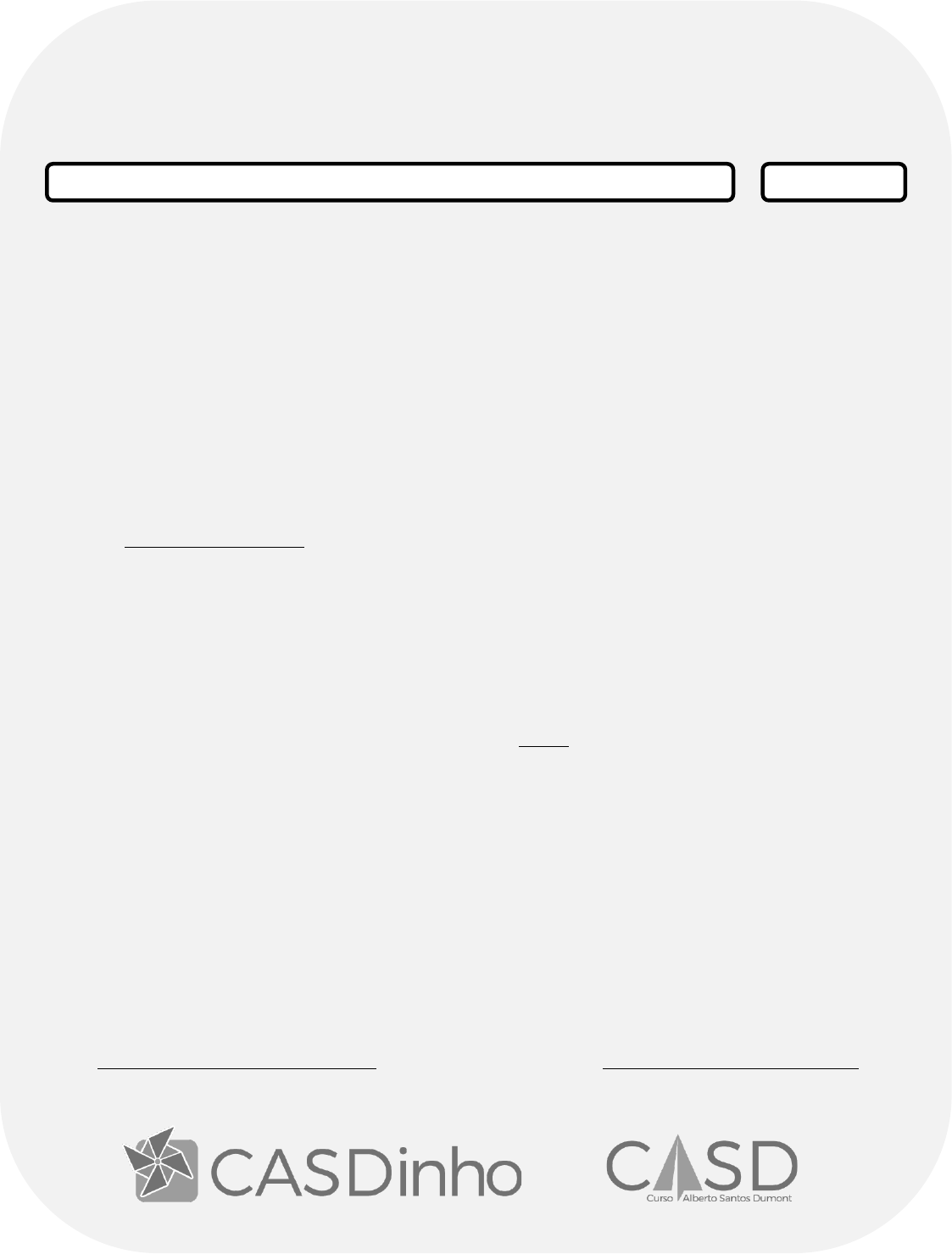 Prova de Português e Matemática Vestibulinho CASDinho 2022 Nome Inscrição Caro(a) candidato(a), leia atentamente as informações abaixo: 1. Você recebeu um cartão-resposta e este caderno contendo 40 questões objetivas; 2. Leia cuidadosamente as questões e escolha a resposta que você considera correta. Procure responder todas as questões; 3. O cartão-resposta será o único documento utilizado para a correção da prova; 4. Marque apenas uma alternativa para cada questão. Caso o candidato marque mais de uma alternativa, perderá os pontos da questão, mesmo que uma das alternativas marcadas seja a correta; 5. Preencha corretamente o número de inscrição no cartão-resposta. Em caso de erro, você pode solicitar ao fiscal um novo cartão-resposta. A entrega de cartão-resposta com preenchimento incorreto da inscrição levará à eliminação do candidato no processo seletivo; 6. Você terá 2 horas e 30 minutos para responder as questões objetivas. Não haverá tempo adicional para o preenchimento do cartão-resposta; 7. Assinale no cartão-resposta, com caneta de tinta azul ou preta, a alternativa que julgar certa (não serão aceitos preenchimentos feitos a lápis); 8. Não é permitido o uso de instrumentos de desenho, calculadoras ou quaisquer outros aparelhos eletrônicos, como celulares. Utilize apenas lápis, borracha, lapiseira, caneta e régua; 9. Essa prova deve ser realizada sem consulta a materiais didáticos ou a outras pessoas; 10. A saída do candidato do prédio só será permitida após 1 hora do início da prova; 11. Ao terminar a prova, você deverá entregar ao fiscal o cartão-resposta. Você poderá levar este caderno de questões apenas caso permaneça até o final das 2 horas e 30 minutos de prova; 12. Mantenha o celular desligado e, se possível, sem bateria durante toda a duração da prova. 13. O candidato deve respeitar o distanciamento social de pelo menos dois metros e estar, obrigatoriamente, de máscara. Caso o candidato não possua máscara, ele pode pedir uma na administração do curso. 14. O CASD irá distribuir álcool em gel para os candidatos. É importante manter-se higienizado. 15. Respeite os locais indicados para permanência em local de prova. Idas ao banheiro serão feitas acompanhadas com supervisão. Boa prova! O gabarito será disponibilizado amanhã na página oficial www.cursosantosdumont.org.br e na página do Facebook www.facebook.com/casdinho Esteja atento para a divulgação da lista de convocados para a prova de 2ª fase presencial. Para mais informações, acompanhe a nossa página ou ligue para (12) 3947-7947. Vestibulinho 2022 1 PORTUGUÊS Questão 1 Dalva Foi no barbeiro. Chegou um rapaz que cumprimentou efusivamente o freguês da cadeira ao meu lado. - Há quanto tempo! E começou a perguntar por amigos comuns, pelos negócios, pela vida. - E a Dalva, ainda está lá com você? - Não, a Dalva agora tem um escritório dela mesma. Está muito bem. - Que é que ela faz? - Ela... empurra papel na Cexim. Não há dúvida, Marx simplificava demasiado as coisas, falando em proletariado e burguesia. No Rio as Classes são muito mais numerosas, e as profissões surgem do dia para a noite. Não sei se já existe um Sindicato de Empurradores de Papel; mas a profissão já existe, pois a Dalva a exerce e está muito bem. Aliás fui informado, pelo resto da conversa, de que Dalva é uma boa pequena, muito inteligente e correta, e que sabe se defender. Mas sempre imagino que São Pedro, que não acompanha de perto a vida carioca, ficará um pouco perplexo, quando a Dalva lhe aparecer e ele perguntar: - Que é que você fazia lá embaixo, minha filha? E ouvir: - Eu empurrava papel. É por isso que o Brasil não progride, dirá um pessimista. Tolice. É graças a isso que o Brasil vai para a frente. Nossa vida é toda feita através de papéis, e na Cexim cada papel é apresentado em várias vias. Se não houver alguém para empurrar esses papéis todos, a vida nacional fica paralisada. Não exportamos nem importamos. Dalva é uma heroína obscura do momento nacional. Se o Sr. Getúlio Vargas tivesse mais imaginação, mandaria escrever seu nome no Livro do Mérito, com esta singela e única explicação: “Ela empurra papel”. Rubem Braga A partir da leitura da crônica “Dalva”, de Rubem Braga, é INCORRETA a afirmação exposta na alternativa: a) Dalva é representada de maneira desvalorizada pela conversa ocorrida na barbearia, e o autor critica, utilizando a ironia, tal desvalorização. b) O narrador pode ser caracterizado como personagem, como é revelado no trecho “Fui informado, pelo resto da conversa...”. c) Dalva é representada de maneira desvalorizada pela conversa ocorrida na barbearia, e o autor reforça, utilizando a ironia, tal desvalorização. d) No trecho “É por isso que o Brasil não progride, dirá um pessimista. Tolice. É graças a isso que o Brasil vai para a frente”, o autor critica explicitamente a desvalorização de profissões como a de Dalva. e) O autor pode ser caracterizado como irônico, como é revelado no trecho "Não sei se já existe um Sindicato de Empurradores de Papel; mas a profissão já existe". Questão 2 Textos para a questão: Texto I. La Dantas. Disponível em: instagram.com/desenhosecafe Vestibulinho 2022 2 Texto II. Jean Galvão. Disponível em: instagram.com/jeangalvao Texto III. Suricate Seboso. Disponível em: instagram.com/suricateseboso Supondo que todas as frases ditas pelas personagens das tirinhas dadas poderiam ser usadas numa situação comunicativa real sem parecerem estranhas para os falantes envolvidos, assinale a alternativa que indica em quais das tirinhas ambas as personagens estão falando em alguma variedade linguística (mesmo que não sejam ambas na mesma variedade): a) II b) III c) I e II d) I e III e) I, II e III Questão 3 O isolamento social, em especial o ato de ficar em casa, foi uma medida preventiva adotada pelo governo para conter a prop