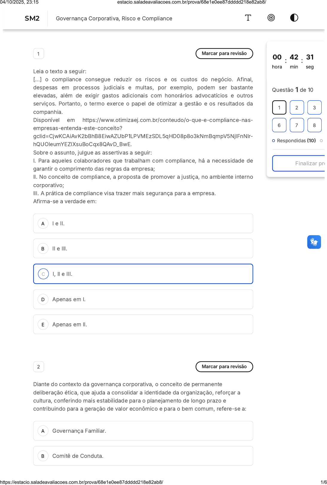 A B C D E A B 1 Marcar para revisão Leia o texto a seguir: [...] o compliance consegue reduzir os riscos e os custos do negócio. Afinal, despesas em processos judiciais e multas, por exemplo, podem ser bastante elevadas, além de exigir gastos adicionais com honorários advocatícios e outros serviços. Portanto, o termo exerce o papel de otimizar a gestão e os resultados da companhia. Disponível em https://www.otimizaej.com.br/conteudo/o-que-e-compliance-nas- empresas-entenda-este-conceito? gclid=CjwKCAiAvK2bBhB8EiwAZUbP1LPVMEzSDL5qHD08p8o3kNmBqmpV5NjIFnNlr- hQUOleumYEZlXsuBoCqx8QAvD_BwE. Sobre o assunto, julgue as assertivas a seguir: I. Para aqueles colaboradores que trabalham com compliance, há a necessidade de garantir o comprimento das regras da empresa; II. No conceito de compliance, a proposta de promover a justiça, no ambiente interno corporativo; III. A prática de compliance visa trazer mais segurança para a empresa. Afirma-se a verdade em: I e II. II e III. I, II e III. Apenas em I. Apenas em II. 2 Marcar para revisão Diante do contexto da governança corporativa, o conceito de permanente deliberação ética, que ajuda a consolidar a identidade da organização, reforçar a cultura, conferindo mais estabilidade para o planejamento de longo prazo e contribuindo para a geração de valor econômico e para o bem comum, refere-se a: Governança Familiar. Comitê de Conduta. 00 hora : 42 min : 31 seg Questão 1 de 10 Respondidas (10) Finalizar pro 1 2 3 6 7 8 SM2 Governança Corporativa, Risco e Compliance 04/10/2025, 23:15 estacio.saladeavaliacoes.com.br/prova/68e1e0ee87ddddd218e82ab8/ https://estacio.saladeavaliacoes.com.br/prova/68e1e0ee87ddddd218e82ab8/ 1/6 C D E A B C D E A B Compliance. Conselho Fiscal. Conselho da Administração. 3 Marcar para revisão A palavra compliance vem do verbo em inglês to comply, que significa agir de acordo com uma ordem, um conjunto de regras ou um pedido. Os verbos abaixo podem expressar a palavra compliance, exceto: Cumprir. Satisfazer. Executar. Obedecer. Elaborar. 4 Marcar para revisão O termo compliance deriva da expressão em inglês to comply, que pode ser traduzido como cumprir. Sobre o assunto, julgue as assertivas a seguir: I. Nos negócios, ele se refere ao alinhamento às diversas normas existentes, como leis e regulamentos complementares; II. Tem uma relação direta com o cumprimento das obrigações e o funcionamento dos processos internos; III. A compliance colabora com a criação de um ambiente de trabalho saudável. Isso porque as leis trazem diversos pontos que buscam o bem-estar dos colaboradores. Afirma-se a verdade em: I e II. II e III. 04/10/2025, 23:15 estacio.saladeavaliacoes.com.br/prova/68e1e0ee87ddddd218e82ab8/ https://estacio.saladeavaliacoes.com.br/prova/68e1e0ee87ddddd218e82ab8/ 2/6 C D E A B C D E A B C I, II e III. Apenas em I. Apenas em II. 5 Marcar para revisão Auditorias internas são usadas como ferramentas para adoção de programas de compliance. Sobre essa prática é possível afirmar que: Representam um custo adicional à folha de pagamento de funcionários. Validam a veracidade das informações de auditoria já realizadas. Apresentam maior capacidade de detectar de modo mais rápido possíveis irregularidades. Não possuem vínculo com a organização, ou seja, são independentes. Possuem maior credibilidade com o público em geral e com os órgãos de controle. 6 Marcar para revisão A integração da governança corporativa com o compliance e a gestão de riscos gera uma série de benefícios para as organizações, são eles: I. O resultado das atividades apresenta um maior padrão de desempenho II. Atuação corporativa com maior ética e integridade III. Aperfeiçoamento na aplicação dos recursos IV. Práticas frágeis de gestão com potencial para aumentar o custo de capital Assinale a alternativa que indica os itens corretos. I, II e III. I, II, III e IV. II, III e IV. 04/10/2025, 23:15 estacio.saladeavaliacoes.com.br/prova/68e1e0ee87ddddd218e82ab8/ https://estacio.saladeavaliacoes.com.br/prova/68e1e0ee87ddddd218e82ab8/ 3/6 D E A B C D E A B C I e IV. II e IV. 7 Marcar para revisão O sistema GRC oferece diversos benefícios para as organizações. Assinale a alternativa que indica um dos benefícios da integração da governança corporativa com o compliance e a gestão de riscos para as organizações? Aumento das obrigações a serem atendidas pelas empresas. Redução da transparência nas informações geradas pelas empresas. Maior proteção contra fraudes e outros desvios que possam ocorrer na cadeia de valor. Aumento dos custos de integração das ferramentas de gestão. Menor eficácia da administração na gestão de riscos internos. 8 Marcar para revisão As ações de GRC trazem muitos benefícios gerenciais para as organizações e seus stakeholders. Entretanto, para além dos benefícios gerenciais, existem obrigações legais que devem ser cumpridas. Quais são as obrigações legais para atendimento às normas de governança corporativa? Divulgação de informações confidenciais e garantia de independência na atuação da auditoria externa. Controle externo sobre os processos e relações com o mercado. Realização de auditorias internas e criação de comitês para supervisionar as atividades. 04/10/2025, 23:15 estacio.saladeavaliacoes.com.br/prova/68e1e0ee87ddddd218e82ab8/ https://estacio.saladeavaliacoes.com.br/prova/68e1e0ee87ddddd218e82ab8/ 4/6 D E A B C Garantia de independência na atuação da auditoria interna e transparência nas relações com o mercado. Divulgação de informações contábeis confiáveis, garantia de controle interno sobre os processos, transparência nas relações com o mercado, realização de auditorias externas e criação de comitês para supervisionar as atividades. 9 Marcar para revisão Tendência internacional, a governança corporativa chegou ao Brasil como um caminho para que empresas e demais organizações pudessem s