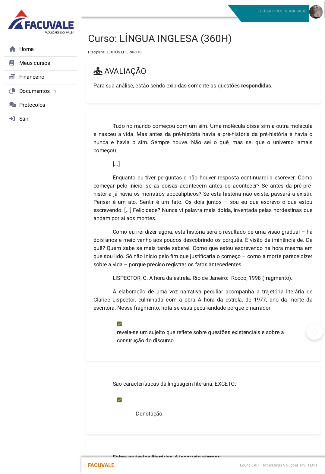 Curso: LÍNGUA INGLESA (360H) Disciplina: TEXTOS LITERÁRIOS AVALIAÇÃO Para sua análise, estão sendo exibidas somente as questões respondidas. Tudo no mundo começou com um sim. Uma molécula disse sim a outra molécula e nasceu a vida. Mas antes da pré-história havia a pré-história da pré-história e havia o nunca e havia o sim. Sempre houve. Não sei o quê, mas sei que o universo jamais começou. [...] Enquanto eu tiver perguntas e não houver resposta continuarei a escrever. Como começar pelo início, se as coisas acontecem antes de acontecer? Se antes da pré-pré- história já havia os monstros apocalípticos? Se esta história não existe, passará a existir. Pensar é um ato. Sentir é um fato. Os dois juntos – sou eu que escrevo o que estou escrevendo. [...] Felicidade? Nunca vi palavra mais doida, inventada pelas nordestinas que andam por aí aos montes. Como eu irei dizer agora, esta história será o resultado de uma visão gradual – há dois anos e meio venho aos poucos descobrindo os porquês. É visão da iminência de. De quê? Quem sabe se mais tarde saberei. Como que estou escrevendo na hora mesma em que sou lido. Só não inicio pelo fim que justificaria o começo – como a morte parece dizer sobre a vida – porque preciso registrar os fatos antecedentes. LISPECTOR, C. A hora da estrela. Rio de Janeiro: Rocco, 1998 (fragmento). A elaboração de uma voz narrativa peculiar acompanha a trajetória literária de Clarice Lispector, culminada com a obra A hora da estrela, de 1977, ano da morte da escritora. Nesse fragmento, nota-se essa peculiaridade porque o narrador São características da linguagem literária, EXCETO: Sobre os textos literários, é incorreto afirmar: ☑ revela-se um sujeito que reflete sobre questões existenciais e sobre a construção do discurso. ☑ Denotação. LETÍCIA PIRES DE ANDRADE Home Meus cursos Financeiro Documentos 1 Protocolos Sair FACUVALE Eduno EAD | HotSystems Soluções em TI Ltda https://ava07.eduno.com.br/alteradadospessoais https://ava07.eduno.com.br/inicio https://ava07.eduno.com.br/meuscursos https://ava07.eduno.com.br/posicaofinanceira https://ava07.eduno.com.br/documentosaluno/* https://ava07.eduno.com.br/viewlistaprotocolosaluno A linguagem literária pode ser encontrada nos seguintes gêneros: Verbete "Letramento literário" Rildo Cossom Letramento literário é o processo de apropriação da literatura enquanto linguagem. Para entendermos melhor essa definição sintética, é preciso que tenhamos bem claros os seus termos. Primeiro, o processo, que é a ideia de ato contínuo, de algo que está em movimento, que não se fecha. Com isso, precisamos entender que o letramento literário começa com as cantigas de ninar e continua por toda nossa vida a cada romance lido, a cada novela ou filme assistido. Depois, que é um processo de apropriação, ou seja, refere- se ao ato de tomar algo para si, de fazer alguma coisa se tornar própria, de fazê-la pertencer à pessoa, de internalizar ao ponto daquela coisa ser sua. É isso que sentimos quando lemos um poema e ele nos dá palavras para dizer o que não conseguíamos expressar antes. Também nos apropriamos literariamente de um romance quando aprendemos com um personagem que há mais de um modo de percorrer os caminhos da vida. Por fim, é um processo de apropriação da literatura enquanto linguagem, ou da linguagem literária. Neste caso, não se trata simplesmente de um conjunto de obras consideradas relevantes, nem o conhecimento de uma área específica, mas sim de um modo muito singular de construir sentidos que é a linguagem literária. Essa singularidade da linguagem literária, diferentemente de outros usos da linguagem humana, vem da intensidade da interação com a palavra que é só palavra e da experiência libertária de ser e viver que proporciona. Na prática pedagógica, o letramento literário pode ser efetivado de várias maneiras, mas há quatro características que lhe são fundamentais. Em primeiro lugar, não há letramento literário sem o contato direto do leitor com a obra, ou seja, é preciso dar ao aluno a oportunidade de interagir ele mesmo com as obras literárias. Depois, o processo do letramento literário passa necessariamente pela construção de uma comunidade de leitores, isto é, um espaço de compartilhamento de leituras no qual há circulação de textos e respeito pelo interesse e pelo grau de dificuldade que o aluno possa ter em relação à leitura das obras. Também precisa ter como objetivo a ampliação do repertório literário, cabendo ao professor acolher no espaço escolar as mais diversas manifestações culturais, reconhecendo que a literatura se faz presente não apenas nos textos escritos, mas também em outros tantos suportes e meios. Finalmente, tal objetivo é atingido quando se oferecem atividades sistematizadas e contínuas direcionadas para o desenvolvimento da competência literária, cumprindo-se, assim, o papel da escola de formar o leitor literário. Disponível em: . Acesso em: 17 maio 2016. Há no texto a defesa de que a leitura literária: ☑ Possui grande compromisso com a clareza e a objetividade, podendo ser encontrada em reportagens, notícias, manuais de instrução e outros textos cuja principal característica seja a informatividade. ☑ crônica, conto, poemas e narrativas de ficção. LETÍCIA PIRES DE ANDRADE Home Meus cursos Financeiro Documentos 1 Protocolos FACUVALE Eduno EAD | HotSystems Soluções em TI Ltda https://ava07.eduno.com.br/alteradadospessoais https://ava07.eduno.com.br/inicio https://ava07.eduno.com.br/meuscursos https://ava07.eduno.com.br/posicaofinanceira https://ava07.eduno.com.br/documentosaluno/* https://ava07.eduno.com.br/viewlistaprotocolosaluno Sobre a linguagem não literária é correto afirmar, exceto: (UERJ – 2012) SOBRE A ORIGEM DA POESIA A origem da poesia se confunde com a origem da própria linguagem. Talvez fizesse mais sentido perguntar quando
