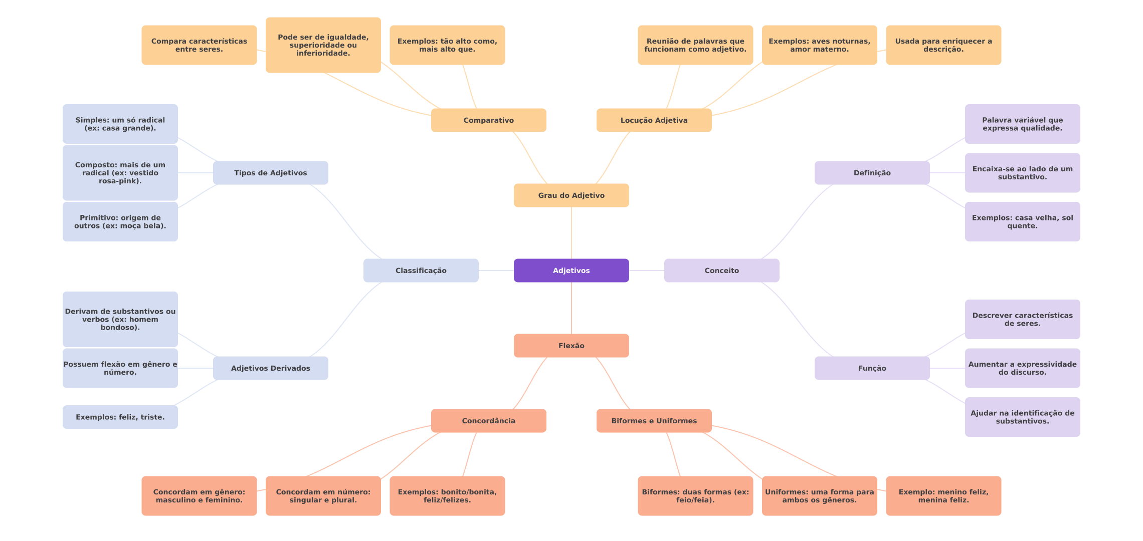 Compara características Pode ser de igualdade, superioridade ou Exemplos: tão alto como, Reunião de palavras que Exemplos: aves noturnas, Usada para enriquecer a entre seres. inferioridade. mais alto que. funcionam como adjetivo. amor materno. descrição. Simples: um só radical Comparativo Locução Adjetiva Palavra variável que (ex: casa grande). expressa qualidade. Composto: mais de um Encaixa-se ao lado de um radical (ex: vestido Tipos de Adjetivos Definição substantivo. rosa-pink). Grau do Adjetivo Primitivo: origem de Exemplos: casa velha, sol outros (ex: moça bela). quente. Classificação Adjetivos Conceito Derivam de substantivos ou Descrever características verbos (ex: homem de seres. bondoso). Flexão Possuem flexão em gênero e Adjetivos Derivados Aumentar a expressividade número. Função do discurso. Exemplos: feliz, triste. Ajudar na identificação de Concordância Biformes e Uniformes substantivos. Concordam em gênero: Concordam em número: Exemplos: bonito/bonita, Biformes: duas formas (ex: Uniformes: uma forma para Exemplo: menino feliz, masculino e feminino. singular e plural. feliz/felizes. feio/feia). ambos os gêneros. menina feliz.