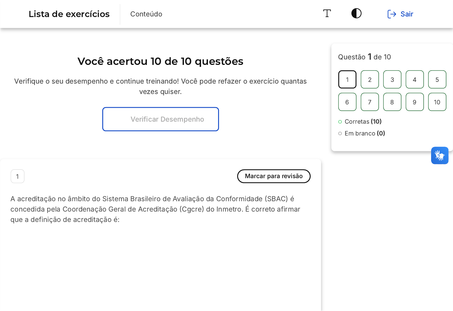Você acertou 10 de 10 questões Verifique o seu desempenho e continue treinando! Você pode refazer o exercício quantas vezes quiser. Verificar Desempenho 1 Marcar para revisão A acreditação no âmbito do Sistema Brasileiro de Avaliação da Conformidade (SBAC) é concedida pela Coordenação Geral de Acreditação (Cgcre) do Inmetro. É correto afirmar que a definição de acreditação é: Questão 1 de 10 Corretas (10) Em branco (0) 1 2 3 4 5 6 7 8 9 10 Lista de exercícios Conteúdo Sair A B C D E O reconhecimento formal da competência dos Organismos de Avaliação da Conformidade (OAC) para realizar suas atividades com confiança e atenderem requisitos previamente definidos. O reconhecimento formal da competência dos laboratórios acreditados para realizar as atividades de calibração com confiança e atendendo aos requisitos previamente definidos pela OIML. O reconhecimento formal da competência do Inmetro para realizar suas atividades de ensaio com confiança e atenderem requisitos previamente definidos. O reconhecimento informal da competência dos laboratórios que fornecem calibrações rastreadas para realizar suas atividades com confiança e atenderem requisitos previamente definidos. O reconhecimento informal da competência dos Organismos de Avaliação da Conformidade (OAC) para realizar suas atividades com confiança e atenderem requisitos de calibração. Resposta correta Parabéns, você selecionou a alternativa correta. Confira o gabarito comentado! Gabarito Comentado A B C A acreditação é um processo não compulsório, que consiste no reconhecimento formal da competência dos Organismos de Avaliação da Conformidade (OAC) para realizar suas atividades com confiança e atenderem requisitos previamente definidos. Este reconhecimento é concedido para um escopo específico e necessita de contínua avaliação para sua manutenção. Portanto, a alternativa A está correta, pois define corretamente o termo acreditação no contexto do Sistema Brasileiro de Avaliação da Conformidade (SBAC). 2 Marcar para revisão O conceito de hierarquia de calibração é apresentado pelo item 2.40 do VIM 2012. Trata-se da ¿sequência de calibrações desde uma referência até ao sistema de medição final, em que o resultado de cada calibração depende do resultado da calibração precedente¿. Considerando este conceito, podemos afirmar que o padrão de mais alto nível na hierarquia de calibração entre as opções abaixo é: padrão de referência de laboratório acreditado. padrão do Inmetro. padrão do BIPM. D E padrão do laboratório de multinacionais. padrão da Cgcre. Resposta correta Parabéns, você selecionou a alternativa correta. Confira o gabarito comentado! Gabarito Comentado O BIPM é o detentor dos padrões internacionais, portanto está em posição mais elevada entre os padrões listados. 3 Marcar para revisão Toda medição executada contem uma incerteza e um erro associados. A calibração a atividade mais aplicada para determinação destas características. Segundo o VIM 2012, podemos conceituar erro de medição como: A B C D E A diferença entre o valor medido de uma grandeza e um valor de referência. A diferença entre o valor de referência e o valor medido de uma grandeza. Uma característica que pode sempre ser ajustada após a calibração. A diferença entre o valor verdadeiro de um padrão de referência e a correção. Uma característica sistemática ou aleatória que pode ser sempre ajustada após a manutenção. Resposta correta Parabéns, você selecionou a alternativa correta. Confira o gabarito comentado! Gabarito Comentado Segundo o item 2.16 do VIM 2012, o conceito de erro é a "diferença entre o valor medido de uma grandeza e um valor de referência". Nem todo erro pode gerar uma correção, pois há erros sistemáticos e erros aleatórios. A B C D E 4 Marcar para revisão O objetivo principal da aplicação da metrologia no SGQ é a garantia da qualidade dos produtos e serviços, portanto não podemos dissociar a metrologia da busca pela qualidade. Com base nesta afirmação, é possível considerar que a metrologia influencia positivamente no seguinte aspecto da qualidade: Aumento dos custos de produção. Melhoria contínua da qualidade dos produtos e serviços. Impede a empresa de ser certificada em normas de gestão da qualidade. Aumento de prazos por processos produtivos mais controlados. Aumento da necessidade de retrabalho pelo controle da qualidade mais rígido. Resposta correta Parabéns, você selecionou a alternativa correta. Confira o gabarito comentado! Gabarito Comentado A B A metrologia, ao ser aplicada no Sistema de Gestão da Qualidade (SGQ), tem como principal objetivo garantir a qualidade dos produtos e serviços. Isso significa que ela tem um impacto positivo em diversos aspectos da qualidade. Entre eles, destaca-se a melhoria contínua da qualidade dos produtos e serviços, que é a alternativa correta. Além disso, a metrologia também contribui para a redução das reclamações de clientes, a certificação da empresa em normas de gestão da qualidade, a redução de retrabalho, o atendimento aos prazos, a não desperdício de matéria-prima e a redução de custos por perdas. Portanto, a metrologia não influencia negativamente em nenhum aspecto da qualidade, mas sim, contribui para a melhoria contínua da qualidade. 5 Marcar para revisão A Metrologia é uma ciência de abrangência elevada e, portanto, é muito comum que suas atividades sejam classificadas por área de aplicação. Assim sendo, em relação à Metrologia Legal é correto afirmar que: É a parte da metrologia relacionada às atividades resultantes de exigências obrigatórias. É a parte da metrologia que tem como objetivo principal proteger o consumidor tratando das unidades de medida, métodos e instrumentos de medição, de acordo com as exigências técnicas e legais obrigatórias. C D E É a parte da metrologia que garante o 