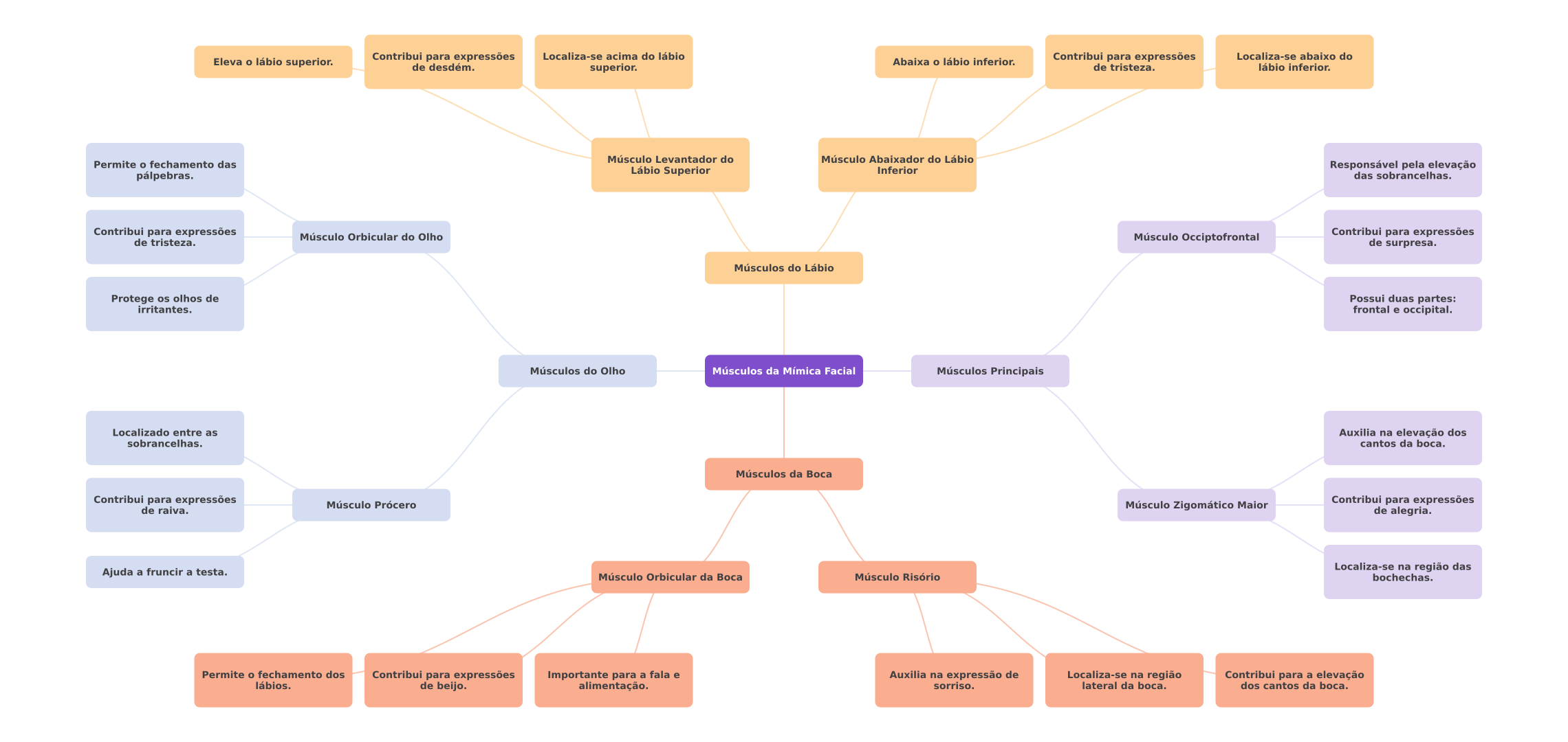Contribui para expressões Localiza-se acima do lábio Eleva lábio superior. Abaixa lábio inferior. Contribui para expressões Localiza-se abaixo do de desdém. superior. de tristeza. lábio inferior. Músculo Levantador do Músculo Abaixador do Lábio Permite fechamento das pálpebras. Lábio Superior Inferior Responsável pela elevação das sobrancelhas. Contribui para expressões Músculo Orbicular do Olho de tristeza. Músculo Occiptofrontal Contribui para expressões de surpresa. Músculos do Lábio Protege os olhos de Possui duas partes: irritantes. frontal e occipital. Músculos do Olho Músculos da Mímica Facial Músculos Principais Localizado entre as Auxilia na elevação dos sobrancelhas. cantos da boca. Músculos da Boca Contribui para expressões Músculo Prócero Músculo Zigomático Maior Contribui para expressões de raiva. de alegria. Ajuda a fruncir a testa. Localiza-se na região das Músculo Orbicular da Boca Músculo Risório bochechas. Permite fechamento dos Contribui para expressões Importante para a fala e Auxilia na expressão de Localiza-se na região Contribui para a elevação lábios. de beijo. alimentação. sorriso. lateral da boca. dos cantos da boca.