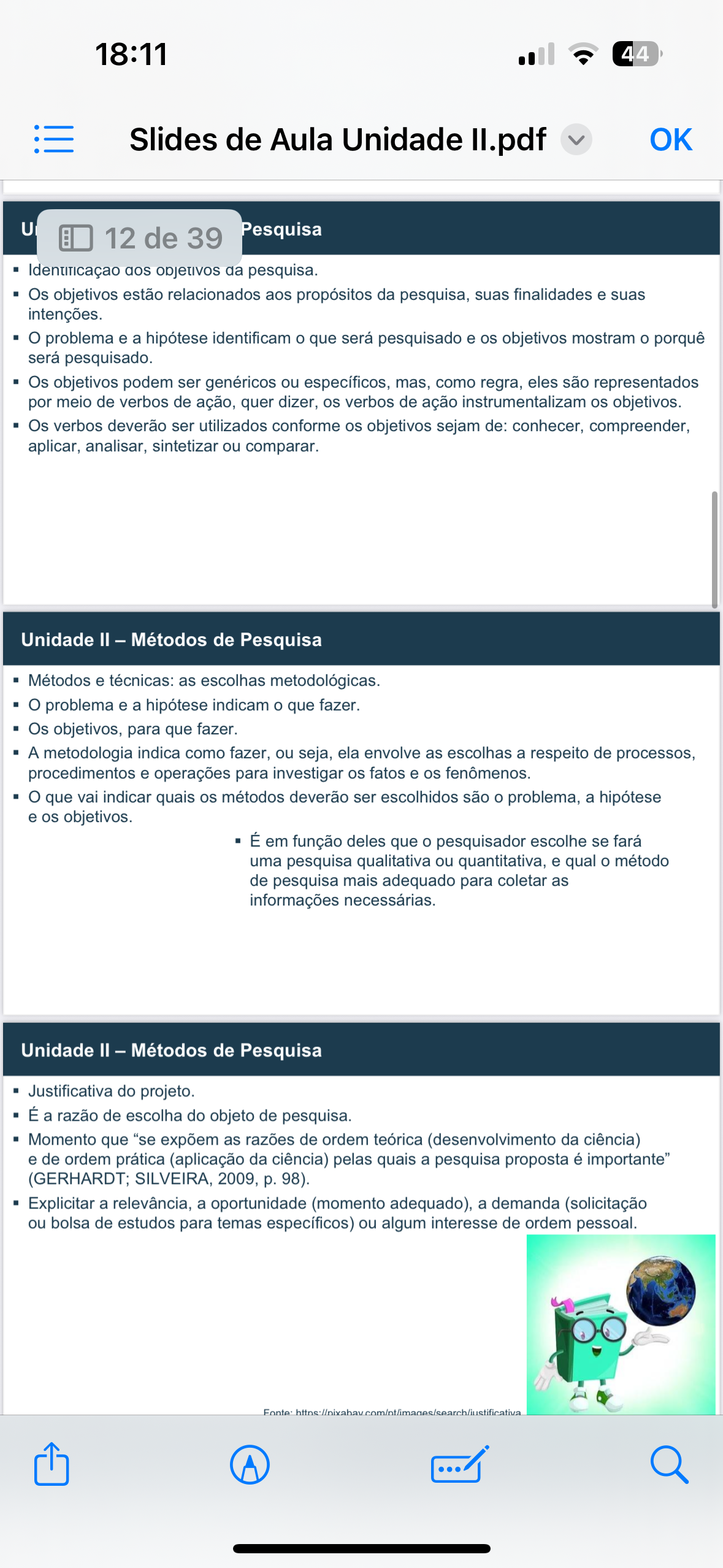 18:11 44 Slides de Aula Unidade II.pdf OK U 12 de 39 Pesquisa Identificação aos objetivos da pesquisa. Os objetivos estão relacionados aos propósitos da pesquisa, suas finalidades e suas intenções. problema e a hipótese identificam o que será pesquisado e os objetivos mostram o porquê será pesquisado. Os objetivos podem ser genéricos ou específicos, mas, como regra, eles são representados por meio de verbos de ação, quer dizer, os verbos de ação instrumentalizam os objetivos. Os verbos deverão ser utilizados conforme os objetivos sejam de: conhecer, compreender, aplicar, analisar, sintetizar ou comparar. Unidade II Métodos de Pesquisa Métodos e técnicas: as escolhas metodológicas. problema e a hipótese indicam o que fazer. Os objetivos, para que fazer. A metodologia indica como fazer, ou seja, ela envolve as escolhas a respeito de processos, procedimentos e operações para investigar os fatos e os fenômenos. que vai indicar quais os métodos deverão ser escolhidos são problema, a hipótese e os objetivos. É em função deles que o pesquisador escolhe se fará uma pesquisa qualitativa ou quantitativa, e qual método de pesquisa mais adequado para coletar as informações necessárias. Unidade II Métodos de Pesquisa Justificativa do projeto. É a razão de escolha do objeto de pesquisa. Momento que "se expõem as razões de ordem teórica (desenvolvimento da ciência) e de ordem prática (aplicação da ciência) pelas quais a pesquisa proposta é importante" (GERHARDT; SILVEIRA, 2009, 98). Explicitar a relevância, a oportunidade (momento adequado), a demanda (solicitação ou bolsa estudos para temas específicos) ou algum interesse de ordem pessoal. Fonte: