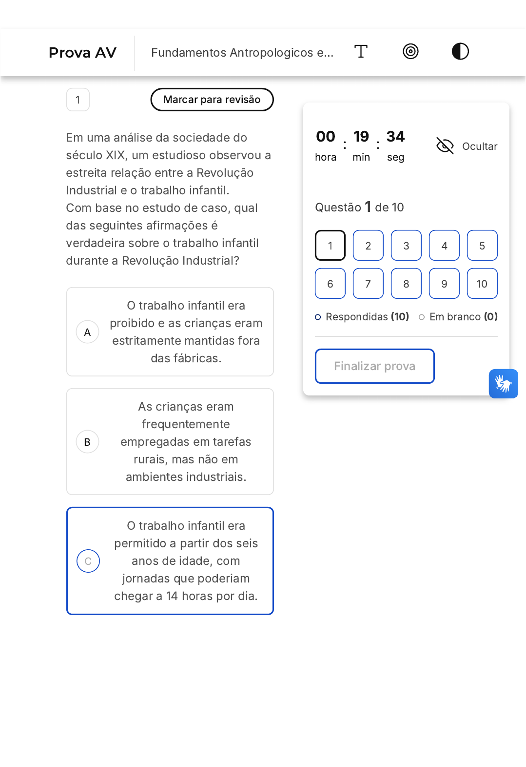 A B C 1 Marcar para revisão Em uma análise da sociedade do século XIX, um estudioso observou a estreita relação entre a Revolução Industrial e o trabalho infantil. Com base no estudo de caso, qual das seguintes afirmações é verdadeira sobre o trabalho infantil durante a Revolução Industrial? O trabalho infantil era proibido e as crianças eram estritamente mantidas fora das fábricas. As crianças eram frequentemente empregadas em tarefas rurais, mas não em ambientes industriais. O trabalho infantil era permitido a partir dos seis anos de idade, com jornadas que poderiam chegar a 14 horas por dia. 00 hora : 19 min : 34 seg Ocultar Questão 1 de 10 Respondidas (10) Em branco (0) Finalizar prova 1 2 3 4 5 6 7 8 9 10 Prova AV Fundamentos Antropologicos e… D E A Revolução Industrial reduziu a necessidade de trabalho infantil devido à mecanização. A maioria das crianças tinha uma infância tranquila e livre durante a Revolução Industrial. 2 Marcar para revisão A tribo Z tem uma prática cultural onde a história e as tradições são passadas oralmente de geração para geração, através de contadores de histórias que usam tanto palavras como danças para comunicar o passado. Considerando o texto, analise as afirmativas abaixo. I. A Antropologia Cultural não valoriza a tradição oral como uma forma válida de preservar a história e cultura. II. Os antropólogos culturais podem utilizar métodos etnográficos para estudar e documentar tradições orais e histórias em diferentes culturas. III. A dança, enquanto meio de comunicar tradições e histórias, não é um foco de estudo para a Antropologia Cultural. Assinale a opção que apresenta somente as alternativas corretas. A B C D E Apenas a afirmativa II está correta Apenas a afirmativa III está correta Apenas as afirmativas I e II estão corretas Apenas as afirmativas I e III estão corretas Apenas a afirmativa I está correta 3 Marcar para revisão A sociologia nasce no século XIX com o objetivo de combater a visão de mundo predominante nesse período, defendendo o estudo da ação coletiva e social. Assim, o objeto de estudo da sociologia é definido como um conjunto de relacionamentos, que os homens estabelecem entre si, na vida em sociedade, em um determinado contexto histórico. Assinale a alternativa que contém a principal característica desse objeto de estudo. A B C D E Igualdade Individualismo Liberdade Coerção Interior 4 Marcar para revisão O reconhecimento do racismo e do machismo como faltas graves por reproduzir a inferiorização dos negros e das mulheres ainda é muito difícil no meio corporativo, porque atribuem esses comportamentos a desvios morais e pessoais, ou seja individualiza a culpa no opressor, de modo que a empresa ou fica omissa ao constatar esse comportamento ou se posiciona de modo a condenar esse comportamento. A respeito dessas formas de gestão empresarial, assinale a alternativa que está alinhada com os direitos humanos. A B C Quando as atitudes e práticas racistas e machistas realizadas pelos seus funcionários são ignoradas a empresa torna- se tão culpada quanto o autor direto da discriminação uma vez que naturalizou e normalizou o racismo e o machismo em sua organização interna. A responsabilidade da empresa é garantir que os serviços sejam realizados e não que a autoestima ou moral de ninguém sejam assegurados. Por essa razão não é obrigação do gestor interferir nesses tipos de conflito. O desvio moral e pessoal carece de tratamento médico, e em caso da prática de crime, de ação penal após investigação do Ministério Público. Logo, o comportamento do agressor não é responsabilidade dos gestores da empresa. D E O agressor é resultado da sociedade racista e machista por isso não deve sofrer qualquer tipo de punição ou medida de ajustamento de conduta. A legislação prevê que comportamentos discriminatórios podem ser punidos com o Termo de Ajustamento de Condutas (TAC), que é medida criada para que a pessoa racista ou machista frequente cursos e palestras sobre os temas que violou, mas isso se sua vítima denunciar. 5 Marcar para revisão Durante os estudos iniciais da Sociologia, diversos pensadores se destacaram na tentativa de entender e explicar os fenômenos sociais. Em relação ao positivismo funcionalista, é correto afirmar que: A B C D E o positivismo funcionalista foi amplamente rejeitado por pensadores contemporâneos da época. a maior contribuição do positivismo funcionalista foi no campo da biologia, não da sociologia. o positivismo funcionalista se desenvolveu significativamente na França e é uma vertente importante da Sociologia contemporânea. o positivismo funcionalista não teve relevância significativa nos estudos sociológicos iniciais. o positivismo funcionalista foi introduzido apenas no século XX, após a consolidação da Sociologia como ciência. 6 Marcar para revisão Os debates sobre antropologia cultural passam, necessariamente, por: A B C D E Etnocentrismo - a lógica de que tendemos a olhar nossa cultura como certa e analisar e hierarquizar as outras a partir disso. Relativismo - que tudo é relativo e não existe nem certo e nem errado, assim não devemos nunca nos posicionar. Etnocentrismo - a dinâmica de que as culturas são individuais e não devem ser misturadas para que não percam seu centro. Relativismo - a lógica que o ponto de vista altera a visão sobre a cultura, e por isso a interpretação é sempre única. Etnocentrismo - nome original da antropologia, antes do aparecimento dos trabalhos de antropólogos americanos. 7 Marcar para revisão Quanto aos pressupostos teóricos e metodológicos implicados na A B C construção de tipos ideais, é correto afirmar que: Uma vez construído, o tipo ideal passa a servir como parâmetro de comparações gerais e de pesquisas posteriores sobre o mesmo tema O tipo ideal é uma construção mental, feita na mente do investigador, sem qualquer