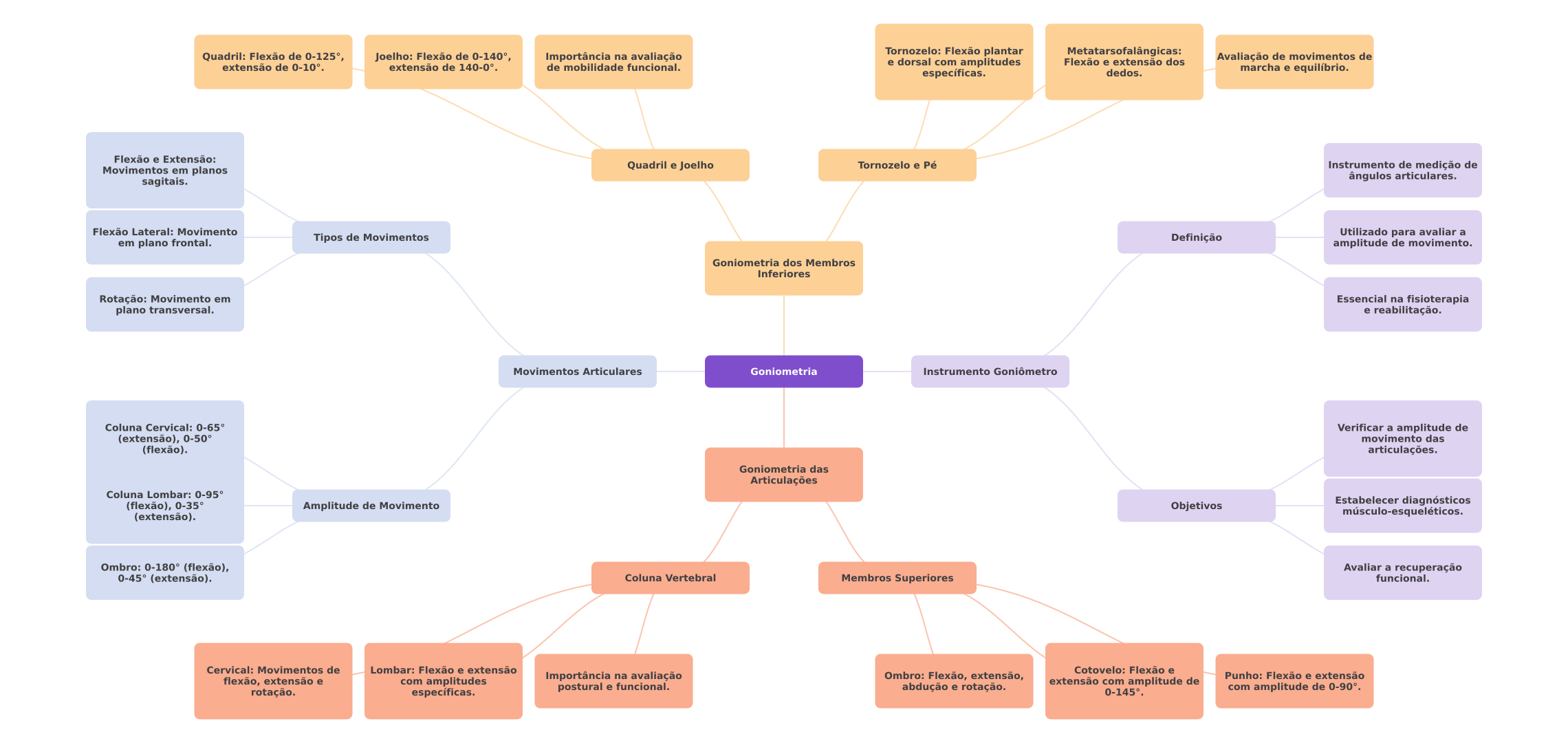 Quadril: Flexão de 0-125°, Joelho: Flexão de 0-140°, Importância na avaliação Tornozelo: Flexão plantar Metatarsofalângicas: Flexão e extensão dos Avaliação de movimentos de extensão de 0-10°. extensão de 140-0°. de mobilidade funcional. e dorsal com amplitudes dedos. marcha e equilíbrio. específicas. Flexão e Extensão: Quadril e Joelho Tornozelo e Pé Instrumento de medição de Movimentos em planos sagitais. ângulos articulares. Flexão Lateral: Movimento em plano frontal. Tipos de Movimentos Definição Utilizado para avaliar a amplitude de movimento. Goniometria dos Membros Inferiores Rotação: Movimento em Essencial na fisioterapia plano transversal. e reabilitação. Movimentos Articulares Goniometria Instrumento Goniômetro Coluna Cervical: 0-65° Verificar a amplitude de (extensão), 0-50° movimento das (flexão). articulações. Goniometria das Articulações Coluna Lombar: 0-95° (flexão), 0-35° Objetivos Estabelecer diagnósticos Amplitude de Movimento (extensão). músculo-esqueléticos. Ombro: (flexão), Avaliar a recuperação 0-45° (extensão). Coluna Vertebral Membros Superiores funcional. Cervical: Movimentos de Lombar: Flexão e extensão Cotovelo: Flexão e Importância na avaliação Ombro: Flexão, extensão, Punho: Flexão e extensão flexão, extensão e com amplitudes postural e funcional. abdução e rotação. extensão com amplitude de rotação. específicas. 0-145°. com amplitude de 0-90°.