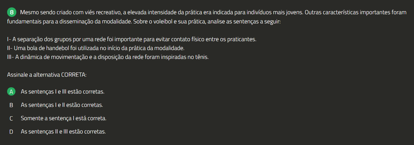 8 Mesmo sendo criado com viés recreativo, a elevada intensidade da prática era indicada para indivíduos mais jovens. Outras características importantes foram fundamentais para a disseminação da modalidade. Sobre 0 voleibol e sua prática, analise as sentenças a seguir: A separação dos grupos por uma rede foi importante para evitar contato físico entre praticantes. II- Uma bola de handebol foi utilizada no início da prática da modalidade. III- A dinâmica de movimentação e a disposição da rede foram inspiradas no tênis. Assinale a alternativa CORRETA: A As sentenças I e III estão corretas. B As sentenças I e estão corretas. Somente a sentença está correta. D As sentenças e III estão corretas.