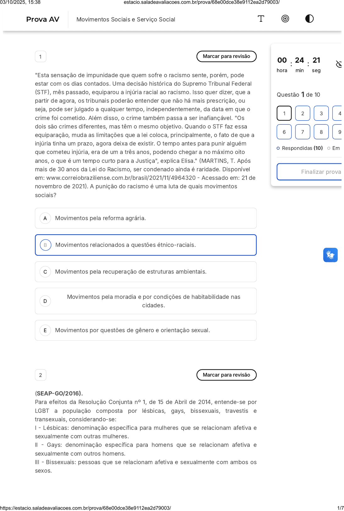 A B C D E 1 Marcar para revisão "Esta sensação de impunidade que quem sofre o racismo sente, porém, pode estar com os dias contados. Uma decisão histórica do Supremo Tribunal Federal (STF), mês passado, equiparou a injúria racial ao racismo. Isso quer dizer, que a partir de agora, os tribunais poderão entender que não há mais prescrição, ou seja, pode ser julgado a qualquer tempo, independentemente, da data em que o crime foi cometido. Além disso, o crime também passa a ser inafiançável. "Os dois são crimes diferentes, mas têm o mesmo objetivo. Quando o STF faz essa equiparação, muda as limitações que a lei coloca, principalmente, o fato de que a injúria tinha um prazo, agora deixa de existir. O tempo antes para punir alguém que cometeu injúria, era de um a três anos, podendo chegar a no máximo oito anos, o que é um tempo curto para a Justiça", explica Elisa." (MARTINS, T. Após mais de 30 anos da Lei do Racismo, ser condenado ainda é raridade. Disponível em: www.correiobraziliense.com.br/brasil/2021/11/4964320 - Acessado em: 21 de novembro de 2021). A punição do racismo é uma luta de quais movimentos sociais? Movimentos pela reforma agrária. Movimentos relacionados a questões étnico-raciais. Movimentos pela recuperação de estruturas ambientais. Movimentos pela moradia e por condições de habitabilidade nas cidades. Movimentos por questões de gênero e orientação sexual. 2 Marcar para revisão (SEAP-GO/2016). Para efeitos da Resolução Conjunta nº 1, de 15 de Abril de 2014, entende-se por LGBT a população composta por lésbicas, gays, bissexuais, travestis e transexuais, considerando-se: I - Lésbicas: denominação específica para mulheres que se relacionam afetiva e sexualmente com outras mulheres. II - Gays: denominação específica para homens que se relacionam afetiva e sexualmente com outros homens. III - Bissexuais: pessoas que se relacionam afetiva e sexualmente com ambos os sexos. 00 hora : 24 min : 21 seg Questão 1 de 10 Respondidas (10) Em Finalizar prova 1 2 3 4 6 7 8 9 Prova AV Movimentos Sociais e Serviço Social 03/10/2025, 15:38 estacio.saladeavaliacoes.com.br/prova/68e00dce38e9112ea2d79003/ https://estacio.saladeavaliacoes.com.br/prova/68e00dce38e9112ea2d79003/ 1/7 A B C D E A B C Somente as assertivas I e II estão corretas. Somente as assertivas II e III estão corretas. Somente as assertivas I e III estão corretas. Somente a assertiva I está correta. As assertivas I, II e III estão corretas. 3 Marcar para revisão Sobre o Serviço Social e Movimentos Sociais Couto e Medeiros (2017, p.79) afirma que "uma das possibilidades de interlocução com os movimentos sociais é através da assessoria/consultoria, como bem explicita a Lei de Regulamentação da Profissão (1993) que compreende como competência profissional "prestar assessoria e apoio aos movimentos sociais" (art. 4º, parágrafo IX); ou ainda, se inserindo nos conselhos e outros canais de participação democrática, espaços que não devem ser negados. COUTO GONÇALVES, T.; MEDEIROS ALAGOANO, V. Serviço Social E Movimentos Sociais. Revista Serviço Social em Perspectiva, [S. l.], v. 1, n. 1, p. 66¿82, 2020. Disponível em: https://www.periodicos.unimontes.br/index.php/sesoperspectiva/article/view/678. Acesso em: 28 dez. 2022. Considerando este trecho é possível afirmar que: a assessoria/consultoria que o(a) assistente social presta aos movimentos sociais é fundamentado no Código de Ética Profissional, Lei n° 8662/93, e Projeto Ético Político Profissional. a assessoria/consultoria que o(a) assistente social presta aos movimentos sociais tem caráter conservador e fiscalizador, uma vez que sua intervenção deve atender aos interesses do capital. a assessoria/consultoria que o(a) assistente social presta aos movimentos sociais ocorre apenas nos espaços normatizados como os conselhos e conferências, de forma informativa. 03/10/2025, 15:38 estacio.saladeavaliacoes.com.br/prova/68e00dce38e9112ea2d79003/ https://estacio.saladeavaliacoes.com.br/prova/68e00dce38e9112ea2d79003/ 2/7 D E A B C D E a assessoria/consultoria que o(a) assistente social presta aos movimentos sociais é de forma punitiva com orientações que visam a desregulamentação dos direitos sociais. a assessoria/consultoria que o(a) assistente social presta aos movimentos sociais acontece por meio de palestras informativas, em que profissional faz partir da ideologia do neoliberalismo. 4 Marcar para revisão O Estado Novo é compreendido pelo período de 1937-1945. Tempo de intensa repressão política dos movimentos. Também foi desarticulada a luta política do movimento negro organizado. Somente décadas adiante, o movimento reuniu forças para se organizar, quando também outros movimentos populares despontam no Brasil. Um marco dessa luta foi: a Promulgação do Estatuto da Igualdade Racial, que trouxe garantias para a defesa dos direitos da população negra e o combate à discriminação aprovado em 2010. a Aprovação da Lei 12.519 Cotas raciais aprovadas para o ensino superior em 2012 e para o funcionalismo público em 2014. a Fundação do MUCDR - Movimento Unificado Contra a Discriminação Racial, em 1978, na cidade de São Paulo e seu nome foi simplificado para MNU - Movimento Negro Unificado. a Criação em 2004 do Museu Afro Brasil. a inserção em 1996 de Zumbi dos Palmares no Livro dos Heróis da Pátria. 5 Marcar para revisão Uma das contribuições do Conselho Federal de Serviço Social e do Conselho Regional de Serviço Social, conjunto CFESS/CRESS é a construção de documentos norteadores do fazer profissional. Estes documentos fundamentam a atuação do(a) assistente social nos diversos espaços sócio-ocupacionais das políticas sociais. Neste sentido, é possível afirmar que estes documentos são: 03/10/2025, 15:38 estacio.saladeavaliacoes.com.br/prova/68e00dce38e9112ea2d79003/ https://estacio.saladeavaliacoes.com.br/prova/68e00dce38e9112ea2d79003/ 3/7 A B C 
