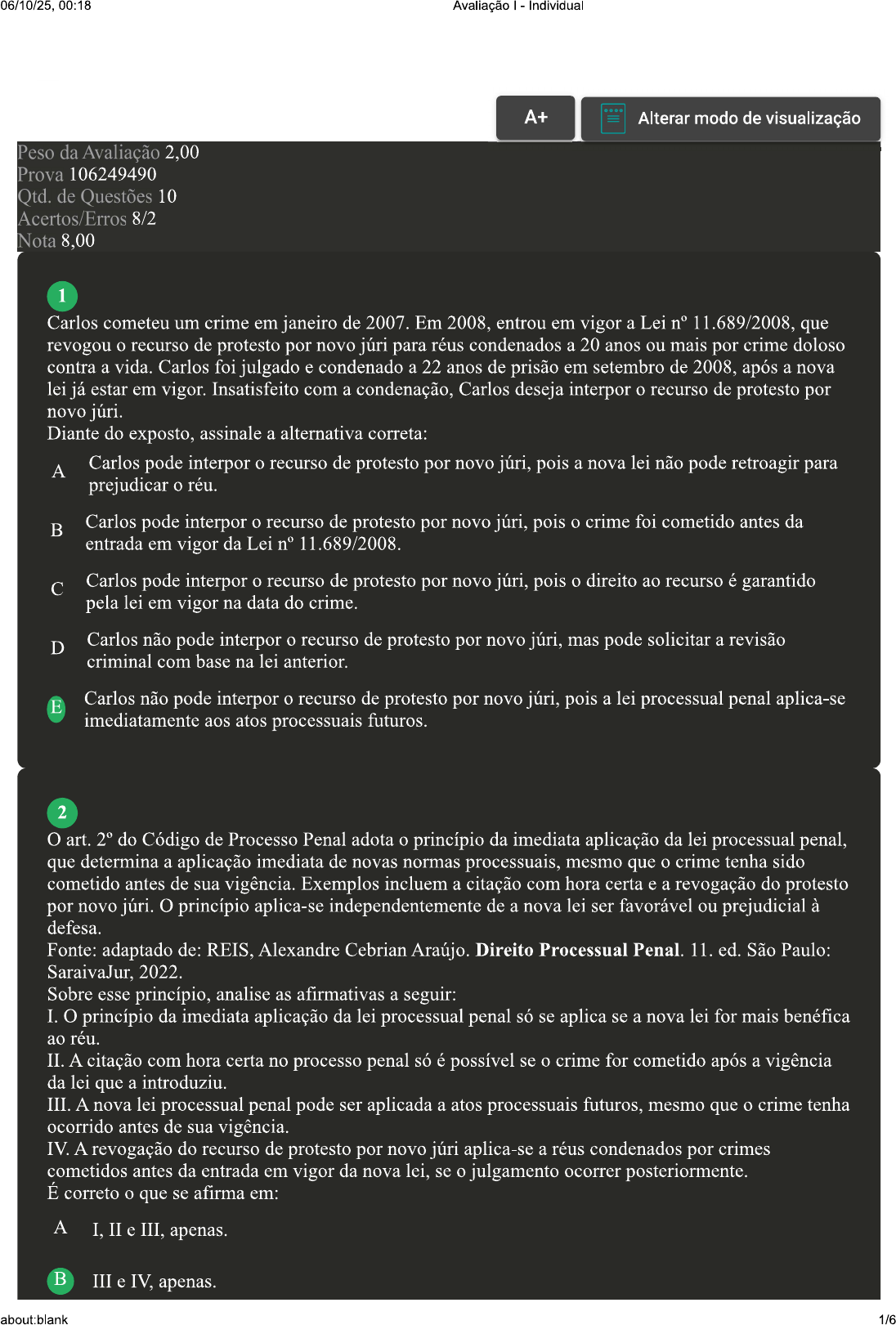06/10/25, 00:18 Avaliação I Individual A+ Alterar modo de visualização Peso da Avaliação 2,00 Prova 106249490 Qtd. de Questões 10 Acertos/Erros 8/2 Nota 8,00 1 Carlos cometeu um crime em janeiro de 2007. Em 2008, entrou em vigor a Lei 11.689/2008, que revogou o recurso de protesto por novo júri para réus condenados a 20 anos ou mais por crime doloso contra a vida. Carlos foi julgado e condenado a 22 anos de prisão em setembro de 2008, após a nova lei já estar em vigor. Insatisfeito com a condenação, Carlos deseja interpor o recurso de protesto por novo júri. Diante do exposto, assinale a alternativa correta: A Carlos pode interpor o recurso de protesto por novo júri, pois a nova lei não pode retroagir para prejudicar o réu. Carlos pode interpor o recurso de protesto por novo júri, pois o crime foi cometido antes da entrada em vigor da Lei 11.689/2008. Carlos pode interpor o recurso de protesto por novo júri, pois o direito ao recurso é garantido pela lei em vigor na data do crime. D Carlos não pode interpor o recurso de protesto por novo júri, mas pode solicitar a revisão criminal com base na lei anterior. E Carlos não pode interpor o recurso de protesto por novo júri, pois a lei processual penal aplica-se imediatamente aos atos processuais futuros. 2 art. 2° do Código de Processo Penal adota o princípio da imediata aplicação da lei processual penal, que determina a aplicação imediata de novas normas processuais, mesmo que o crime tenha sido cometido antes de sua vigência. Exemplos incluem a citação com hora certa e a revogação do protesto por novo júri. O princípio aplica-se independentemente de a nova lei ser favorável ou prejudicial à defesa. Fonte: adaptado de: REIS, Alexandre Cebrian Araújo. Direito Processual Penal. 11. ed. São Paulo: SaraivaJur, 2022. Sobre esse princípio, analise as afirmativas a seguir: I. princípio da imediata aplicação da lei processual penal só se aplica se a nova lei for mais benéfica ao réu. II. A citação com hora certa no processo penal só é possível se o crime for cometido após a vigência da lei que a introduziu. III. A nova lei processual penal pode ser aplicada a atos processuais futuros, mesmo que o crime tenha ocorrido antes de sua vigência. IV. A revogação do recurso de protesto por novo júri aplica-se a réus condenados por crimes cometidos antes da entrada em vigor da nova lei, se o julgamento ocorrer posteriormente. É correto o que se afirma em: A I, II e III, apenas. B III e IV, apenas. about:blank 1/606/10/25, 00:18 Avaliação - Individual I, apenas. D II e IV, apenas. E I, II, III e IV. 3 termo provém do latim fons, fontis, que implica o conceito de nascente de água. Entende-se por fonte tudo o que dá origem, o início de tudo. Fonte do Direito nada mais é do que a origem do Direito, suas raízes históricas, de onde se cria (fonte material) e como se aplica (fonte formal), ou seja, o processo de produção das normas. As fontes de direito são os meios de produção, expressão ou interpretação da norma jurídica. Fontes são os mecanismos pelos quais as normas jurídicas são demonstradas de forma a abastecer o direito objetivo. Fonte: adaptado de: BUCHINI, Fontes do Direito. Jusbrasil, 2020. Disponível em: https://www.jusbrasil.com.br/artigos/fontes-do-direito/837813617 Acesso em: 12 set. 2024. Considerando o texto, sobre as fontes do direito processual, analise as afirmativas a seguir: I. A fonte formal do Direito Processual é a lei em sentido amplo, o que inclui a Constituição Federal. II. A fonte material é dotada de coercitividade e caráter vinculante, isto é, de obediência obrigatória. III. As fontes formais possuem caráter obrigatório e possuem força vinculante, mas visam revelar, informar o sentido das normas. IV. As fontes materiais não são obrigatórias, possuem caráter ético, moral, político, histórico, econômico etc., posto que, em determinado momento, auxiliam no sentido de provocar, justificar e legitimar a criação das normas legais. É correto o que se afirma em: A I e IV, apenas. B III, apenas. I, II, III e IV. D II e IV, apenas. E I, II e III, apenas. 4 Durante uma investigação, a polícia obteve provas por meio de escuta telefônica sem autorização judicial, o que configura uma violação das normas constitucionais. Durante a instrução processual, essas provas foram apresentadas pelo Ministério Público e analisadas pelo juiz. Sobre a admissibilidade dessas provas no processo penal, analise as afirmativas a seguir: I. As provas obtidas ilegalmente não podem ser admitidas no processo penal, independentemente da sua relevância para a acusação. II. As provas obtidas de forma ilícita devem ser desentranhadas do processo, conforme previsto no Art. 5°, LVI da Constituição Federal e no Art. 157 do Código de Processo Penal. III. princípio da inadmissibilidade de provas ilícitas impede que o juiz utilize qualquer informação obtida por meios ilícitos, mesmo que essas informações sejam corroboradas por outras provas legais. IV. As provas obtidas ilegalmente, mesmo que sejam desentranhadas do processo, o juiz pode considerar as informações nelas contidas para orientar sua decisão, desde que não use diretamente as provas. correto o que se afirma em: about:blank 2/606/10/25, 00:18 Avaliação - Individual A II e III, apenas. B I, II e III, apenas. II, III e IV, apenas. D I e II, apenas. E III e IV, apenas. Revisar Conteúdo do Livro 5 Os princípios jurídicos refletem a cultura sociojurídica de uma sociedade em um dado momento (ou no decorrer) de sua história, sendo o conteúdo principal formado pelos valores superiores aceitos como verdade por essa sociedade. É predominante na doutrina que os princípios são normas jurídicas que representam valores aceitos e realizados ao longo do tempo a partir da experiência social de uma determinada sociedade. Assim, os princípios jurídicos são compostos de valores que, erigi