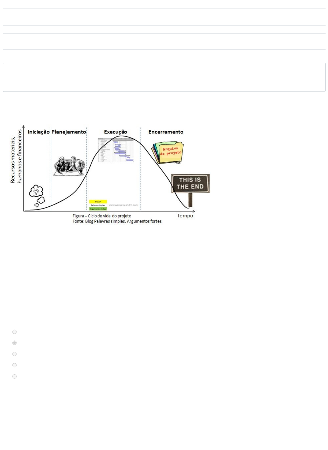 Iniciado em quinta-feira, 28 ago. 2025, 09:39 Estado Finalizada Concluída em quinta-feira, 28 ago. 2025, 09:47 Tempo empregado 7 minutos 46 segundos Avaliar 9,00 de um máximo de 10,00(90%) Questão 1 Correto Atingiu 1,00 de 1,00 Todo projeto, como atividade temporária, possui um ciclo, conhecido como Ciclo de Vida do Projeto, conforme a figura abaixo: I) A iniciação é o ponto de partida de um projeto, ou seja, é quando a empresa realiza uma análise das necessidades e dá início a primeira fase e que passa por algumas etapas que são: eleger o gerente do projeto, identificar as principais partes interessadas, estabelecer um termo de abertura do projeto e estabelecer um escopo do projeto. II) Planejamento é a mais criativa das fases, onde o gerente do projeto irá planejar as metas do projeto e assim irá descrever o escopo detalhado do projeto, cronogramas, custos envolvidos, orçamentos, riscos, qualidade, comunicação, etc. III) No encerramento, que é última fase do processo, é onde ocorrerá a aceitação e aprovação formal do projeto desenvolvido. O gerente de projeto deve dar feedback individual aos membros da equipe, além de preparar um relatório final do projeto com o resumo dos resultados e plano de ação, assim como os próximos passos se for necessário. Assim, é CORRETO afirmar: Escolha uma opção: As três assertivas são falsas e não completam o texto, muito pelo contrário. As três assertivas estão corretas e complementam o texto ✓ Somente as assertivas II) e III) são corretas e complementam o texto, e a II) é incorreta. Somente as assertivas I) e II) são corretas e complementam o texto, sendo a III) incorreta. Somente as assertivas I) e III) são corretas e justificam o texto, e a II) é incorreta. Sua resposta está correta. A resposta correta é: As três assertivas estão corretas e complementam o texto 06/10/2025, 08:00 Teste 1: Revisão da tentativa | avaead-unisanta https://avaead.unisanta.br/mod/quiz/review.php?attempt=1744150&cmid=588709 1/6 Questão 2 Correto Atingiu 1,00 de 1,00 Questão 3 Correto Atingiu 1,00 de 1,00 A palavra “projeto” enquadra-se naquela categoria de palavras que têm vários significados, cada um deles dependendo do contexto em que é empregada, então, projeto” tem diversas conotações. Quando perguntamos a uma criança o que ela gostaria de se tornar quando crescer (bombeiro, astronauta, médico, professor), isso pode ser visto como um projeto de vida. No congresso, os parlamentares trabalham em projetos de lei que, se aprovados, se transformarão efetivamente em leis. Os arquitetos e engenheiros trabalham com planos e desenhos que também são chamados de projetos. Em nosso contexto e segundo as definições apresentadas, notadamente a do PMI/PMBOK (2107), quais seriam as principais características de um projeto? Escolha uma opção: Não levam em conta os possíveis riscos do empreendimento. Tem início e fim bem definidos com objetivos claros. ✓ Não utilizam recursos tecnológicos. São conduzidos por Inteligência Artificial. Os gastos não são importantes, mas sim o resultado final. Sua resposta está correta. A resposta correta é: Tem início e fim bem definidos com objetivos claros. O Escopo do projeto é o trabalho que precisa ser realizado para entregar um produto, serviço ou resultado com as características e funções especificadas. I) O escopo está mais orientado aos esforços. II) O termo escopo é empregado no sentido da totalidade do trabalho necessário para completar o projeto III) Escopo tem premissas, limitações e restrições. Assim, é INCORRETO afirmar: Escolha uma opção: Todas as assertivas são falsas. ✓ Somente as assertivas II) e III) são verdadeiras e a I) é falsa. Todas as assertivas são verdadeiras. Somente as assertivas I) e II) são verdadeiras e a III) é falsa. Somente a assertiva I) é verdadeira e a II) e III) são falsas. Sua resposta está correta. A resposta correta é: Todas as assertivas são falsas. 06/10/2025, 08:00 Teste 1: Revisão da tentativa | avaead-unisanta https://avaead.unisanta.br/mod/quiz/review.php?attempt=1744150&cmid=588709 2/6 Questão 4 Correto Atingiu 1,00 de 1,00 Os projetos não são feitos de uma só vez. Como são empreendimentos não repetitivos, de acordo com a definição utilizada, e quase sempre de elevada complexidade, faz todo sentido que possamos dividir o projeto em etapas, correspondentes às entregas menores a serem realizadas. Assim, pegando como exemplo a construção de uma casa, teremos a preparação do terreno, as fundações, as vigas baldrames, a elevação das paredes, o telhado, os acabamentos, etc. Logo, uma tarefa de grande complexidade pode ser resumida em etapas que, uma vez realizadas, farão a entrega total e final do produto do projeto, no caso, a casa pronta. Dessa forma, entendemos que até que podemos fazer mudanças nos projetos após seu início, mas com elevados custos. Analisando a figura abaixo, como Você explicaria e justificaria essa relação nas alternativas abaixo? Escolha uma opção: Mudanças no escopo são esperadas durante o ciclo de vida da maioria dos projetos e seus impactos podem variar dependendo da fase do projeto. ✓ Os custos das mudanças são menores com o passar do tempo (cronograma do projeto) visto que várias tarefas e entregas foram feitas. Sua resposta está correta. A resposta correta é: Mudanças no escopo são esperadas durante o ciclo de vida da maioria dos projetos e seus impactos podem variar dependendo da fase do projeto. 06/10/2025, 08:00 Teste 1: Revisão da tentativa | avaead-unisanta https://avaead.unisanta.br/mod/quiz/review.php?attempt=1744150&cmid=588709 3/6 Questão 5 Incorreto Atingiu 0,00 de 1,00 Questão 6 Correto Atingiu 1,00 de 1,00 As décadas finais do século XX foram sucessões de períodos tumultuados, com grandes transformações na geopolítica, na economia, nas comunicações, na tecnologia da informação e principalmente nos transpor
