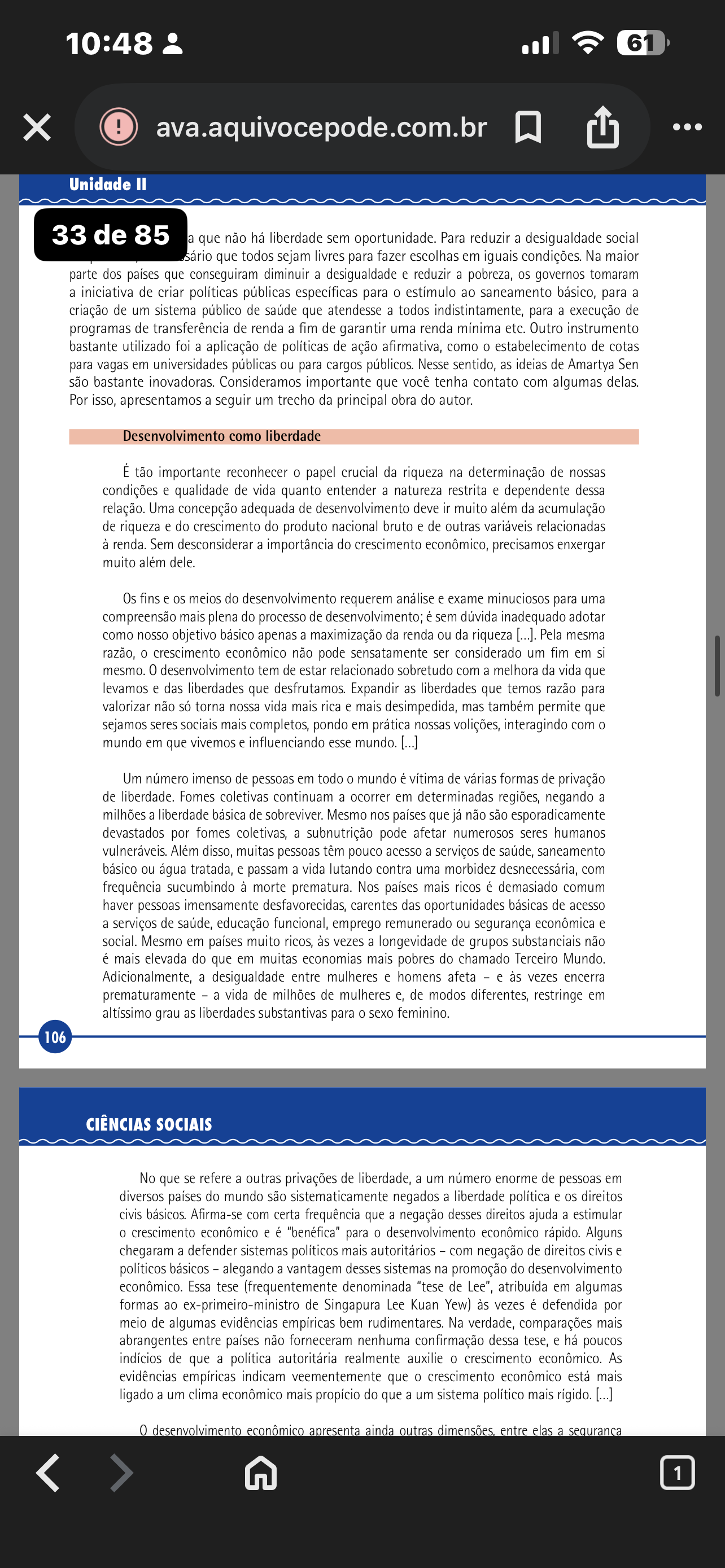 10:48 61 X ! ava.aquivocepode.com.br Unidade II 33 de 85 a que não há liberdade sem oportunidade. Para reduzir a desigualdade social sário que todos sejam livres para fazer escolhas em iguais condições. Na maior parte dos países que conseguiram diminuir a desigualdade e reduzir a pobreza, governos tomaram a iniciativa de criar políticas públicas específicas para estímulo ao saneamento básico, para a criação de um sistema público de saúde que atendesse a todos indistintamente, para a execução de programas de transferência de renda a fim de garantir uma renda mínima etc. Outro instrumento bastante utilizado foi a aplicação de políticas de ação afirmativa, como 0 estabelecimento de cotas para vagas em universidades públicas ou para cargos públicos. Nesse sentido, as ideias de Amartya Sen são bastante inovadoras. Consideramos importante que você tenha contato com algumas delas. Por isso, apresentamos a seguir um trecho da principal obra do autor. Desenvolvimento como liberdade É tão importante reconhecer 0 papel crucial da riqueza na determinação de nossas condições e qualidade de vida quanto entender a natureza restrita e dependente dessa relação. Uma concepção adequada de desenvolvimento deve ir muito além da acumulação de riqueza e do crescimento do produto nacional bruto e de outras variáveis relacionadas à renda. Sem desconsiderar a importância do crescimento econômico, precisamos enxergar muito além dele. Os fins e os meios do desenvolvimento requerem análise e exame minuciosos para uma compreensão mais plena do processo de desenvolvimento; é sem dúvida inadequado adotar como nosso objetivo básico apenas a maximização da renda ou da riqueza [...]. Pela mesma razão, crescimento econômico não pode sensatamente ser considerado um fim em si mesmo. 0 desenvolvimento tem de estar relacionado sobretudo com a melhora da vida que levamos e das liberdades que desfrutamos. Expandir as liberdades que temos razão para valorizar não só torna nossa vida mais rica e mais desimpedida, mas também permite que sejamos seres sociais mais completos, pondo em prática nossas volições, interagindo com 0 mundo em que vivemos e influenciando esse mundo. [...] Um número imenso de pessoas em todo mundo é vítima de várias formas de privação de liberdade. Fomes coletivas continuam a ocorrer em determinadas regiões, negando a milhões a liberdade básica de sobreviver. Mesmo nos países que já não são esporadicamente devastados por fomes coletivas, a subnutrição pode afetar numerosos seres humanos vulneráveis. Além disso, muitas pessoas têm pouco acesso a serviços de saúde, saneamento básico ou água tratada, e passam a vida lutando contra uma morbidez desnecessária, com frequência sucumbindo à morte prematura. Nos países mais ricos é demasiado comum haver pessoas imensamente desfavorecidas, carentes das oportunidades básicas de acesso a serviços de saúde, educação funcional, emprego remunerado ou segurança econômica e social. Mesmo em países muito ricos, às vezes a longevidade de grupos substanciais não é mais elevada do que em muitas economias mais pobres do chamado Terceiro Mundo. Adicionalmente, a desigualdade entre mulheres e homens afeta e às vezes encerra prematuramente a vida de milhões de mulheres e, de modos diferentes, restringe em altíssimo grau as liberdades substantivas para 0 sexo feminino. 106 CIÊNCIAS SOCIAIS No que se refere a outras privações de liberdade, a um número enorme de pessoas em diversos países do mundo são sistematicamente negados a liberdade política e os direitos civis básicos. Afirma-se com certa frequência que a negação desses direitos ajuda a estimular 0 crescimento econômico e é "benéfica" para 0 desenvolvimento econômico rápido. Alguns chegaram a defender sistemas políticos mais autoritários com negação de direitos civis e políticos básicos alegando a vantagem desses sistemas na promoção do desenvolvimento econômico. Essa tese (frequentemente denominada "tese de Lee", atribuída em algumas formas ao ex-primeiro-ministro de Singapura Lee Kuan Yew) às vezes é defendida por meio de algumas evidências empíricas bem rudimentares. Na verdade, comparações mais abrangentes entre países não forneceram nenhuma confirmação dessa tese, e há poucos indícios de que a política autoritária realmente auxilie 0 crescimento econômico. As evidências empíricas indicam veementemente que crescimento econômico está mais ligado a um clima econômico mais propício do que a um sistema político mais rígido. [...] 0 desenvolvimento econômico apresenta ainda outras dimensões, entre elas a segurança 1