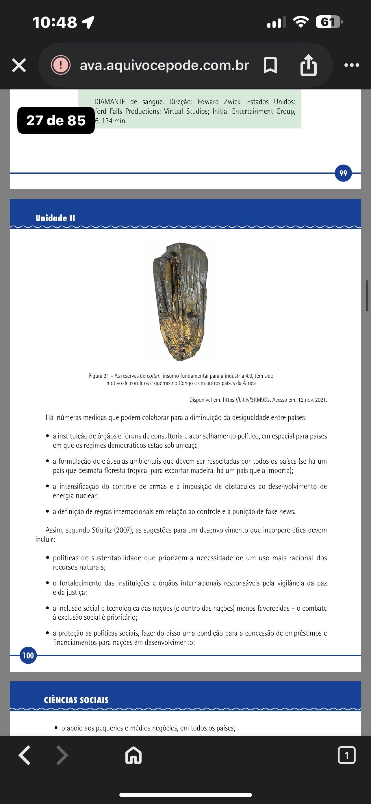 10:48 61 X ! DIAMANTE de sangue. Direção: Edward Zwick. Estados Unidos: ford Falls Productions; Virtual Studios; Initial Entertainment Group, 27 de 85 6. 134 min. 99 Unidade II Figura 31 As reservas de coltan, insumo fundamental para a indústria 4.0, têm sido motivo de conflitos e guerras no Congo e em outros países da África Disponível em: https://bit.ly/3ltM9Da. Acesso em: 12 nov. 2021. Há inúmeras medidas que podem colaborar para a diminuição da desigualdade entre países: a instituição de órgãos e fóruns de consultoria e aconselhamento político, em especial para países em que os regimes democráticos estão sob ameaça; a formulação de cláusulas ambientais que devem ser respeitadas por todos os países (se há um país que desmata floresta tropical para exportar madeira, há um país que a importa); a intensificação do controle de armas e a imposição de obstáculos ao desenvolvimento de energia nuclear; a definição de regras internacionais em relação ao controle e à punição de fake news. Assim, segundo Stiglitz (2007), as sugestões para um desenvolvimento que incorpore ética devem incluir: políticas de sustentabilidade que priorizem a necessidade de um uso mais racional dos recursos naturais; 0 fortalecimento das instituições e órgãos internacionais responsáveis pela vigilância da paz e da justiça; a inclusão social e tecnológica das nações (e dentro das nações) menos favorecidas 0 combate à exclusão social é prioritário; . a proteção às políticas sociais, fazendo disso uma condição para a concessão de empréstimos e financiamentos para nações em desenvolvimento; 100 CIÊNCIAS SOCIAIS 0 apoio aos pequenos e médios negócios, em todos países; 1
