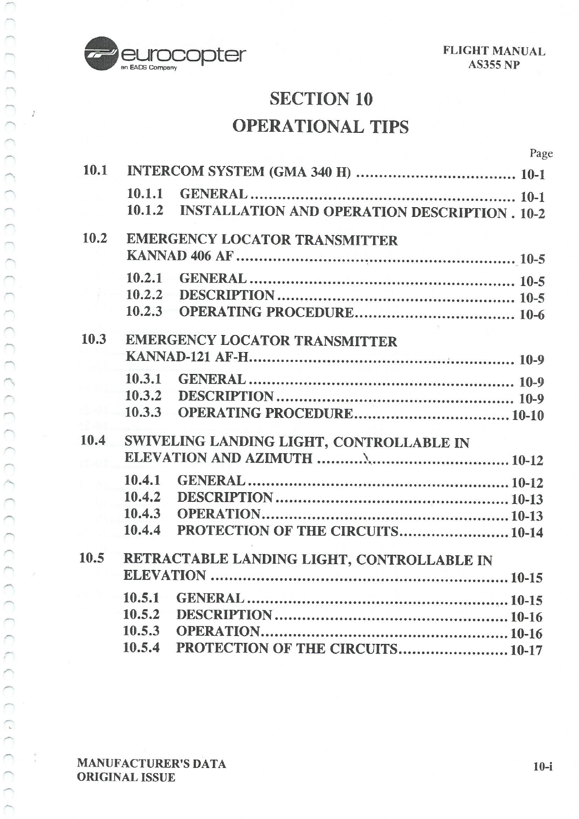 an eurocopter EADS Company FLIGHT MANUAL AS355 NP SECTION 10 OPERATIONAL TIPS Page 10.1 INTERCOM SYSTEM (GMA 340 H) 10-1 10.1.1 GENERAL 10-1 10.1.2 INSTALLATION AND OPERATION DESCRIPTION 10-2 10.2 EMERGENCY LOCATOR TRANSMITTER KANNAD 406 AF 10-5 10.2.1 GENERAL 10-5 10.2.2 DESCRIPTION 10-5 10.2.3 OPERATING PROCEDURE 10-6 10.3 EMERGENCY LOCATOR TRANSMITTER KANNAD-121 AF-H 10-9 10.3.1 GENERAL 10-9 10.3.2 DESCRIPTION 10-9 10.3.3 OPERATING PROCEDURE 10-10 10.4 SWIVELING LANDING LIGHT, CONTROLLABLE IN ELEVATION AND AZIMUTH 10-12 10.4.1 GENERAL 10-12 10.4.2 DESCRIPTION 10-13 10.4.3 OPERATION 10-13 10.4.4 PROTECTION OF THE CIRCUITS 10-14 10.5 RETRACTABLE LANDING LIGHT, CONTROLLABLE IN ELEVATION 10-15 10.5.1 GENERAL 10-15 10.5.2 DESCRIPTION 10-16 10.5.3 OPERATION 10-16 10.5.4 PROTECTION OF THE CIRCUITS 10-17 MANUFACTURER'S DATA 10-i ORIGINAL ISSUEFLIGHT MANUAL AS355 NP an eurocopter EADS Company 10.6 LOCATOR SEARCHLIGHT 10-18 10.6.1 GENERAL 10-18 10.6.2 DESCRIPTION 10-18 10.6.3 OPERATION 10-19 10.7 AIR AMBULANCE INSTALLATION 10-20 10.7.1 GENERAL 10-20 10.7.2 DESCRIPTION 10-20 10.7.3 OPERATING PROCEDURE 10-21 10.8 MULTI FUNCTION DISPLAY (KMD850) 10-23 10.8.1 GENERAL 10-23 10.8.2 DESCRIPTION 10-23 10.8.3 OPERATING PROCEDURE 10-23 10.9 HAILERS 10-24 10.9.1 GENERAL 10-24 10.9.2 DESCRIPTION 10-24 10.10 SCHERMULY FLARES 10-25 10.10.1 GENERAL 10-25 10.10.2 OPERATING PROCEDURE 10-25 10.10.3 CIRCUIT PROTECTION 10-25 10.11 GUIDANCE FOR CARGO SLING OPERATIONS 10-26 10.11.1 PERSONNEL TRAINING 10-26 10.11.2 IMPERATIVE PRE-OPERATIVE CHECKS 10-26 10.11.3 AIRBORNE LOADS 10-27 10.11.4 IN-FLIGHT PRECAUTIONS 10-28 10.11.5 CARGO RING SIZE RULE 10-29 10.12 NOISE REDUCTION 10-30 10.12.1 GENERAL 10-30 10.12.2 OPERATING IN SENSITIVE AREAS 10-30 10 - ii MANUFACTURER'S DATA REVISION 4an eurocopter EADS Company FLIGHT MANUAL AS355 NP Page 10.13 RADIO ALTIMETER (AHV16) 10-32 10.13.1 GENERAL 13-32 10.13.2 DESCRIPTION 13-32 10.13.3 OPERATION 13-34 10.13.3 TEST PROCEDURE 13-35 LIST OF FIGURES Page FIGURE 10 - 1: GMA 340 H AUDIO PANEL 10-1 FIGURE 10 - 2: REMOTE CONTROL SWITCH AND EMERGENCY LOCATOR KANNAD 406 AF 10-5 FIGURE 10 - 3: REMOTE CONTROL SWITCH AND EMERGENCY LOCATOR KANNAD 121 AF-H 10-9 FIGURE 10 - 4: SWIVELING LANDING LIGHT, CONTROLLABLE IN ELEVATION AND AZIMUTH 10-12 FIGURE 10 - 5: RETRACTABLE LANDING LIGHT, CONTROLLABLE IN ELEVATION 10-15 FIGURE 10 - 6: ADDITIONAL LOCATOR SEARCHLIGHT 10-18 FIGURE 10 - 7: AIR AMBULANCE INSTALLATION 10-20 FIGURE 10 - 8: MULTI FUNCTION DISPLAY (KMD850) 10-23 FIGURE 10 - 9: PUBLIC ADDRESS CONTROL UNIT 10-24 FIGURE 10 - 10: CARGO RING 10-29 FIGURE 10 - 11: RADIO ALTIMETER INDICATOR 10-33 DATA 10-iii REVISION 4FLIGHT MANUAL an eurocopter EADS Company AS355 NP 10.1 INTERCOM SYSTEM GMA 340 H 10.1.1 GENERAL The Garmin GMA 340 H intercom system audio panel ensures the following main functions: - intercommunications between pilot, copilot and passengers, - radio-communication microphone and audio selection, - radio-navigation audio selection, - links with other audio inputs (music, public address, ...). The GMA 340 H features a failsafe mode in case the power supply is lost or the unit is inadvertently turned off. MANUFACTURER'S DATA 10 1 ORIGINAL ISSUEFLIGHT MANUAL AS355 NP an eurocopter EADS Company 10.1.2 INSTALLATION AND OPERATION DESCRIPTION 10.1.2.1 Components and location A panel located on the upper part of the center console with all necessary switches for available modes and audio sources selection. Two 2.5A fuses/circuit-breakers located on the overhead fuses/circuit breakers 10α panel. 1 2 3 13 19 18 16 17 340 A M MV.50.2007.00 MIG MIC SENS PA CREW 7 8 4 14 15 12 11 10 9 5 6 MKR ICS COM/NAV Other functions 1. MKR beacon lights 5. RH Pilot / 13. COM receiver 17. Annunciator Passengers volume selectors lights test (pull out to adjust pushbutton passenger volume) 2. MKR audio / 6. RH Pilot ICS 14. COM transmitter 18. Locking screw mute selector squelch level selectors access (VOX) 3. MKR sensitivity 7. LH pilot volume 15. Split COM 19. Photocell indicator selector (automatic dimming) 4. MKR sensitivity 8. LH Pilot ICS 16. NAV systems selector squelch level audio selectors (VOX) 9. Crew isolation mode 10. Pilot isolation mode 11. Public address mode 12. Speaker mode Figure 10-1: GMA 340 H audio panel 10 2 MANUFACTURER'S DATA REVISION 3an eurocopter EADS Company FLIGHT MANUAL AS355 NP 10.1.2.2 Operating procedures Preflight check: Check the following: - GMA 340 unit : ON (copilot volume control turned clockwise past the click), pushbuttons lights ON. - ICS volume : SET for pilot, copilot and passengers. - Radio channel : SET upon request. - Radio volume : SET by selected COM volume control. NOTE The RH inner knob (5) is used for two functions: - IN position: RH pilot ICS volume setting, - OUT position: passengers ICS volume setting. GMA 340 failure or ICS power supply failure: - Turn off GMA 340 H (Turn copilot ICS volume control to full counter-clockwise detent). - Intercom function is lost. - A failsafe circuit connects the RH pilot's headset and microphone directly to COM1. For the optional two pilots IFR version, a "NORM/EMER" ICS back-up selector on LH pilot side allows ICS function with the RH pilot as well as access to COM1 when selected to "EMER". MANUFACTURER'S DATA 10 3 ORIGINAL ISSUEFLIGHT MANUAL AS355 NP an eurocopter EADS Company NOTE In case of ICS failure: - COM1 is the only radio-communication system available. - For VFR or single pilot IFR versions, the RH pilot only has access to COM1. Audio warnings are still available through the pilot headset only. - For the two pilots IFR version, the LH pilot has to select the ICS back-up selector to "EMER" to re-establish ICS and COM1 links. Audio warnings are so still available for the two pilots. Normal operating procedures: The detailed operating procedures are described in the GMA 340 H Pilot's guide. 10 4 DATA ORIGINAL ISSUEFLIGHT MANUAL an eurocopter EADS Company AS355 NP 10.2 EMERGENCY LOCATOR TRANSMITTER KANNAD 406 AF 10.
