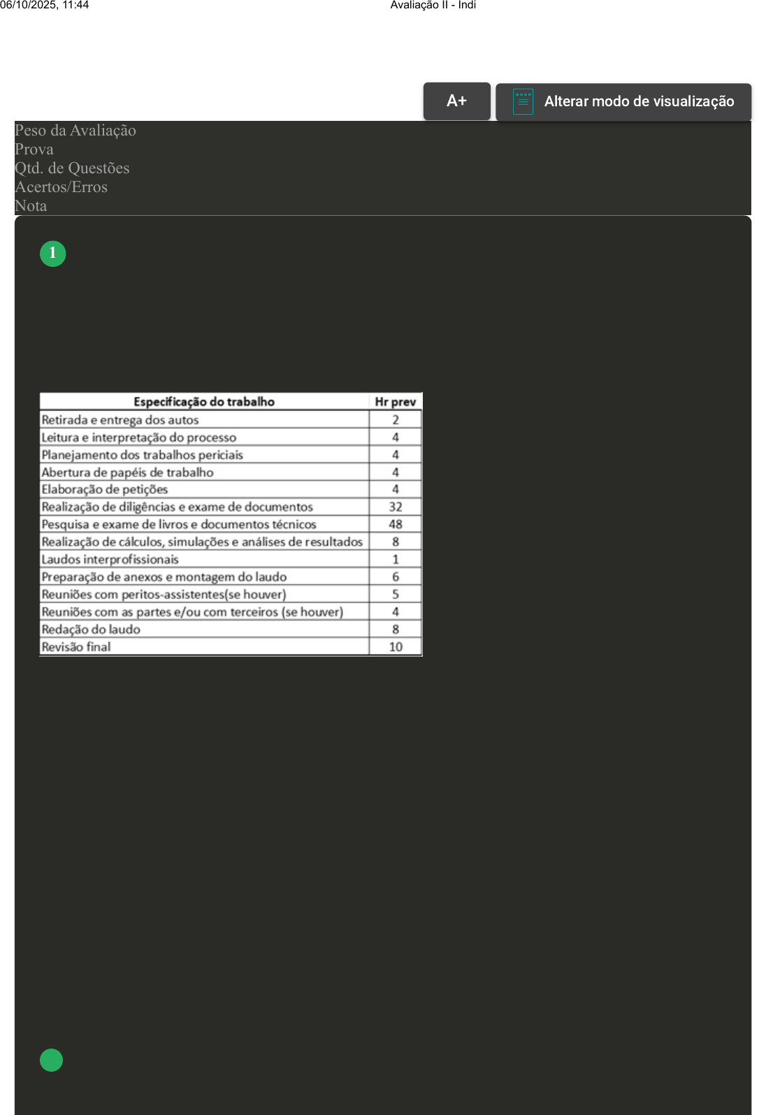 Prova Impressa GABARITO | Avaliação II - Individual (Cod.:1523823) Peso da Avaliação 2,00 Prova 105233743 Qtd. de Questões 10 Acertos/Erros 10/0 Nota 10,00 Considere a situação hipotética: Um contador deverá elaborar seu orçamento de horas periciais. Para tal, ele já estimou a quantidade de horas por especificação de trabalho conforme tabela a seguir: Em sua previsão, calculou, o que considera serem seus custos pessoais, um total de R$10.000,00/mensais. Também mensalmente, seus custos dos materiais de trabalho, denominados material de expediente e de escritório (assinatura de periódicos, gastos com treinamento, internet, material de expediente, deslocamento, informática) totalizam R$ 5.600,00. Sua jornada de trabalho, em média, acumula 180 horas/mês. Sobre o total custo/hora, o contador inclui 15% referente a férias e 20% de margem de risco para a atividade (calculada também sobre o total custo/hora). Para atender a esse trabalho, foram previstos gastos de R$ 1.800,00 com passagens/deslocamentos e o total de R$ 2.600,00 com hospedagem/alimentação. Com base nas informações apresentadas, calcule o valor total orçado para esse trabalho: A O total orçado para honorários foi de R$ 21.144,00. B O total orçado para honorários foi de R$ 16.533,80. C O total orçado para honorários foi de R$ 20.780,00. VOLTAR A+ Alterar modo de visualização 1 06/10/2025, 11:44 Avaliação II - Individual about:blank 1/9 D O total orçado para honorários foi de R$ 19.801,60. Considere a situação hipotética: Ao receber uma demanda importante, o contador precisou elaborar seu orçamento de horas periciais rapidamente. Neste ínterim, detectou que não será necessário viagens, deslocamentos, hospedagens e alimentação extras. Rapidamente, o contador apropriou-se do contexto e dimensionou a quantidade de horas por especificação de trabalho, conforme orientações da NBC PP 01 (R1). Verificou que atua aproximadamente 160 horas por mês e que seus custos totais estão próximos de R$ 15.000,00/mês. Pela necessidade de urgência na entrega, optou por arredondar para 40% sobre o total custo/hora, as previsões de férias, riscos, entre outras contingências. Com base nas informações apresentadas, calcule o valor total orçado para esse trabalho: A O total orçado para honorários foi de R$ 13.875,00. B O total orçado para honorários foi de R$ 21.755,00. 2 06/10/2025, 11:44 Avaliação II - Individual about:blank 2/9 C O total orçado para honorários foi de R$ 19.425,00. D O total orçado para honorários foi de R$ 22.825,00. Na esfera judicial, o parecer técnico serve para subsidiar o juiz e as partes, bem como para analisar de forma técnica e científica o laudo pericial contábil. Na esfera extrajudicial, serve o parecer técnico para subsidiar as partes nas suas tomadas de decisões. E, na esfera arbitral, subsidiará o árbitro e as partes nas suas tomadas de decisão. Com base nas informações apresentadas, analise as afirmações considerando V para verdadeiro e F para falso. ( ) O juiz, se considerar o parecer técnico contábil insuficiente, poderá dispensar o perito e o assistente e recomeçar o processo com outra equipe, bem como novos prazos e negociações. ( ) O parecer técnico é uma peça escrita na qual o contador deve registrar, de forma abrangente, o conteúdo da perícia e particularizar os aspectos e as minudências que envolvam a demanda. ( ) Os casos onde o parecer técnico-contábil for contrário às posições do laudo pericial contábil, o perito-assistente técnico deve fundamentar suas manifestações, registrando, no parecer técnico- contábil, os estudos, as pesquisas, as diligências ou as buscas de elementos de prova necessários para a conclusão dos seus trabalhos. ( ) A legislação vigente aponta que o perito judicial é o único responsável pela oferta de parecer pericial contábil, ou seja, é o único profissional que detém as informações para atuar por meio de trabalho próprio, sua opinião técnica, crítica ou concordante, a respeito do laudo pericial contábil oferecido pelo perito judicial. Assinale a afirmativa que contempla corretamente a sequência: A F, V, V, F. B V, V, V, F. C V, V, F, F. D V, F, F, V. 3 06/10/2025, 11:44 Avaliação II - Individual about:blank 3/9 O planejamento envolve o serviço de preparação de um trabalho, de uma tarefa, com o estabelecimento de métodos convenientes. Sobre a perícia, planejamento é a fase na qual o perito analisa os autos a serem periciados, verifica a existência de documentos necessários para a realização da perícia, ou diligência. Com base no texto apresentado, julgue os conceitos de planejamento de perícia nas afirmativas a seguir: I. A etapa de planejamento tem vários fatores positivos, entre eles, como elaborar um cronograma de execução para atender prazos, avaliar os custos da perícia, verificar a necessidade de equipe técnica. II. A perícia deve ser planejada cuidadosamente, com vista ao cumprimento do prazo, inclusive o da legislação relativa ao laudo pericial ou parecer técnico, sendo o planejamento, a etapa do trabalho na qual o perito estabelecerá as diretrizes e a metodologia a serem aplicadas. III. O planejamento da perícia contábil já tem início com a leitura do processo, momento em que o perito desenvolverá os chamados “papéis de trabalho”, que consiste em transcrever na pasta virtual relativa ao processo aquilo que de mais importante foi identificado quando essa atividade foi desenvolvida nos autos do processo. IV. O trabalho de perícia poderá sofrer alterações do prazo planejado em função de outros compromissos profissionais e particulares do perito. Nesse caso, a cada necessidade de prorrogação, o perito informa ao juiz quanto tempo mais necessita além do planejado, sendo o juiz, obrigado a acatar e adequar o novo prazo ao processo. É correto o que se afirma em: A I, apenas. B I, II e III, apenas. C II e IV, apenas. D