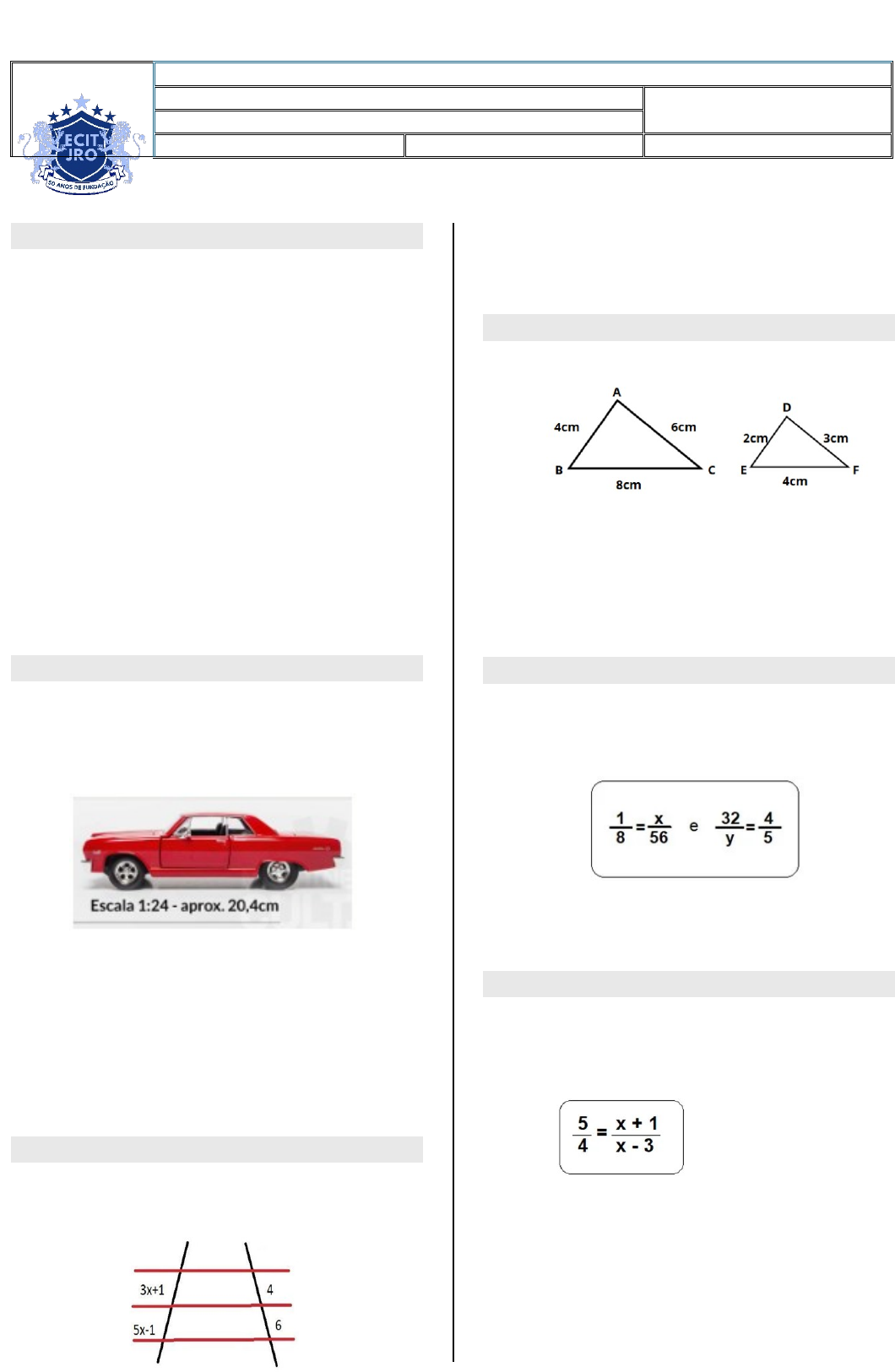 ESCOLA CIDADÃ INTEGRAL TÉCNICA JOSÉ ROLDERICK DE OLIVEIRA PROFESSOR(A): TURMA: ALUNO (A): PERÍODO: 1º DATA: ___/___/2025 DISCIPLINA: Matemática QUESTÃO 01 Os segmentos AB, CD, MN e PQ são proporcionais e tais que AB = 3,2 cm, MN = 6,5 cm e PQ = 26 cm. Qual é a medida do segmento CD? a) 12,8cm b) 0,8 m c) 52,8cm QUESTÃO 02 A miniatura de um carro está representada em escala na figura abaixo; qual é o tamanho real do carro? a)aproximadamente 1,17 m b) aproximadamente 4,9 m c) aproximadamente 5,9 d) aproximadamente 6,0m e) aproximadamente 1,22m QUESTÃO 03 Qual valor de valor de x (o segmento desconhecido): a) 5 b) 6 c) 8 d) 9 e) 10 QUESTÃO 04 Observe os triângulos a seguir. A razão de semelhança entre os triângulos ABC e DEF é igual a a) 1/3. b) 1/2. c) 2. d) 3. e) 1. QUESTÃO 05 Os valores de x e de y nas proporções a seguir são, respectivamente: a) 5 e 28 b) 5 e 40 c) 7 e 40 d) 7 e 56 e) 4 e 30 QUESTÃO 06 Veja o desafio proposto pelo professor de Matemática de Jaílson: Nessa proporção, o valor de x vale a) 4. b) 17. c) 19. d) 27. e) 30. QUESTÃO 07 (Recomposição da aprendizagem) Em uma sala de aula, 3/4 dos alunos possui smartphone. De que outra forma podemos representar essa fração? a) 15% b) 25% c) 34% d) 75% e) 80% QUESTÃO 08 A sombra de um poste vertical, projetada pelo sol sobre um chão plano, mede 12 m. Nesse mesmo instante, a sombra de um bastão vertical de 1 m de altura mede 0,6 m. A altura do poste é: QUESTÃO 09 Pra identificar a congruência dos lados é preciso fazer uma comparação lado a lado e identificar qual caso de congruência aparece: Explique com suas palavras cada caso de congruência de triângulos estudados. ________________________________________________________________________________________________________________________________________________________________________________________________________________________________________________________________________________________________________________________________ QUESTÃO 10 Dê a classificação dos triangulos a seguir: image4.png image5.png image6.png image7.png image8.png image1.png image2.png image3.png